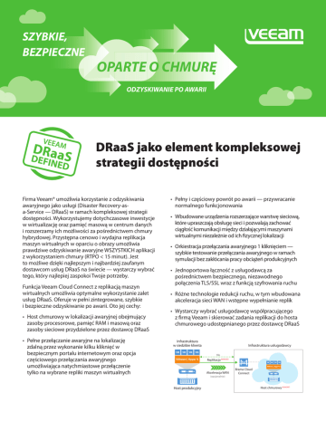 SZYBKIE, BEZPIECZNE OPARTE O CHMURĘ ODZYSKIWANIE PO AWARII DRaaS jako element kompleksowej strategii dostępności Firma Veeam® umożliwia korzystanie z odzyskiwania awaryjnego jako usługi (Disaster Recovery-asa-Service — DRaaS) w ramach kompleksowej strategii dostępności. Wykorzystujemy dotychczasowe inwestycje w wirtualizację oraz pamięć masową w centrum danych i rozszerzamy ich możliwości za pośrednictwem chmury hybrydowej. Przystępna cenowo i wydajna replikacja maszyn wirtualnych w oparciu o obrazy umożliwia prawdziwe odzyskiwanie awaryjne WSZYSTKICH aplikacji z wykorzystaniem chmury (RTPO < 15 minut). Jest to możliwe dzięki najlepszym i najbardziej zaufanym dostawcom usług DRaaS na świecie — wystarczy wybrać tego, który najlepiej zaspokoi Twoje potrzeby. Funkcja Veeam Cloud Connect z replikacją maszyn wirtualnych umożliwia optymalne wykorzystanie zalet usług DRaaS. Oferuje w pełni zintegrowane, szybkie i bezpieczne odzyskiwanie po awarii. Oto jej cechy: • Host chmurowy w lokalizacji awaryjnej obejmujący zasoby procesorowe, pamięć RAM i masową oraz zasoby sieciowe przydzielone przez dostawcę DRaaS • Pełne przełączanie awaryjne na lokalizację zdalną przez wykonanie kilku kliknięć w bezpiecznym portalu internetowym oraz opcja częściowego przełączania awaryjnego umożliwiająca natychmiastowe przełączenie tylko na wybrane repliki maszyn wirtualnych • Pełny i częściowy powrót po awarii — przywracanie normalnego funkcjonowania • Wbudowane urządzenia rozszerzające warstwę sieciową, które upraszczają obsługę sieci i pozwalają zachować ciągłość komunikacji między działającymi maszynami wirtualnymi niezależnie od ich fizycznej lokalizacji • Orkiestracja przełączania awaryjnego 1 kliknięciem — szybkie testowanie przełączania awaryjnego w ramach symulacji bez zakłócania pracy obciążeń produkcyjnych • Jednoportowa łączność z usługodawcą za pośrednictwem bezpiecznego, niezawodnego połączenia TLS/SSL wraz z funkcją szyfrowania ruchu • Różne technologie redukcji ruchu, w tym wbudowana akceleracja sieci WAN i wstępne wypełnianie replik • Wystarczy wybrać usługodawcę współpracującego z firmą Veeam i skierować zadania replikacji do hosta chmurowego udostępnianego przez dostawcę DRaaS Infrastruktura w siedzibie klienta Infrastruktura usługodawcy SSL VMware | Hyper-V Replikacja NOWOŚĆ! VMware | Hyper-V Akceleracja WAN (opcjonalnie) Host produkcyjny Brama Cloud Connect Host chmurowy NOWOŚĆ! SZYBKIE, BEZPIECZNE BACKUP W CHMURZE Veeam Cloud Connect — łatwy backup w chmurze Łatwe, wydajne przesyłanie kopii zapasowych do lokalizacji zewnętrznej (usługodawcy) Reguła 3-2-1 Reguła 3-2-1 mówi, że dane należy przechowywać w trzech egzemplarzach na dwóch różnych nośnikach, w tym na jednym poza siedzibą firmy. Przechowywanie kopii zapasowych na zewnątrz firmy może być kłopotliwe z powodu ograniczonej przepustowości, dynamicznie rosnącej ilości danych oraz braku zasobów niezbędnych do stworzenia i utrzymywania prawdziwego zewnętrznego repozytorium kopii. Funkcja Veeam Cloud Connect sprawia, że regułę 3-2-1 można wdrożyć bez inwestowania środków finansowych i zasobów w dodatkową lokalizację oraz bez zwiększania przepustowości. Wystarczy skorzystać z chmurowego repozytorium kopii zapasowych udostępnianego przez uczestnika programu Veeam Cloud & Service Provider oraz z takich technologii jak wbudowana akceleracja sieci WAN. Firma Veeam® zapewnia wydajne i niezawodne funkcje, które pomagają uniknąć ryzyka katastrofalnej utraty danych. Veeam Cloud Connect daje następujące możliwości: Hosting kopii zapasowych. Kopie zapasowe mogą być przesyłane do zewnętrznego, hostowanego repozytorium chmurowego za pośrednictwem bezpiecznego połączenia SSL — bez potrzeby kupowania dodatkowych licencji Veeam. Pełny wgląd i kontrola. Dane przechowywane w hostowanych repozytoriach kopii zapasowych można wyświetlać i odzyskiwać bezpośrednio z poziomu konsoli operatora. Możliwe jest również bieżące śledzenie wykorzystania repozytoriów i otrzymywanie powiadomień o terminach przedłużenia umowy. Nowoczesna architektura kopii zapasowych. Nasz kompleksowy produkt umożliwia wykorzystanie nowoczesnej technologii backupu firmy Veeam, obejmującej m.in. funkcję powielania kopii zapasowych z wbudowaną akceleracją sieci WAN, ciągły przyrostowy tryb tworzenia kopii i schemat przechowywania GPS (dziadek-ojciec-syn). Kompleksowe szyfrowanie. Wszystkie dane są szyfrowane w źródle (przed opuszczeniem firmowej sieci) oraz podczas transferu i przechowywania. Odbywa się to bez negatywnego wpływu na współczynnik redukcji danych zapewniany przez wbudowane funkcje kompresji i akceleracji sieci WAN. Infrastruktura usługodawcy Infrastruktura w siedzibie klienta Kopia zapasowa Produkcyjna pamięć masowa Podstawowe repozytorium kopii zapasowych SSLNOWOŚĆ! Kopia kopii zapas. Akceleracja WAN (opcjonalnie) Brama Cloud ConnectNOWOŚĆ! Repozytorium chmuroweNOWOŚĆ!