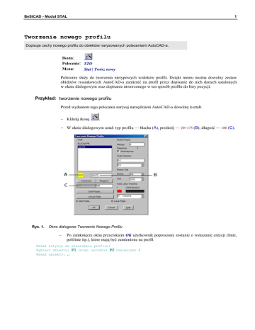 BeStCAD - Moduł STAL 1 Tworzenie nowego profilu Dopisuje cechy nowego profilu do obiektów narysowanych poleceniami AutoCAD-a. Ikona: Polecenie: STO Menu: Stal | Twórz nowy Polecenie służy do tworzenia nietypowych widoków profili. Dzięki niemu można dowolny zestaw obiektów rysunkowych AutoCAD-a zamienić na profil przez dopisanie do nich danych ustalonych w oknie dialogowym oraz dopisanie utworzonego w ten sposób profilu do listy pozycji. Przykład: tworzenie nowego profilu Przed wydaniem tego polecania narysuj narzędziami AutoCAD-a dowolny kształt. − Kliknij ikonę . − W oknie dialogowym ustal: typ profilu — blacha (A), przekrój — 20×175 (B), długość — 186 (C). Rys. 1. Okno dialogowe Tworzenie Nowego Profilu − Po zamknięciu okna przyciskiem OK użytkownik poproszony zostanie o wskazanie entycji (linie, polilinie itp.), które mają być zamienione na profil. Wskaż entycje do stworzenia profilu: Wybierz obiekty: P1 Drugi narożnik P2 znaleziono 8 Wskaż obiekty: ↵ BeStCAD - Moduł STAL Rys. 2. 2 Blacha o dowolnym kształcie Do wybranych obiektów zostaną dopisane dane ustalone w oknie dialogowym, które można będzie automatycznie odczytać, np. przy opisywaniu (polecenie STOP). Pozycja zostanie również dodana do listy pozycji.