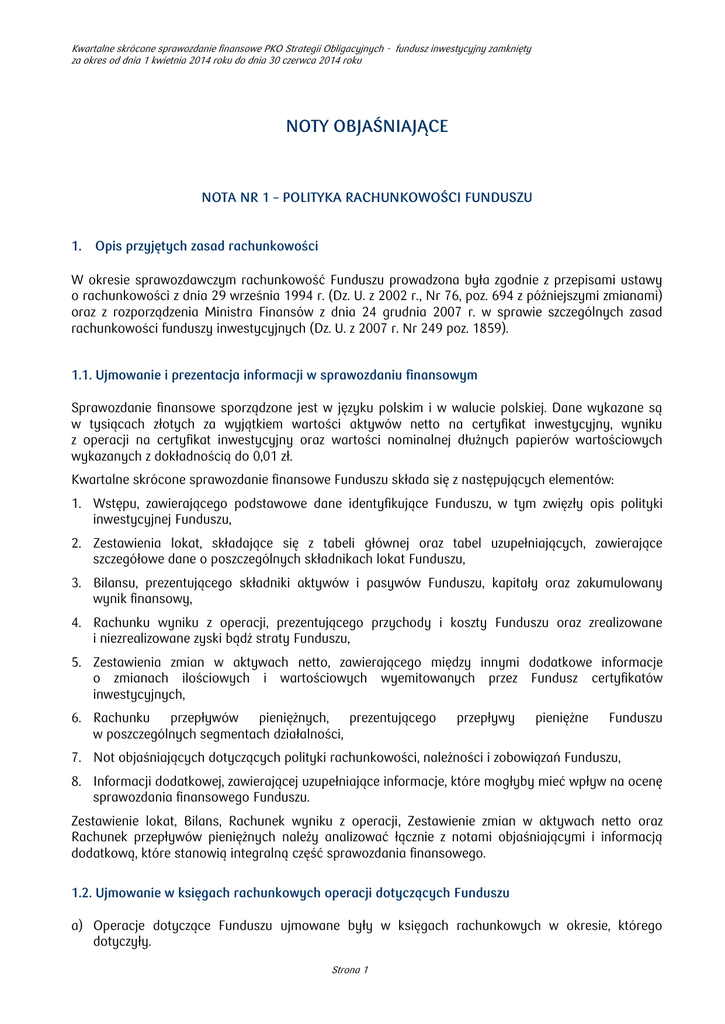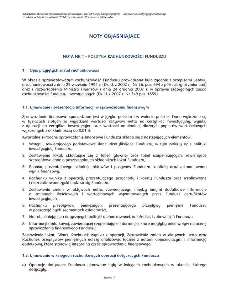 Kwartalne skrócone sprawozdanie finansowe PKO Strategii Obligacyjnych - fundusz inwestycyjny zamknięty za okres od dnia 1 kwietnia 2014 roku do dnia 30 czerwca 2014 roku NOTY OBJAŚNIAJĄCE NOTA NR 1 – POLITYKA RACHUNKOWOŚCI FUNDUSZU 1. Opis przyjętych zasad rachunkowości W okresie sprawozdawczym rachunkowość Funduszu prowadzona była zgodnie z przepisami ustawy o rachunkowości z dnia 29 września 1994 r. (Dz. U. z 2002 r., Nr 76, poz. 694 z późniejszymi zmianami) oraz z rozporządzenia Ministra Finansów z dnia 24 grudnia 2007 r. w sprawie szczególnych zasad rachunkowości funduszy inwestycyjnych (Dz. U. z 2007 r. Nr 249 poz. 1859). 1.1. Ujmowanie i prezentacja informacji w sprawozdaniu finansowym Sprawozdanie finansowe sporządzone jest w języku polskim i w walucie polskiej. Dane wykazane są w tysiącach złotych za wyjątkiem wartości aktywów netto na certyfikat inwestycyjny, wyniku z operacji na certyfikat inwestycyjny oraz wartości nominalnej dłużnych papierów wartościowych wykazanych z dokładnością do 0,01 zł. Kwartalne skrócone sprawozdanie finansowe Funduszu składa się z następujących elementów: 1. Wstępu, zawierającego podstawowe dane identyfikujące Funduszu, w tym zwięzły opis polityki inwestycyjnej Funduszu, 2. Zestawienia lokat, składające się z tabeli głównej oraz tabel uzupełniających, zawierające szczegółowe dane o poszczególnych składnikach lokat Funduszu, 3. Bilansu, prezentującego składniki aktywów i pasywów Funduszu, kapitały oraz zakumulowany wynik finansowy, 4. Rachunku wyniku z operacji, prezentującego przychody i koszty Funduszu oraz zrealizowane i niezrealizowane zyski bądź straty Funduszu, 5. Zestawienia zmian w aktywach netto, zawierającego między innymi dodatkowe informacje o zmianach ilościowych i wartościowych wyemitowanych przez Fundusz certyfikatów inwestycyjnych, 6. Rachunku przepływów pieniężnych, prezentującego w poszczególnych segmentach działalności, przepływy pieniężne Funduszu 7. Not objaśniających dotyczących polityki rachunkowości, należności i zobowiązań Funduszu, 8. Informacji dodatkowej, zawierającej uzupełniające informacje, które mogłyby mieć wpływ na ocenę sprawozdania finansowego Funduszu. Zestawienie lokat, Bilans, Rachunek wyniku z operacji, Zestawienie zmian w aktywach netto oraz Rachunek przepływów pieniężnych należy analizować łącznie z notami objaśniającymi i informacją dodatkową, które stanowią integralną część sprawozdania finansowego. 1.2. Ujmowanie w księgach rachunkowych operacji dotyczących Funduszu a) Operacje dotyczące Funduszu ujmowane były w księgach rachunkowych w okresie, którego dotyczyły. Strona 1 Kwartalne skrócone sprawozdanie finansowe PKO Strategii Obligacyjnych - fundusz inwestycyjny zamknięty za okres od dnia 1 kwietnia 2014 roku do dnia 30 czerwca 2014 roku b) Nabycie albo zbycie składników lokat przez Fundusz ujmowane było w księgach rachunkowych w dacie zawarcia umowy. c) Nabyte składniki lokat ujmowane były w księgach rachunkowych według ceny nabycia uwzględniającej koszty związane z ich nabyciem, w szczególności prowizje maklerskie. Składnikom lokat nabytym nieodpłatnie została przypisana cena nabycia równa zeru. d) Składnikom lokat otrzymanym w zamian za inne składniki została przypisana cena nabycia wynikająca z ceny nabycia składników lokat wymienionych i ewentualnych dopłat lub otrzymanych przychodów pieniężnych. e) Dniem wprowadzenia do ksiąg zmiany kapitału wpłaconego był dzień wydania certyfikatów inwestycyjnych. f) Dniem wprowadzenia do ksiąg zmiany kapitału wypłaconego był dzień dokonania przez KDPW zapisu wykupu certyfikatów. g) Zysk lub strata ze zbycia lokat wyliczana była metodą HIFO (najdroższe sprzedaje się jako pierwsze), polegającą na przypisaniu sprzedanym składnikom najwyższej ceny nabycia, a w przypadku składników wycenianych w wysokości skorygowanej ceny nabycia, oszacowanej przy zastosowaniu efektywnej stopy procentowej, najwyższej bieżącej wartości księgowej. h) Operacje dotyczące Funduszu ujmowane były w walucie, w której zostały wyrażone, a także w walucie polskiej po przeliczeniu według średniego kursu wyliczonego dla danej waluty przez Narodowy Bank Polski na dzień ujęcia tych operacji w księgach rachunkowych Funduszu. i) Naliczone przychody Funduszu obejmują w szczególności: przychody odsetkowe oraz dodatnie saldo różnic kursowych powstałe w związku z wyceną środków pieniężnych, należności oraz zobowiązań w walutach obcych. j) Przychody odsetkowe od dłużnych papierów wartościowych, wycenianych w wartości godziwej, naliczane były zgodnie z zasadami ustalonymi dla tych papierów wartościowych przez emitenta. k) Koszty operacyjne Funduszu obejmują w szczególności: wynagrodzenie stałe i zmienne Towarzystwa za zarządzanie, wynagrodzenie depozytariusza, koszty badania i przeglądu sprawozdań finansowych, koszty, koszty sponsora i animatora emisji, KDPW, GPW, koszty organizacji i obsługi posiedzeń Zgromadzenia Inwestorów i Rady Inwestorów, koszty systemów informatycznych, koszty odsetkowe oraz ujemne saldo różnic kursowych powstałe w związku z wyceną środków pieniężnych, należności oraz zobowiązań w walutach obcych. W księgach Funduszu w każdym Dniu Wyceny tworzona była rezerwa na wynagrodzenie stałe i zmienne Towarzystwa za zarządzanie oraz na inne koszty, które zgodnie ze Statutem są pokrywane przez Fundusz. Płatności z tytułu kosztów operacyjnych zmniejszały uprzednio utworzoną rezerwę.. 1.3. Metody wyceny aktywów, z uwzględnieniem stosowanych metod klasyfikacji i wyceny składników lokat oraz zobowiązań Funduszu, aktywów netto i wyniku z operacji Ustalanie wartości aktywów netto oraz wartości aktywów netto na certyfikat inwestycyjny a) W każdym dniu wyceny wyceniane były aktywa Funduszu oraz ustalane: i) wartość aktywów netto Fundusz