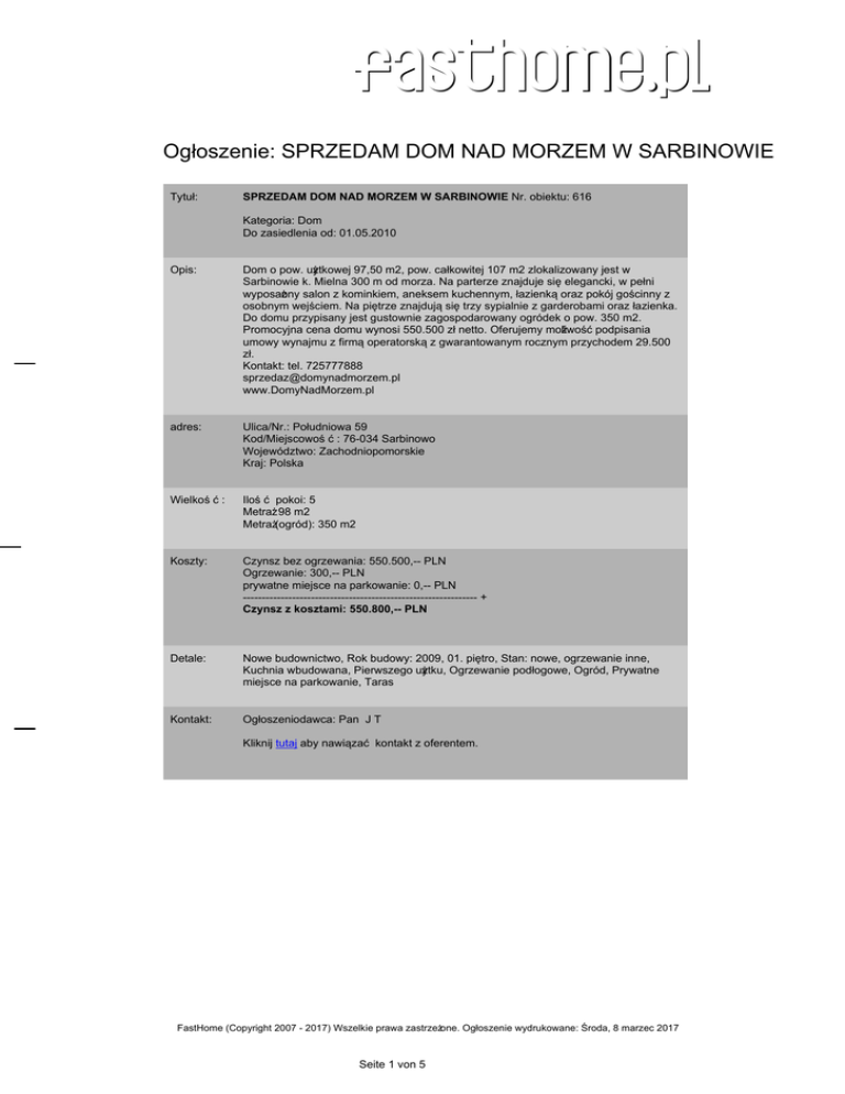 FastHome.pl Ogłoszenie: SPRZEDAM DOM NAD MORZEM W SARBINOWIE Tytuł: SPRZEDAM DOM NAD MORZEM W SARBINOWIE Nr. obiektu: 616 Kategoria: Dom Do zasiedlenia od: 01.05.2010 Opis: Dom o pow. użytkowej 97,50 m2, pow. całkowitej 107 m2 zlokalizowany jest w Sarbinowie k. Mielna 300 m od morza. Na parterze znajduje się elegancki, w pełni wyposażony salon z kominkiem, aneksem kuchennym, łazienką oraz pokój gościnny z osobnym wejściem. Na piętrze znajdują się trzy sypialnie z garderobami oraz łazienka. Do domu przypisany jest gustownie zagospodarowany ogródek o pow. 350 m2. Promocyjna cena domu wynosi 550.500 zł netto. Oferujemy możliwość podpisania umowy wynajmu z firmą operatorską z gwarantowanym rocznym przychodem 29.500 zł. Kontakt: tel. 725777888 [email protected] www.DomyNadMorzem.pl adres: Ulica/Nr.: Południowa 59 Kod/Miejscowoś ć : 76-034 Sarbinowo Województwo: Zachodniopomorskie Kraj: Polska Wielkoś ć : Iloś ć pokoi: 5 Metraż: 98 m2 Metraż (ogród): 350 m2 Koszty: Czynsz bez ogrzewania: 550.500,-- PLN Ogrzewanie: 300,-- PLN prywatne miejsce na parkowanie: 0,-- PLN -------------------------------------------------------------- + Czynsz z kosztami: 550.800,-- PLN Detale: Nowe budownictwo, Rok budowy: 2009, 01. piętro, Stan: nowe, ogrzewanie inne, Kuchnia wbudowana, Pierwszego użytku, Ogrzewanie podłogowe, Ogród, Prywatne miejsce na parkowanie, Taras Kontakt: Ogłoszeniodawca: Pan J T Kliknij tutaj aby nawiązać kontakt z oferentem. FastHome (Copyright 2007 - 2017) Wszelkie prawa zastrzeż one. Ogłoszenie wydrukowane: Środa, 8 marzec 2017 Seite 1 von 5 FastHome.pl Zewnątrz: FastHome (Copyright 2007 - 2017) Wszelkie prawa zastrzeż one. Ogłoszenie wydrukowane: Środa, 8 marzec 2017 Seite 2 von 5 FastHome.pl Kuchnia: FastHome (Copyright 2007 - 2017) Wszelkie prawa zastrzeż one. Ogłoszenie wydrukowane: Środa, 8 marzec 2017 Seite 3 von 5 FastHome.pl Otoczenie: FastHome (Copyright 2007 - 2017) Wszelkie prawa zastrzeż one. Ogłoszenie wydrukowane: Środa, 8 marzec 2017 Seite 4 von 5 FastHome.pl Pokój_gościnny: FastHome (Copyright 2007 - 2017) Wszelkie prawa zastrzeż one. Ogłoszenie wydrukowane: Środa, 8 marzec 2017 Seite 5 von 5