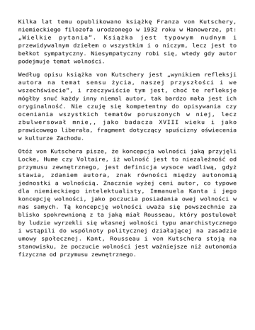Kilka lat temu opublikowano książkę Franza von Kutschery, niemieckiego filozofa urodzonego w 1932 roku w Hanowerze, pt: „Wielkie pytania”. Książka jest typowym nudnym i przewidywalnym dziełem o wszystkim i o niczym, lecz jest to bełkot sympatyczny. Niesympatyczny robi się, wtedy gdy autor podejmuje temat wolności. Według opisu książka von Kutschery jest „wynikiem refleksji autora na temat sensu życia, naszej przyszłości i we wszechświecie”, i rzeczywiście tym jest, choć te refleksje mógłby snuć każdy inny niemal autor, tak bardzo mała jest ich oryginalność. Nie czuję się kompetentny do opisywania czy oceniania wszystkich tematów poruszonych w niej, lecz zbulwersował mnie,, jako badacza XVIII wieku i jako prawicowego liberała, fragment dotyczący spuścizny oświecenia w kulturze Zachodu. Otóż von Kutschera pisze, że koncepcja wolności jaką przyjęli Locke, Hume czy Voltaire, iż wolność jest to niezależność od przymusu zewnętrznego, jest definicja wysoce wadliwą, gdyż stawia, zdaniem autora, znak równości między autonomią jednostki a wolnością. Znacznie wyżej ceni autor, co typowe dla niemieckiego intelektualisty, Immanuela Kanta i jego koncepcję wolności, jako poczucia posiadania owej wolności w nas samych. Tą koncepcję wolności uważa się powszechnie za blisko spokrewnioną z ta jaką miał Rousseau, który postulował by ludzie wyrzekli się własnej wolności typu anarchistycznego i wstąpili do wspólnoty politycznej działającej na zasadzie umowy społecznej. Kant, Rousseau i von Kutschera stoją na stanowisku, że poczucie wolności jest ważniejsze niż autonomia fizyczna od przymusu zewnętrznego. Jest to skandaliczne przekłamanie umożliwiające budowania gmachów tyranii opartej na zgodzie skołowanych ludzi, którzy czują się wolni i pod butem, który ich przygniata. Zapewne i w Korei Północnej niektórzy czują się wolni, lecz nie sposób regulować mechanizmów społecznych za pomocą subiektywnego poczucia wolności jednostki. Liberalna koncepcja wolności jako autonomii jednostki jest prostsza, co może drażnić niemieckich intelektualistów, mających post-kantowską zresztą skłonność do opisywania zjawisk przeintelektualizowanym, przeciążonym subiektywizmem i bełkotliwym językiem, lecz ta liberalna koncepcja dotyczy czegoś konkretnego widocznego gołym okiem. Lepiej obserwować, czy ktoś nie zagraża materialnie naszej swobodzie, niż znaleźć się nagle wśród tłumu, który czuje się wolny nawet w ustroju totalitarnym; zapewne wtedy szefowie tego tłumu, będą nam tłumaczyć, ze i my powinniśmy skupić się na pielęgnowaniu naszego wewnętrznego abstrakcyjnego poczucia wolności niż domagać rzeczywistych swobód. Lessing, który walczył o liberalne społeczeństwo przewraca się w grobie…