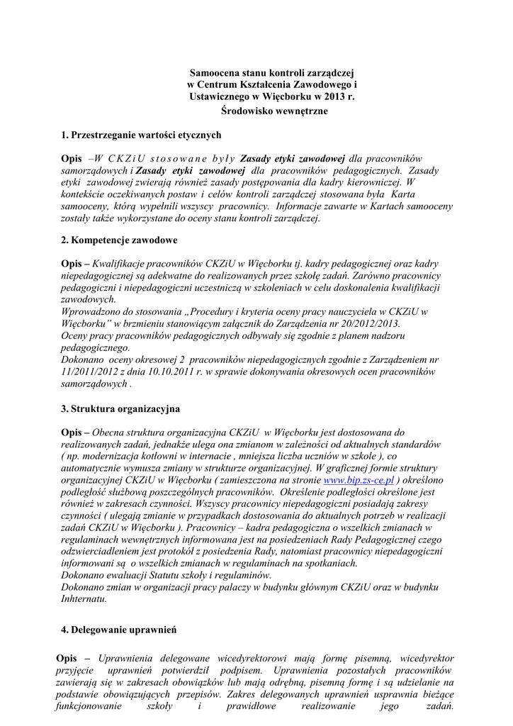 Samoocena stanu kontroli zarządczej w Centrum Kształcenia Zawodowego i Ustawicznego w Więcborku w 2013 r. Środowisko wewnętrzne 1. Przestrzeganie wartości etycznych Opis –W C K Z i U s t o s o w a n e b y ł y Zasady etyki zawodowej dla pracowników samorządowych i Zasady etyki zawodowej dla pracowników pedagogicznych. Zasady etyki zawodowej zwierają również zasady postępowania dla kadry kierowniczej. W kontekście oczekiwanych postaw i celów kontroli zarządczej stosowana była Karta samooceny, którą wypełnili wszyscy pracownicy. Informacje zawarte w Kartach samooceny zostały także wykorzystane do oceny stanu kontroli zarządczej. 2. Kompetencje zawodowe Opis – Kwalifikacje pracowników CKZiU w Więcborku tj. kadry pedagogicznej oraz kadry niepedagogicznej są adekwatne do realizowanych przez szkołę zadań. Zarówno pracownicy pedagogiczni i niepedagogiczni uczestniczą w szkoleniach w celu doskonalenia kwalifikacji zawodowych. Wprowadzono do stosowania „Procedury i kryteria oceny pracy nauczyciela w CKZiU w Więcborku” w brzmieniu stanowiącym załącznik do Zarządzenia nr 20/2012/2013. Oceny pracy pracowników pedagogicznych odbywały się zgodnie z planem nadzoru pedagogicznego. Dokonano oceny okresowej 2 pracowników niepedagogicznych zgodnie z Zarządzeniem nr 11/2011/2012 z dnia 10.10.2011 r. w sprawie dokonywania okresowych ocen pracowników samorządowych . 3. Struktura organizacyjna Opis – Obecna struktura organizacyjna CKZiU w Więcborku jest dostosowana do realizowanych zadań, jednakże ulega ona zmianom w zależności od aktualnych standardów ( np. modernizacja kotłowni w internacie , mniejsza liczba uczniów w szkole ), co automatycznie wymusza zmiany w strukturze organizacyjnej. W graficznej formie struktury organizacyjnej CKZiU w Więcborku ( zamieszczona na stronie www.bip.zs-ce.pl ) określono podległość służbową poszczególnych pracowników. Określenie podległości określone jest również w zakresach czynności. Wszyscy pracownicy niepedagogiczni posiadają zakresy czynności ( ulegają zmianie w przypadkach dostosowania do aktualnych potrzeb w realizacji zadań CKZiU w Więcborku ). Pracownicy – kadra pedagogiczna o wszelkich zmianach w regulaminach wewnętrznych informowana jest na posiedzeniach Rady Pedagogicznej czego odzwierciadleniem jest protokół z posiedzenia Rady, natomiast pracownicy niepedagogiczni informowani są o wszelkich zmianach w regulaminach na spotkaniach. Dokonano ewaluacji Statutu szkoły i regulaminów. Dokonano zmian w organizacji pracy palaczy w budynku głównym CKZiU oraz w budynku Inhternatu. 4. Delegowanie uprawnień Opis – Uprawnienia delegowane wicedyrektorowi mają formę pisemną, wicedyrektor przyjęcie uprawnień potwierdził podpisem. Uprawnienia pozostałych pracowników zawierają się w zakresach obowiązków lub mają odrębną, pisemną formę i są udzielanie na podstawie obowiązujących przepisów. Zakres delegowanych uprawnień usprawnia bieżące funkcjonowanie szkoły i prawidłowe realizowanie jego zadań. B. Cele i zarządzanie ryzykiem 5. Misja Opis – CKZiU w Więcborku posiada misję sporządzoną w formie pisemnej pod nazwą „Strategia Rozwoju Zespołu Szkół – Centrum Edukacyjne w Więcborku w latach 20102015” i uchwaloną przez Radę Pedagogiczną. Misja została opracowana w porozumieniu z nauczycielami. 6. Określanie celów i zadań, monitorowanie i ocena ich realizacji Opis – Długoterminowe cele działania CKZiU w Więcborku określone są w „Strategii Rozwoju Zespołu Szkół – Centrum Edukacyjne w Więcborku w latach 2010-2015” uchwalonej przez Radę Pedagogiczną. Cele ogólne i zadania szkoły określone w ustawie o systemie oświaty oraz przepisach wykonawczych wydanych na jej podstawie, a także w statucie CKZiU w Więcborku znajdują odzwierciedlenie (i uszczegółowienie) w planach pracy. Zadania szkoły określone w planach pracy, realizowane przez poszczególnych nauczycieli, podlegają monitorowaniu i ocenie w procesie nadzoru pedagogicznego. Ocena realizacji zadań szkoły znajduje odzwierciedlenie w sprawozdaniach. Oceniając realizację celów i zadań szkoły uwzględnia się kryterium oszczędności, efektywności i skuteczności. Ocena realizacji zadań statutowych szkoły odbywa się 2 razy w roku na posiedzeniach Rady Pedagogicznej. 7. Identyfikacja ryzyka Opis – Identyfikacja ryzyka w odniesieniu do celów i zadań CKZiU w Więcborku odbywać się będzie raz w roku, w oparciu o zarządzenie dyrektora w sprawie zarządzania ryzykiem. Proces identyfikacji ryzyka jest dokumentowany. 8. Analiza ryzyka Opis – Zidentyfikowane ryzyko poddawane będzie analizie i ocenie w celu ustalenia sposobów jego zmniejszania do poziomu akceptowalnego. Określa się przyczyny i skutki zidentyfikowanych ryzyk oraz poziom ryzyka akceptowalnego. Najbliższa analiza ryzyka dokonana zostanie przez powołany Zespół w miesiącu czerwiec 2014 r. 9. Reakcja na ryzyko Opis – Ustalone zostaną sposoby niwelowania ewentualnych skutków ryzyka w odniesieniu do poszczególnych ryzyk Z wynikami analizy zapoznawani są wszyscy pracownicy, co potwierdzają podpisem. W celu ograniczenia ryzyka podejmowane będą działania adekwatne do zaistniałych ryzyk. Dokonano remontu instalacji elektrycznej w Sali 22, remontu oświetlenia w Sali 27. Po konsultacji z Dyrektorem LO w Więcborku oraz Powiatową Strażą Pożarną wytyczono drogę pożarową na placu przed budynkiem głównym szkoły. Przeprowadzono prace remontowe zmieniające przeznaczenie pomieszczeń pod dużą salą gimnastyczną na sale do gimnastyki i siłownię uwzględniając również zalecenia pokontrolne straży pożarnej. Określono sposób realizacji zaleceń pokontrolnych PIS w stołówce szkolnej C. Mechanizmy kontroli 10. Dokumentowanie systemu kontroli zarządczej Opis - Działania kontrolne realizowane w ramach funkcji kierowniczych i nadzoru opisane są w planie nadzoru pedagogiczne