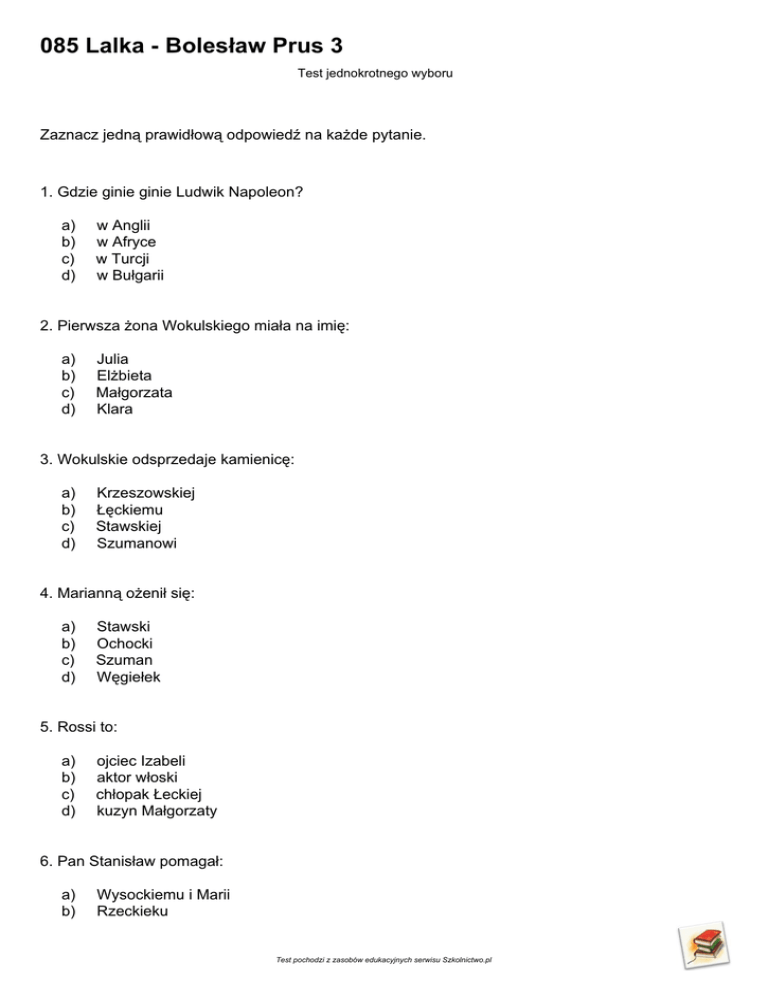 085 Lalka - Bolesław Prus 3 Test jednokrotnego wyboru Zaznacz jedną prawidłową odpowiedź na każde pytanie. 1. Gdzie ginie ginie Ludwik Napoleon? a) b) c) d) w Anglii w Afryce w Turcji w Bułgarii 2. Pierwsza żona Wokulskiego miała na imię: a) b) c) d) Julia Elżbieta Małgorzata Klara 3. Wokulskie odsprzedaje kamienicę: a) b) c) d) Krzeszowskiej Łęckiemu Stawskiej Szumanowi 4. Marianną ożenił się: a) b) c) d) Stawski Ochocki Szuman Węgiełek 5. Rossi to: a) b) c) d) ojciec Izabeli aktor włoski chłopak Łeckiej kuzyn Małgorzaty 6. Pan Stanisław pomagał: a) b) Wysockiemu i Marii Rzeckieku Test pochodzi z zasobów edukacyjnych serwisu Szkolnictwo.pl c) d) Lisieckiemu Stawskiemu 7. Jakie zwierzątko ma Stawska? a) b) c) d) papuge chomika kanarka wiewiórkę 8. Narzeczona barona Dalskiego to: a) b) c) d) Izabela Łęcka Helena Stawska Ewelina Janocka Małgorzata Wokulska 9. Kto był "starym subiektem"? : a) b) c) d) Wokulski Łęcki Rzecki Stawski 10. Wokulski gdy umarła mu żona: a) b) c) d) wyjechał do Turcji pracował w sklepie zajął się dziećmi popełnił samobójstwo 11. Florentyna yo a) b) c) d) kuzynka Tomasza siostra Tomasza przyjaciółką Izabeli kuzynka Izabeli 12. Co się stało z Małgorzatą po śmierci Jana Mincla? a) b) c) d) wyszła za mąż za Wokulskiego wyszła za maż za Rzeckiego wstąpiła do klasztoru wyjechała z kraju 13. Izabela kieruje sama swoim życiem. Test pochodzi z zasobów edukacyjnych serwisu Szkolnictwo.pl a) b) Fałsz Prawda 14. Ciotka Rzeckiego miała na imię: a) b) c) d) Helena Izabela Zuzanna Kazimiera 15. Kto poleca Wokulskiemu usługi Węgiełka? a) b) c) d) Rzecki Prezesowa Zasławska Proboszcz Łęcki 16. Pies Rzeckiego to: a) b) c) d) owczarek niemiecki mastif neapolitański pudel terrier Test pochodzi z zasobów edukacyjnych serwisu Szkolnictwo.pl