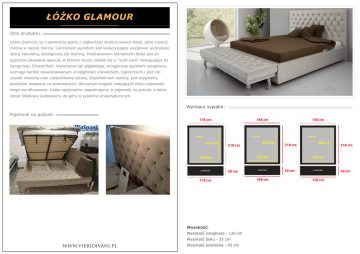 Łóżko glamour Opis produktu: Łóżko Glamour, to z pewnością jedno z najbardziej ekskluzywnych łóżek, jakie znaleźć można w naszej ofercie. Centralnym punktem jest klasycyzujące wezgłowie wyścielane skórą naturalną, ekologiczną lub tkaniną. Podstawowym elementem łóżka jest eleganckie pikowanie oparcia, w którym szycie układa się w “wzór karo” nawiązujący do kanap typu Chesterfield. Wykonanie tak głębokiego, wciąganego guzikami wezgłowia, wymaga bardzo zaawansowanych umiejętności krawieckich, tapicerskich i jest niezwykle mozolną oraz czasochłonną sztuką. Dopełnieniem kolekcji jest oryginalny podnóżek osadzony na drewnianych, tłoczonych nogach nadających łóżku odpowiedniego wyrafinowania. Łóżko opcjonalnie zaopatrujemy w pojemnik na pościel, a także stelaż klepkowy podnoszony do góry w systemie pneumatycznym. Wymiary sypialni: Pojemnik na pościel: 198 cm 178 cm materac materac 200 cm 218 cm podnóżek materac 200 cm 218 cm 180 cm 160 cm 50 cm 178 cm Wysokość: Wysokość wezgłowia - 120 cm Wysokość boku - 33 cm www.vieridivani.pl 158 cm Wysokość podnóżka - 42 cm podnóżek 198 cm 200 cm 218 cm 140 cm 50 cm podnóżek 158 cm 50 cm