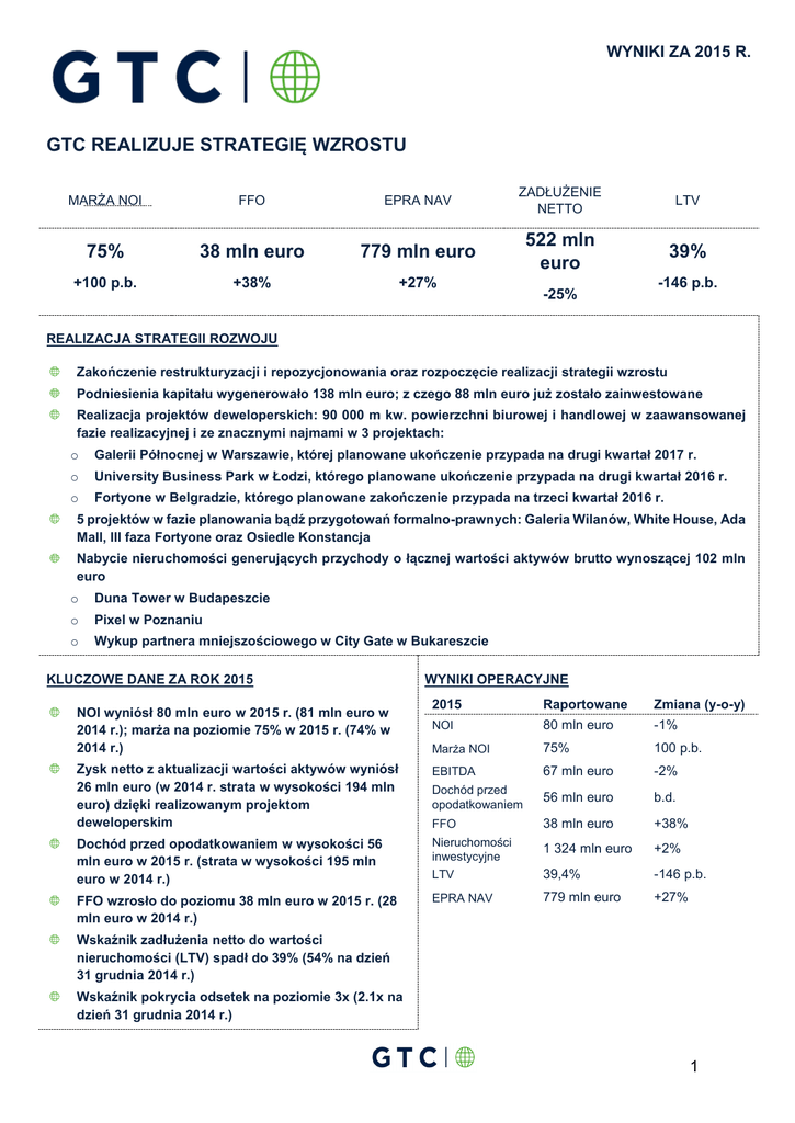 WYNIKI ZA 2015 R. GTC REALIZUJE STRATEGIĘ WZROSTU MARŻA NOI FFO EPRA NAV ZADŁUŻENIE NETTO LTV 75% 38 mln euro 779 mln euro 522 mln euro 39% +100 p.b. +38% +27% -25% -146 p.b. REALIZACJA STRATEGII ROZWOJU Zakończenie restrukturyzacji i repozycjonowania oraz rozpoczęcie realizacji strategii wzrostu Podniesienia kapitału wygenerowało 138 mln euro; z czego 88 mln euro już zostało zainwestowane Realizacja projektów deweloperskich: 90 000 m kw. powierzchni biurowej i handlowej w zaawansowanej fazie realizacyjnej i ze znacznymi najmami w 3 projektach: o Galerii Północnej w Warszawie, której planowane ukończenie przypada na drugi kwartał 2017 r. o University Business Park w Łodzi, którego planowane ukończenie przypada na drugi kwartał 2016 r. o Fortyone w Belgradzie, którego planowane zakończenie przypada na trzeci kwartał 2016 r. 5 projektów w fazie planowania bądź przygotowań formalno-prawnych: Galeria Wilanów, White House, Ada Mall, III faza Fortyone oraz Osiedle Konstancja Nabycie nieruchomości generujących przychody o łącznej wartości aktywów brutto wynoszącej 102 mln euro o Duna Tower w Budapeszcie o Pixel w Poznaniu o Wykup partnera mniejszościowego w City Gate w Bukareszcie KLUCZOWE DANE ZA ROK 2015 WYNIKI OPERACYJNE NOI wyniósł 80 mln euro w 2015 r. (81 mln euro w 2014 r.); marża na poziomie 75% w 2015 r. (74% w 2014 r.) 2015 Raportowane Zmiana (y-o-y) NOI 80 mln euro -1% Marża NOI 75% 100 p.b. Zysk netto z aktualizacji wartości aktywów wyniósł 26 mln euro (w 2014 r. strata w wysokości 194 mln euro) dzięki realizowanym projektom deweloperskim EBITDA 67 mln euro -2% Dochód przed opodatkowaniem 56 mln euro b.d. FFO 38 mln euro +38% Dochód przed opodatkowaniem w wysokości 56 mln euro w 2015 r. (strata w wysokości 195 mln euro w 2014 r.) Nieruchomości inwestycyjne 1 324 mln euro +2% LTV 39,4% -146 p.b. FFO wzrosło do poziomu 38 mln euro w 2015 r. (28 mln euro w 2014 r.) EPRA NAV 779 mln euro +27% Wskaźnik zadłużenia netto do wartości nieruchomości (LTV) spadł do 39% (54% na dzień 31 grudnia 2014 r.) Wskaźnik pokrycia odsetek na poziomie 3x (2.1x na dzień 31 grudnia 2014 r.) 1 PORTFEL NIERUCHOMOŚCI Zakończenie Belgradzie budowy FFO biurowca Fortyone LTV w Nabycie biurowca Duna Tower 1 293 mln euro Nabycie biurowca Pixel 54.0% 90 000 m kw. powierzchni biurowej i handlowej w fazie realizacji w trzech projektach 107 000 m kw. powierzchni biurowej i handlowej nowowynajętej lub z odnowionymi umowami najmu 1 324 mln euro -146 p.b. 38 mln euro 28 mln euro Wskaźnik wynajęcia na poziomie 92% 39.4% 698 mln euro 522 mln euro +38% Całkowita wartość nieruchomości wyniosła 1 324 mln euro na dzień 31 grudnia 2015 r. 2 014 2014 2015 2 015 Całkowita wartość nieruchomości Dług netto LTV „Rok 2015 był dla spółki GTC rokiem pełnym wyzwań, ale i sukcesów. W historii naszej działalności był to rok przełomowy. Po przeprowadzeniu trudnego, lecz jednak zakończonego sukcesem programu restrukturyzacji wprowadziliśmy istotne zmiany strategiczne i dokonaliśmy repozycjonowania spółki. GTC odzyskało pozycję kluczowego gracza, który generuje zysk i dokonuje udanych akwizycji na rynkach w regionie Europy Środkowo-Wschodniej i Południowo-Wschodniej” – powiedział Thomas Kurzmann, prezes zarządu GTC. „Rok 2015 był dla nas czasem intensywnej pracy nad naszym portfelem nieruchomości, dzięki czemu udało nam się utrzymać wskaźnik najmu na poziomie 92% oraz przyspieszyć realizację inwestycji i najmu naszych kluczowych projektów: Galerii Północnej w Warszawie, drugiego etapu University Business Park Office w Łodzi i drugiego etapu Fortyone w Belgradzie o łącznej wartości 200 milionów euro. Dzięki środkom uzyskanym w pomyślnie zakończonym procesie podniesienia kapitału udało nam się ponownie wkroczyć na zdefiniowaną w naszej strategii ścieżkę zakupów, finalizując trzy transakcje o łącznej wartości 102 mln euro. Pozytywne zmiany w obszarze naszej działalności operacyjnej przełożyły się także na solidne wyniki finansowe za rok 2015. W 2016 roku naszym celem będzie poprawa efektywności naszego portfela aktywów generujących przychody oraz zakończenie projektów deweloperskich będących w fazie realizacji. Zgodnie z przyjętą strategią wzrostu, zamierzamy rozwijać nasze portfolio poprzez nabywanie generujących przychody nieruchomości oraz realizację nowych projektów deweloperskich na naszych kluczowych rynkach” – dodał Thomas Kurzmann. WYNIKI FINANSOWE Całkowite przychody wyniosły 117 mln euro w 2015 r. w porównaniu z 124 mln euro w 2014 r., głównie w wyniku sprzedaży niektórych nieruchomości, jak również spowolnienia tempa sprzedaży nieruchomości mieszkaniowych ze względu na znaczne zmniejszenie dostępnych zapasów. NOI wyniósł 80 mln euro w 2015 r. w porównaniu z 81 mln euro w 2014 r., głównie w wyniku sprzedaży Centrum Biurowego Kazimierz, Galerii Buzau, Jarosova i Avenue Mall Osijek. Marża NOI wzrosła w 2015 r. do 75% w porównaniu z 74% w 2014 r. Ukończenie nowych projektów i niedawne akwizycje będą miały wpływ na wzrost NOI w 2016 r. Koszty administracyjne, wyłączając wpływ rezerwy na koszty programu motywacyjnego, spadły do 10 mln euro w 2015 r. głównie dzięki zwiększeniu efektywności kosztowej. Rozpoznano koszty z tytułu wyceny rynkowej programu akcji fantomowych w wysokości 1 mln euro w 2015 r. wobec przychodów w wysokości 3 mln euro w 2014 r. Zysk netto z aktualizacji wyceny wartości nieruchomości inwestycyjnych i projektów mieszkaniowych wyniósł 26 mln euro w 2015 r. wobec straty netto 194 mln euro w 2014 r., głównie dzięki projektom deweloperskim w fazie realizacji: Galerii Północnej, University Business Park i Fortyone. 2 Koszty finansowe netto wyraźnie spadły do 29 mln euro w 2015 r. z 42 mln euro w 2014 r., co było możliwe dzięki zmniejszeniu dźwigni finansowej, restrukturyzacji długu oraz spłacie kred