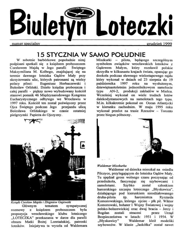 grudzień numer specjalny 1999 15 STYCZNIA W SAMO POŁUDNIE W sobotnie barbórkowe popołudnie niżej podpisani spotkali się z księ'dzem proboszczem Czesławem Majdą w Jego parafii Świętego Maksymiliana M. Kolbego, znajdującej się na terenie dawnego lotniska Gądów Mały przy skrzyżowaniu ulic, których patronami są wielcy polscy piloci: Eugeniusz Horbaczewski i Bolesław Orliński. Dzieło księdza proboszcza i całej parafii - piękny nowo wybudowany kościół stanowi pomnik 46 Międzynarodowego Kongresu Eucharystycznego odbytego we Wrocławiu w 1997 roku. Kościół ten został poświęcony przez Ojca Świętego podczas Jego przejazdu ulicą Bolesława Orlińskiego w czasie ostatniej pielgrzymki Papieża do Ojczyzny. będącego szczególnym lotników z Gądowem Małym, który rozsławił polskie skrzydła w kilkunastu krajach świata, opasując go dookoła podczas sławnego wieloetapowego rajdu który wykonał w dniach od 23 sierpnia do 19 października 1997 roku na wysłużonym, dziewiętnastoletnim jednosilnikowym samolocie typu AN-2, produkcji zakładów w Mielcu. Wcześniej wy konał 'on wiele trudnch lotów dalekodystansowych na samolotach tego typu. M.in. kilkakrotnie pokonał on Ocean Atlantycki w kierunku zachodnim. W maju 1995 roku wykonał przelot na trasie Rzeszów - Toronto przez biegun północny. Miszkurki - pilota, symbolem związków I wrocławskich Waldemar Miszkurka Ksiądz Czesław Majda Głównym i Zbigniew Gajewski tematem sympatycznej rozmowy z księdzem proboszczem była propozycja wrocławskiego klubu lotniczego "ŁOTECZKA" przekazania w darze dla parafii obrazu Matki Bożej Loretańskiej, patronki lotników. Inicjatywa ta wyszła od Waldemara Waldemar od dziecka mieszkał na osiedlu Pilczyce, przylegającym do lotniska Gądów Mały. Tu spędzał gross wolnego czasu poczynając od przedszkola, fascynując się szybowcami i został członkiem samolotami. Szybko harcerskiego szczepu lotniczego "Błyskawica", działającego pod kierunkiem nieodżałowanego druha-pilota śp. harcmistrza Ryszarda Komorowskiego, którego ojciec - płk pil. Wiktor Komorowski, bohater I Wojny Światowej i wojny polsko-bolszewickiej oraz dwaj bracia - Jerzy i Bogdan zostali straceni przez Urząd Bezpieczeństwa w latach: 1951 i 1954. W "Błyskawicy" Waldemar kleił modeliki szybowców. W klasie "Jaskółka" został nawet mistrzem Dolnego Śląska. W roku 1969 rozpoczął na lotnisku Gądów Mały szkolenie praktyczne za wyciągarką na szybowcu "Czapla" w grupie instruktora Achila Rudnika. Do pierwszego lotu samodzielnego dopuścił go instr. Zdzisław Majewski. W późniejszy~ okresie szkolił go również instr. . Stefan Różycki. (Wszyscy ci klubu lotników instruktorzy, to członkowie "Loteczka", silnie związanego z lotniskiem Gądów Mały). W roku 1970 - nie mając szans na szkolenie samolotowe w aeroklubie - postanowił uczynić to w wojsku. Po wyszkoleniu się na samolotach w Dęblinie pozostał w wojskowej służbie zawodowej do roku 1981, latając m. in. Dowództwie Wojsk Lotniczych w Poznaniu oraz,·· w latach 1979 - 1981 we Wrocławiu, po czym opuścił kraj, udając się na emigrację. Wiele lat spędził w Meksyku i w Kanadzie. W Meksyku podejmował zarobkowo różne prace. W końcu, dzięki silnej woli trafił do lotnictwa w charakterze pilota. Pracę tę kontynuował następnie w Kanadzie., Sercem był jednak wciąż w Ojczyźnłe. PQwracając do niej na stałe osiedlił się 'w RzeszQwie~, gdzie mieszka z najbliższą rodziną. Często jednak odwiedza swą wrocławskąrodzinę biologiczną i bliską sercu rodzinę lotniczą czyli koleżanki j kolegów zrzeszonych w "Loteczce". WALDEMAR WŁAŚNIE NA JEJ FORUM LOTNISKO, SPRAWOWANIA DUSZPAS TERSKIEJ OPIEKI N~t\ TERENIE CAŁEGO OSIEDLA GĄDÓW MAŁY. MAJĄC TO NA UWADZE WYRAZIŁ TERAZ ZGODĘ NA NASZĄ PROPOZYCJĘ, ABY, KAPLICĘ POWIERZYĆ OPIECE' PATRONKI LOTNIKÓW., ,  OD 15 STYCZNIA BĘDZIE TO KAPLICA POD WEZWANIEM MATKI BOŻEJ LORETANSKIEJ, PATRONKI LOTNIKÓW. W TEN SŻLACHETNY SPOSÓB, OBOK LOTNICZYCH NAZW ULIC, GĄDÓW MALy ZYSKA OSIEDLE KOLEJNY CENNY DAR, PODKREŚLAJĄCY JEGO LOTNICZĄPRZESZLOŚ·Ć. ZAPROPONOWAŁ WYKONANIE PRZEZ OBRAZU MATKI BOŻEJ Kościół Sw. SIEBIE LORET AŃSKIEJ. Ma on do tego nie tylko ~ NA UROCZYSTOŚĆ TĘ ZAPRASZAMY SERDECZNIE WSZYSTKICH LOTNIKÓW I ICH RODZINY Z CAŁEJ POLSKI I Z ZAGRANICY ORAZ SYMPATYKÓW LOTNICTWA. MAMY NADZIEJĘ, ŻE WALDEMAR M1SZKURKA DOKOŃCZY SWOJE DZIEŁO DO TEGO CZASU, CZEGO JEMU I SOBIE SERDECZNIE ŻYCZYMY. Stanisław Błasiak, Zbigniew Gajewski KSIĄDZ PRO'BOSZCZ .PRZED PIF;CIU LATY PRZEJĄŁ UROCZYSCIE SYMBOLICZNE ŻYCZENIE WROCŁAW SKICR LOTNIKÓW, KTÓRZY OPUŚCILI ADRES KORESPONDENCYJNY: KLU~ Wrocławiu. W SAMO POŁUDNIE (O GODZINIE 12.00) W SOBOTĘ 15 STYCZNIA ROKU 2000 W KAPLICY TEJ ODBĘDZIE SIĘ UROCZYSTA MSZA ŚWIĘTA W INTENCJI LOTNIKÓW I ICH RODZIN, POŁĄCZONA Z OPŁATKIEM. powody moralne i sentymentalne, ale również fachowe. Podczas zawodowej służby wojskowej w Poznaniu zdobył tytuł magistra sztuki w zakresie wychowania plastycznego w 4-1etniej Państwowej Wyższej Szkole Sztuk Plastycznych. Mamy nadzieję, że wena twórcza pozwoli Mu stworzyć zaplanowane dzieło. Ksiądz proboszcz Czesław Majda, który jest nie tylko sympatykiem lotnictwa ale i przyjacielem lotników, zaproponował umieszczenie obrazu w obszernej kaplicy, znajdującej się w obrębie zabudowań parafii. Wejście do niej usytuowane jest od strony ulicy pułkownika pil. ąolesława Orlińskiego. Obraz będzie wisiał na centralnej ścianie kaplicy. \. Zbigniew Gajewski ul. Wejherowska 5/4 54-239 WROCŁAW tel.: (071) 350 72 20 " Maksymiliana Kolbego we , LOTNIKOW "LOTECZKA" Redagują: Stanisław Błasiak, Zbigniew Gajewski, Wojciech Sankowski.
