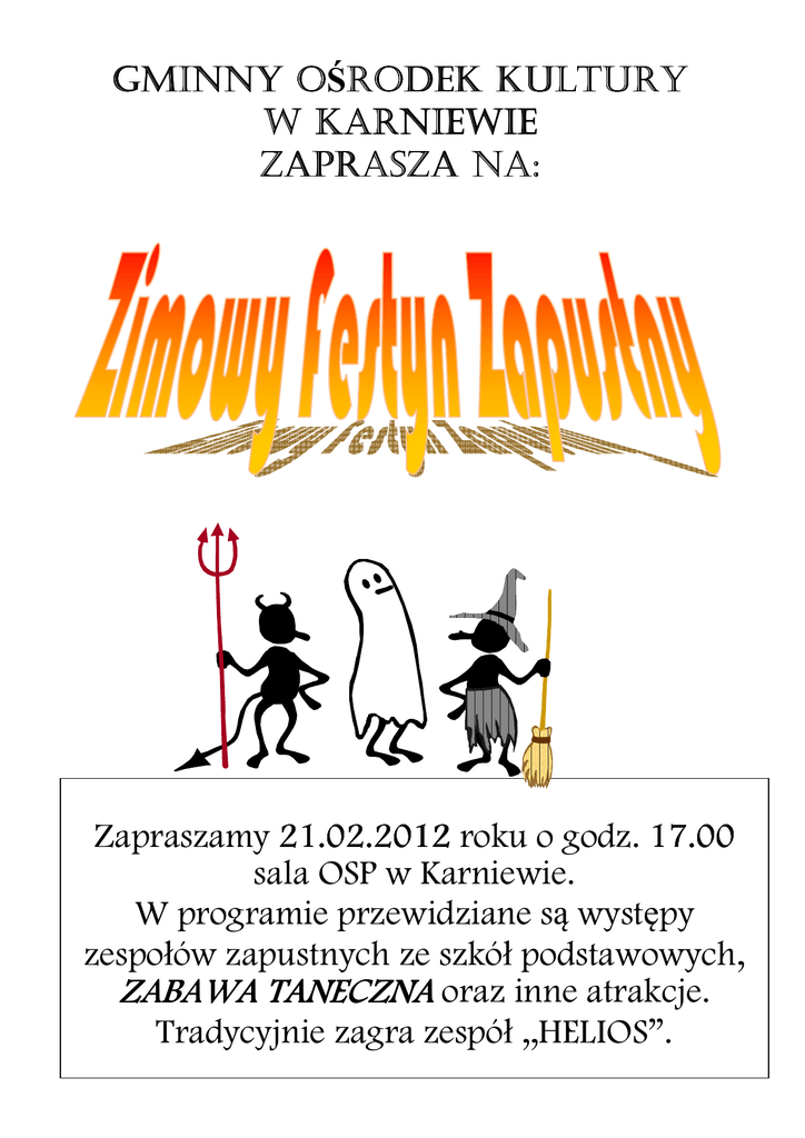GMINNY OŚRODEK O RODEK KULTURY W KARNIEWIE ZAPRASZA NA: Zapraszamy 21.0 21.02 .02.201 .2012 roku o godz. 17.00 sala OSP w Karniewie. W programie przewidziane są występy zespołów zapustnych ze szkół podstawowych, ZABAWA TANECZNA oraz inne atrakcje. Tradycyjnie zagra zespół ,,HELIOS”.