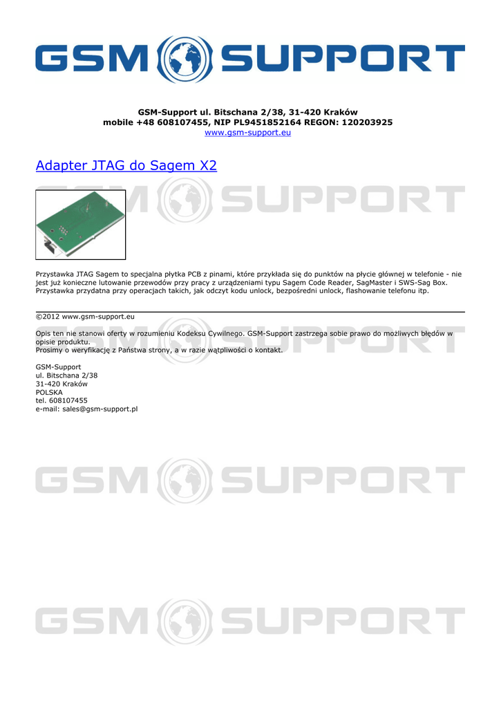 GSM-Support ul. Bitschana 2/38, 31-420 Kraków mobile +48 608107455, NIP PL9451852164 REGON: 120203925 www.gsm-support.eu Adapter JTAG do Sagem X2 Przystawka JTAG Sagem to specjalna płytka PCB z pinami, które przykłada się do punktów na płycie głównej w telefonie - nie jest już konieczne lutowanie przewodów przy pracy z urządzeniami typu Sagem Code Reader, SagMaster i SWS-Sag Box. Przystawka przydatna przy operacjach takich, jak odczyt kodu unlock, bezpośredni unlock, flashowanie telefonu itp. ©2012 www.gsm-support.eu Opis ten nie stanowi oferty w rozumieniu Kodeksu Cywilnego. GSM-Support zastrzega sobie prawo do możliwych błędów w opisie produktu. Prosimy o weryfikację z Państwa strony, a w razie wątpliwości o kontakt. GSM-Support ul. Bitschana 2/38 31-420 Kraków POLSKA tel. 608107455 e-mail: [email protected] Powered by TCPDF (www.tcpdf.org)