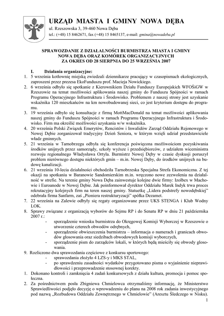 URZĄD MIASTA I GMINY NOWA DĘBA ul. Rzeszowska 3, 39-460 Nowa Dęba tel.: (+48) 15 8462671, fax (+48) 15 8465137, e-mail: [email protected] SPRAWOZDANIE Z DZIAŁALNOŚCI BURMISTRZA MIASTA I GMINY NOWA DĘBA ORAZ KOMÓREK ORGANIZACYJNYCH ZA OKRES OD 28 SIERPNIA DO 25 WRZEŚNIA 2007 1. 2. 3. 4. 5. 6. 7. 8. 9. 1. 2. I. Działania organizacyjne: 5 września kotłownię miejską zwiedzali dziennikarze pracujący w czasopismach ekologicznych, zaproszeni przez prezesa EkoFunduszu prof. Macieja Nowickiego. 6 września odbyło się spotkanie z Kierownikiem Działu Funduszy Europejskich WFOŚiGW w Rzeszowie na temat moŜliwości aplikowania naszej gminy do Funduszu Spójności w ramach Programu Operacyjnego Infrastruktura i Środowisko. Problemem z naszej strony jest uzyskanie wskaźnika 120 mieszkańców na km nowobudowanej sieci, co jest kryterium dostępu do programu. 19 września odbyło się konsultacje z firmą MottMacDonald na temat moŜliwości aplikowania naszej gminy do Funduszu Spójności w ramach Programu Operacyjnego Infrastruktura i Środowisko. Firm ma określić moŜliwości uzyskania w/w wskaźnika. 20 września Polski Związek Emerytów, Rencistów i Inwalidów Zarząd Oddziału Rejonowego w Nowej Dębie zorganizował tradycyjny Dzień Seniora, w którym wzięli udział przedstawiciele władz gminnych. 21 września w Tarnobrzegu odbyła się konferencja poświęcona moŜliwościom pozyskiwania środków unijnych przez samorządy, szkoły wyŜsze i przedsiębiorców, z udziałem wiceministra rozwoju regionalnego Władysława Ortyla. Burmistrz Nowej Dęby w czasie dyskusji poruszył problem nierównego dostępu niektórych gmin – m.in. Nowej Dęby, do środków unijnych na budowę kanalizacji. 21 września 10-lecia działalności obchodziła Tarnobrzeska Specjalna Strefa Ekonomiczna. Z tej okazji na spotkaniu w Baranowie Sandomierskim m.in. wręczono nowe zezwolenia na działalność w strefie. Na terenie gminy Nowa Dęba zainwestuje kolejne dwie firmy: Izolbex w Machowie i Euroanode w Nowej Dębie. Jak poinformował dyrektor Oddziału Marek Indyk trwa proces rekrutacyjny kolejnych firm na teren naszej gminy. Statuetkę „Lidera podstrefy nowodębskiej” odebrała firma Sanfarm, zaś „Pioniera restrukturyzacji” spółka Dezamet. 22 września na Zalewie odbyły się regaty organizowane przez UKS STENGA i Klub Wodny LOK. Sprawy związane z organizacją wyborów do Sejmu RP i do Senatu RP w dniu 21 października 2007 r.: sporządzenie wniosku burmistrza do Okręgowej Komisji Wyborczej w Rzeszowie o utworzenie czterech obwodów odrębnych, sporządzenie obwieszczenia burmistrza – informacja o numerach i granicach obwodów głosowania oraz siedzibach obwodowych komisji wyborczych, sporządzenie pism do zarządców lokali, w których będą mieściły się obwody glosowania. Rozliczono dwa sprawozdania częściowe z konkursu sportowego: sprawozdania złoŜyło 4 LZS-y i MKS STAL, po sprawdzeniu zasadności wydatków przygotowano pisma o wyjaśnienie nieprawidłowości i przeprowadzenie stosownej korekty. Dokonano kontroli i zamknięcia 4 zadań konkursowych z działu kultura, promocja i pomoc społeczna. Za pośrednictwem posła Zbigniewa Chmielowca otrzymaliśmy informację, Ŝe Ministerstwo Sprawiedliwości podjęło decyzję o wprowadzeniu do planu na 2008 rok zadania inwestycyjnego pod nazwą „Rozbudowa Oddziału Zewnętrznego w Chmielowie” (Aresztu Śledczego w Nisku). 1 Na ten cel Inspektorat Rzeszowski Okręgowej SłuŜby Więziennej planuje przeznaczyć w 2008 r. kwotę 10 mln zł, zaś w 2009 kwotę 10,3 mln zł, co pozwoli zrealizować zadanie. 3. W postępowaniu konkursowym dokonano wyboru pracownika ds. środków pomocowych. Spośród 4 kandydatów komisja konkursowa wybrała Marcina Furtaka, mieszkańca Nowej Dęby. 1. 2. 3. 4. 5. 6. 7. 8. II. Sprawy komunalne i społeczne: 10 i 18 września w Stalowej Woli odbyły się kolejne spotkania na temat budowy zakładu zagospodarowania odpadów. Przedstawiona została moŜliwość budowy tego zakładu w Machowie, po znalezieniu inwestora dla firmy Ra-Tar, która ma zezwolenie na budowę zakładu pirolizy odpadów. Odbyło się spotkanie z dyrektorami Oddziału w Rzeszowie Generalnej Dyrekcji Dróg Krajowych i Autostrad. ZłoŜone zostały wnioski dotyczące planowanej na rok 2008 przebudowy DK9 od ronda do ul. NiŜańskiej: budowa ciągu rowerowego przez miasto, odsunięcie chodnika od drogi poprzez „zieloną” opaskę, budowa kilku lewoskrętów, wykonania bezpiecznych przejść dla pieszych. Ponadto poruszono sprawę oświetlenia budowanego tunelu i dojścia do przystanków w Chmielowie. Przedstawiciele Oddziału mają w najbliŜszym czasie ustosunkować się do przedłoŜonych wniosków. W w/w okresie zawarte zostały umowy na: - wykonanie mapy sytuacyjno-wysokościowej do celów projektowych z geodetą na kwotę 976,00 zł (dot. projektu fontanny na Placu Wyzwolenia w Nowej Dębie); - wykonanie projektu fontanny - z firmą NESO-aster Jerzy Siuta Z.U.P. Domaradz - kwota15.000,00 zł. Przygotowano dokumenty do ogłoszenia przetargów na: remont drogi dojazdowej do gruntów rolnych w sołectwie Alfredówka (Na Granicy), remont dróg i placów na terenie miasta (ul. Zarzecze, droga przy budynku Krasickiego 35, parking przy budynkach Jana Pawła II 20 i 22). Trwają prace związane z remontem elewacji budynku nr 4 przy ulicy Broniewskiego. Wspólnie z PGKiM wykonano prace polegające na wykonaniu 5 boksów dla psów w tymczasowej przechowalni na terenie oczyszczalni ścieków. Trwają przygotowania do realizacji akcji zbierania zuŜytych a baterii, do których włączają się szkoły i przedszkola z terenu miasta i gminy. W dniach od 30.08 do 18.09 firma SanTa-EKO Sp. Jawna w Sandomierzu w I etapie odebrała odpady niebezpieczne zawierające azbest pochodzące z rozbiórki dachów budynków z terenu gminy Nowa Dęba od: 1) szesnastu gospodarstw domowych w ilości 20 712 kg, 2) dwóch jednostek budŜetowych w ilo