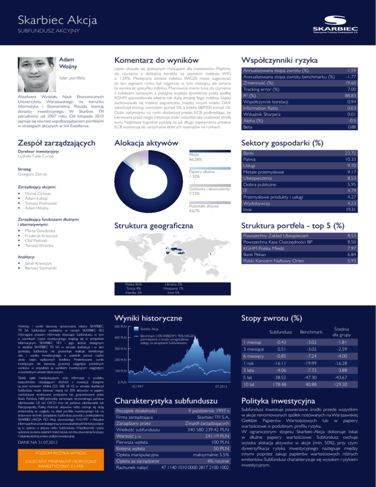 Skarbiec Akcja SUBFUNDUSZ AKCYJNYv Adam Woźny Komentarz do wyników Współczynniki ryzyka Absolwent Wydziału Nauk Ekonomicznych Uniwersytetu Warszawskiego na kierunku Informatyka i Ekonometria. Posiada licencję doradcy inwestycyjnego. W Skarbiec TFI zatrudniony od 2007 roku. Od listopada 2010 zajmuje się również współzarządzaniem portfelami w strategiach akcyjnych w linii Excellence. Lipiec okazała się spokojnym miesiącem dla inwestorów. Mięliśmy do czynienia z delikatną korekta na szerokim indeksie WIG o 1,59%. Miesięczna zmiana indeksu WIG20 może sugerować, że ten segment rynku był najgorszy w tym miesiącu, ale zmiana ta wynika ze specyfiku indeksu. Mianowicie mamy tutaj do czynienia z indeksem cenowym, a pokaźna wypłata dywidendy przez spółkę KGHM spowodowała właśnie tak dużą zmianę tego indeksu. Lepiej zachowywały się indeksy zagraniczne, między innymi indeks DAX zakończył miesiąc wzrostem ponad 5%, a indeks S&P500 ponad 1%. Dużo optymizmu na rynki dostarczył prezes ECB podkreślając, że kierowana przez niego instytucja zrobi wszystko aby uratować strefę euro. Najbliższe tygodnie pokażą na jak długo zapewnienia prezesa ECB wystarczą do utrzymania dobrych nastrojów na rynkach. Zespół zarządzających Alokacja aktywów lider portfela Dyrektor inwestycyjny: Ludmiła Falak-Cyniak Papiery dłużne 1.32% Zarządzający akcjami: Zarządzający funduszami dłużnymi i alternatywnymi: Gotówka i ekwiwalenty 7.73% Michał Cichosz Adam Łukojć Tomasz Piotrowski Adam Woźny Marta Dziedzicka Fryderyk Krawczyk Olaf Pietrzak Tomasz Wronka Pozostałe aktywa 4.67% Struktura geograficzna Polska 86% Turcja 4% Irlandia 2% DANE NA 31.07.2012 POZIOM RYZYKA: WYSOKI ZALECANY MINIMALNY HORYZONT INWESTYCYJNY: 3 LATA 500PLN 400PLN Stopy zwrotu (%) SkarbiecAkcja Subfundusz Benchmark(10%WIBID3M/90%WIG20) pomniejszonyokosztywynagrodzenia stałego za zarządzanie Subfunduszem 300PLN 200PLN 100PLN 0PLN 07.2012 Charakterystyka subfunduszu Początek działalności 9 październik 1997 r. Firma zarządzająca Skarbiec TFI S.A. Zarządzany przez Zespół zarządzających Wielkość subfunduszu 340 580 239.42 PLN Wartość j. u. 241.19 PLN Pierwsza wpłata 100 PLN Kolejna wpłata 50 PLN Opłata manipulacyjna maksymalnie 5.5% Opłata za zarządzanie 4% rocznie Rachunek nabyć 47 1140 1010 0000 2817 2100 1002 Benchmark Średnia dla grupy 1 miesiąc -0.43 -3.02 -1.81 3 miesiące 0.51 -3.02 -2.59 6 miesięcy -0.85 -7.24 -4.00 -16.11 -19.99 -16.28 1 rok 10.1997 8.53 8.50 7.97 6.84 5.93 Ukraina 2% Hiszpania 1% Inne 5% Wyniki historyczne Tabela opłat manipulacyjnych oraz informacje o podatku bezpośrednio obciążającym dochód z inwestycji dostępne są pod numerem infolinii: (22) 588 18 43, w serwisie skarbiec.pl. Subfundusz może lokować więcej niż 35% aktywów w papiery wartościowe emitowane, poręczone lub gwarantowane przez Skarb Państwa, NBP, jednostkę samorządu terytorialnego, państwa członkowskie UE lub OECD inne niż państwa członkowskie lub Rzeczpospolitą Polską. Wartość aktywów netto cechuje się dużą zmiennością ze względu na skład portfela inwestycyjnego lub na stosowane techniki zarządzania. Subfundusz powstał z przekształcenia SKARBIEC-AKCJA FIO Akcji utworzonego 9.10.1997 r. Aktualne informacjefinansowedostępnesąnawww.skarbiec.pl.Wartościpodane są w oparciu o aktywa netto Subfunduszu. Współczynniki ryzyka są liczone za okres ostatnich trzech lat,lub od dnia utworzenia funduszu / ostatniej istotnej zmiany polityki inwestycyjnej. 23.72 10.33 9.70 9.17 8.53 5.95 4.79 4.27 4.23 19.31 Powszechny Zakład Ubezpieczeń Powszechna Kasa Oszczędności BP KGHM Polska Miedź Bank Pekao Polski Koncern Naftowy Orlen Jakub Krawczyk Bartosz Szymański Wykresy i wyniki stanowią opracowania własne SKARBIEC TFI SA. Subfundusz wydzielony w ramach SKARBIEC FIO. Wymagane prawem informacje dotyczące Subfunduszu, w tym o czynnikach ryzyka inwestycyjnego, znajdują się w prospekcie informacyjnym SKARBIEC FIO i jego skrócie dostępnym w siedzibie SKARBIEC TFI SA, w serwisie skarbiec.pl i w sieci sprzedaży. Subfundusz nie gwarantuje realizuje określonego celu i wyniku inwestycyjnego, a uczestnik ponosi ryzyko utraty części wpłaconych środków. Prezentowane wyniki inwestycyjne nie stanowią gwarancji osiągnięcia podobnych wyników w przyszłości, są wynikiem inwestycyjnym osiągniętym w konkretnym okresie historycznym. Banki Paliwa Usługi Metale przemysłowe Ubezpieczenia Dobra publiczne IT Przemysłowe produkty i usługi Wydobywczy Inne Struktura portfela - top 5 (%) Analitycy: -1.59 -1.77 19.60 7.00 88.83 0.94 0.03 0.01 -0.5 0.88 Sektory gospodarki (%) Akcje 86.28% Strateg: Grzegorz Zatryb Annualizowana stopa zwrotu (%) Annualizowana stopa zwrotu benchmarku (%) Zmienność (%) Tracking error (%) R2 (%) Współczynnik korelacji Information Ratio Wskaźnik Sharpe’a Alpha (%) Beta 3 lata -4.06 -7.72 3.88 5 lat -38.52 -47.30 -43.67 10 lat 178.48 40.88 129.30 Polityka inwestycyjna Subfundusz inwestuje powierzone środki przede wszystkim w akcje renomowanych spółek notowanych na Warszawskiej Giełdzie Papierów Wartościowych lub w papiery wartościowe o podobnym profilu ryzyka. W ograniczonym stopniu Skarbiec-Akcja dokonuje lokat w dłużne papiery wartościowe. Subfundusz cechuje wysoka alokacja aktywów w akcje (min. 50%), przy czym dywersyfikacja ryzyka inwestycyjnego następuje między innymi poprzez zakup papierów wartościowych różnych emitentów. Subfundusz charakteryzuje się wysokim ryzykiem inwestycyjnym.