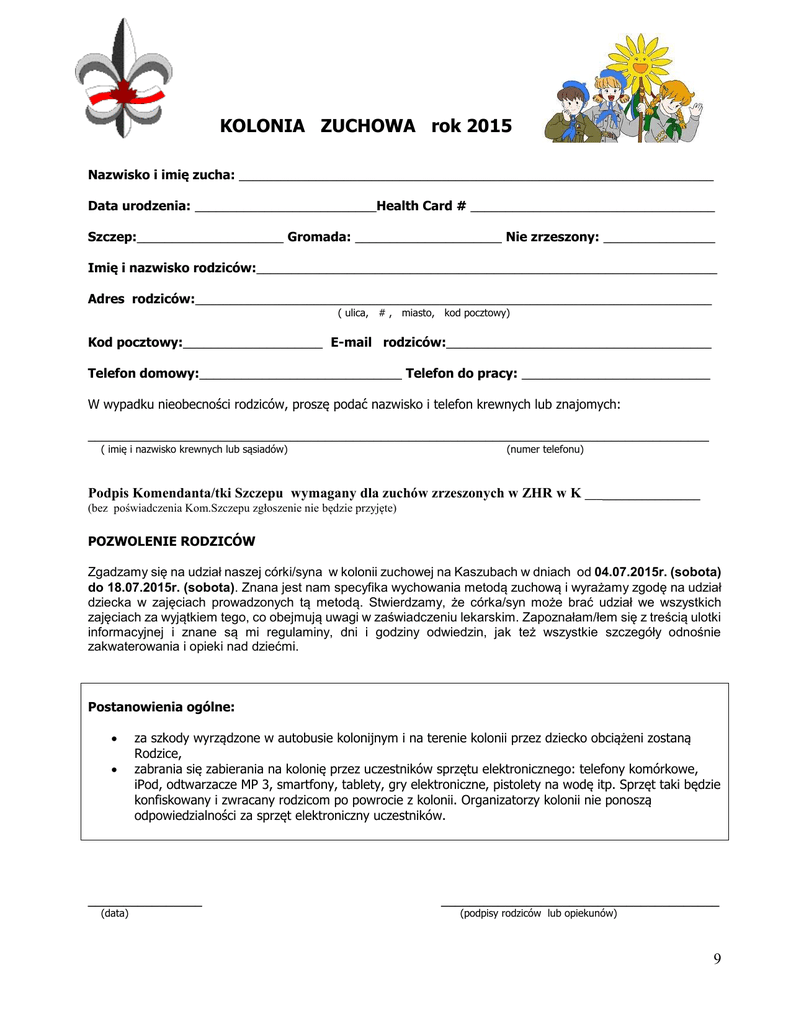 KOLONIA ZUCHOWA rok 2015 Nazwisko i imię zucha: ____________________________________________________________________ Data urodzenia: __________________________Health Card # ___________________________________ Szczep:_____________________ Gromada: _____________________ Nie zrzeszony: ________________ Imię i nazwisko rodziców:__________________________________________________________________ Adres rodziców:__________________________________________________________________________ ( ulica, # , miasto, kod pocztowy) Kod pocztowy:____________________ E-mail rodziców:______________________________________ Telefon domowy:_____________________________ Telefon do pracy: ___________________________ W wypadku nieobecności rodziców, proszę podać nazwisko i telefon krewnych lub znajomych: _________________________________________________________________________________________ ( imię i nazwisko krewnych lub sąsiadów) (numer telefonu) Podpis Komendanta/tki Szczepu wymagany dla zuchów zrzeszonych w ZHR w K __________________ (bez poświadczenia Kom.Szczepu zgłoszenie nie będzie przyjęte) POZWOLENIE RODZICÓW Zgadzamy się na udział naszej córki/syna w kolonii zuchowej na Kaszubach w dniach od 04.07.2015r. (sobota) do 18.07.2015r. (sobota). Znana jest nam specyfika wychowania metodą zuchową i wyrażamy zgodę na udział dziecka w zajęciach prowadzonych tą metodą. Stwierdzamy, że córka/syn może brać udział we wszystkich zajęciach za wyjątkiem tego, co obejmują uwagi w zaświadczeniu lekarskim. Zapoznałam/łem się z treścią ulotki informacyjnej i znane są mi regulaminy, dni i godziny odwiedzin, jak też wszystkie szczegóły odnośnie zakwaterowania i opieki nad dziećmi. Postanowienia ogólne: za szkody wyrządzone w autobusie kolonijnym i na terenie kolonii przez dziecko obciążeni zostaną Rodzice, zabrania się zabierania na kolonię przez uczestników sprzętu elektronicznego: telefony komórkowe, iPod, odtwarzacze MP 3, smartfony, tablety, gry elektroniczne, pistolety na wodę itp. Sprzęt taki będzie konfiskowany i zwracany rodzicom po powrocie z kolonii. Organizatorzy kolonii nie ponoszą odpowiedzialności za sprzęt elektroniczny uczestników. ________________ (data) _______________________________________ (podpisy rodziców lub opiekunów) 9 PARTICIPATION IN ANY SCOUTS PROGRAMS AND ACTIVITY Release of Liability and Waiver and Consent for Use of Photographs To: ZHR Polish Scouts of Canada Participant name: _____________________________________________________________________ IN CONSIDERATION of ZHRwK admitting my child or myself into their program, I hereby consent to my child or me participating in all programs and activities of ZHRwK. I FURTHER HEREBY release ZHRwK, its instructors, agents, volunteers, employees and any other persons representing ZHRwK from any liability, claims, demands, damages, actions or causes of action which I may hereafter have against ZHRwK, for or by reason of, or in any way arising out of any accident, loss, injury or damage which my child or me may suffer while attending at or participating in any program or activity of ZHRwK in the amount exceeding the sum payable under the insurance policy purchaser by ZHRwK, and this shall constitute my full and final release. I understand that photographs, videos and voice recording of my child or me may be taken during scouting activities by organizers and that the resulting photographic images, videos and voice recording may be used in organization newspapers and other promotional material including the polish language press without further notice to me, and I consent to such use of these photos. I have read and fully understand the nature of this document and fully understand and accept the contents of this Release of Liability and Waiver and Consent for Use of Photographs and are executing this document voluntarily in full knowledge of its legal effect. Zwolnienie z Odpowiedzialności Cywilnej Wyrażam zgodę na mój lub mojego dziecka udział w programach, zajęciach, biwakach i wycieczkach organizowanych przez Związek Harcerstwa Rzeczypospolitej w Kanadzie. Niniejszym oświadczam, że wyrażam zgodę na zwolnienie ZHRwK , instruktorów, przedstawicieli, pracowników, woluntariuszy i każdą osobę reprezentującą ZHRwK z odpowiedzialności cywilnej oraz wszelkich roszczeń cywilnych przeciwko ZHRwK i w/w osobom za szkody poniesione przez moje dziecko lub mnie wynikające z wypadku, uszkodzenia ciała oraz wszelkich innych strat i szkód, których moje dziecko lub ja może doznać w czasie uczestnictwa w jakimkolwiek programie zorganizowanym przez ZHRwK w zakresie przekraczającym wysokość ubezpieczenia wykupionego przez ZHRwK. Rozumiem, że podczas zajęć harcerskich mogą być robione fotografie, filmy i nagrania dźwiękowe mojego dziecka lub nnie przez organizatorów zajęć i, że te zdjęcia, filmy i nagrania mogą być publikowane w gazetce harcerskiej i innych materiałach informacyjno-reklamowych bez osobnego powiadomienia mnie. Zgadzam się na takie użycie tych: fotografii, filmów i nagrań głosowych mojego dziecka lub mnie. Oświadczam zatem, że przyjąłem/łam do wiadomości treść niniejszego dokumentu i w pełni rozumiem jego treść oraz podpisuję ten dokument z własnej, nieprzymuszonej woli znając konsekwencje prawne wynikające z podpisania tego dokumentu. Signed this ____________________ day of _________________________, 20___________ ________________ ________________________________ Witness Printed Name and Signature Participiant signature __________________ ________________ Parent or Guardian Printed Name (if Participation is a Minor) Parent or Guardian Signature (if Participation is a Minor) ________________________________________________ Witness Printed Name and Signature 10 OPŁATA ZA KOLONIĘ ZUCHOWĄ 2015 Dwa tygodnie kolonii: - 1-sze dziecko - $ 700.00 .......................... - 2-gie dziecko - $ 600.00 .......................... - 3-cie dzieck