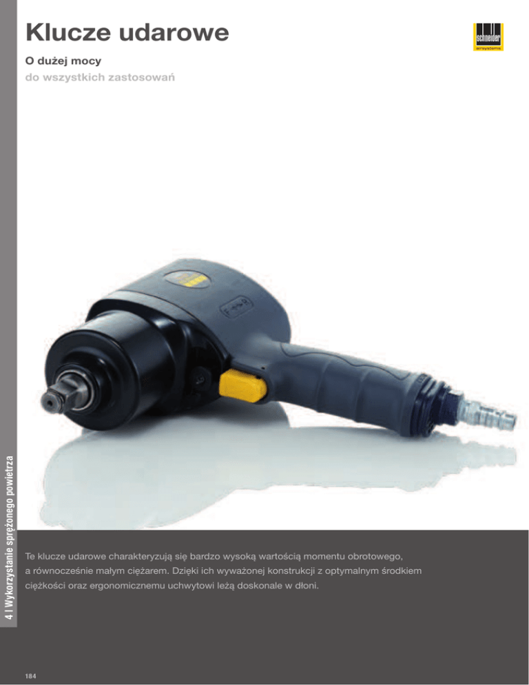 Klucze udarowe O dużej mocy 4 | Wykorzystanie sprężonego powietrza do wszystkich zastosowań Te klucze udarowe charakteryzują się bardzo wysoką wartością momentu obrotowego, a równocześnie małym ciężarem. Dzięki ich wyważonej konstrukcji z optymalnym środkiem ciężkości oraz ergonomicznemu uchwytowi leżą doskonale w dłoni. 184 Przegląd naszych kluczy udarowych Koła samochodów osob. SGS 405 1/2" SGS 600 1/2" SGS 815 1/2" SGS 1000 1/2" ++ ++ ++ ++ ++ ++ ++ ++ ++ ++ ++ ++ ++ ++ ++ ++ ++ ++ ++ ++ ++ ++ ++ ++ ++ ++ ++ Osie samochodów osob. Silniki samochodów osob. Karoseria samochodów osob. ++ ++ ++ ++ Koła pojazdów użytk. Osie pojazdów użytk. Silniki pojazdów użytk. ++ Karoseria pojazdów użytk. ++ ++ ++ ++ ++ SGS 1625 3/4" Koła pojazdów ciężarowych Osie pojazdów ciężarowych ++ Silniki pojazdów ciężarowych ++ ++ Karoseria pojazdów ciężarowych Konstrukcje metalowe Maszyny ++ ++ ++ ++ ++ ++ ++ ++ ++ ++ ++ ++ SGS 1900 1" nadają się bardzo dobrze 4 | Wykorzystanie sprężonego powietrza SGS 340 3/8" 185 Klucze udarowe Klucze udarowe Cechy wspólne Bardzo wydajne, a zarazem lekkie Komfortowa obsługa i praca nie powodująca zmęczenia dzięki lekkiej i zwartej obudowie z izolacją termiczną Dobrze wyważona konstrukcja i ergonomiczna forma uchwytu z optymalnie umiejscowionymi elementami obsługi 186 Ciśnienie robocze (bar) Moment obrotowy (Nm) Ciężar (kg) D322800 Zapotrzebowanie na powietrze (l/s) SGS 340-3/8 ˝ System mocowania (Czworokąt) Nr art. 3/8 ˝ 5 6,3 340 1,2 Ciężar (kg) D322811 Moment obrotowy (Nm) SGS 405-1/2 ˝ Ciśnienie robocze (bar) Nr art. Zapotrzebowanie na powietrze (l/s) Typ 1/2 ˝ 5 6,3 405 1,2 SGS 600-1/2 ˝ D322812 Ciężar (kg) Nr art. Wyjątkowo zwarta obudowa o niewielkich wymiarach Redukcja wibracji, zabezpieczenie dzięki rękojeści pokrytej warstwą gumy Moment obrotowy (Nm) Lekki, do dużych połączeń śrubowych Ekstremalnie wydajny, a zarazem lekki klucz udarowy o bardzo małych wymiarach dla serwisów motoryzacyjnych. Idealnie nadaje się do wykonywania średnich i większych połączeń w obrębie kół, silników, osi i karoserii samochodów osobowych i dostawczych Typ obrębie kół, silników i karoserii samochodów osobowych i dostawczych, maszyn oraz konstrukcji metalowych System mocowania (Czworokąt) Wydajny, do średnich połączeń śrubowych Przeznaczony dla serwisów motoryzacyjnych, zakładów naprawczych, montażowych i metalurgicznych. Idealnie nadaje się do wykonywania średniej wielkości połączeń w Ciśnienie robocze (bar) Klucz udarowy 1/2 ˝ Typ silników, elementów mocowania, maszyn i konstrukcji metalowych Zapotrzebowanie na powietrze (l/s) 4 | Wykorzystanie sprężonego powietrza Klucz udarowy 1/2 ˝ Poręczny, do lekkich połączeń śrubowych Przeznaczony dla serwisów motoryzacyjnych, zakładów naprawczych, montażowych i metalurgicznych. Idealnie nadaje się do wykonywania niewielkich połączeń w obrębie System mocowania (Czworokąt) Klucz udarowy 3/8 ˝ Trzy zakresy regulacji momentu obrotowego poprzez regulację doprowadzanej ilości sprężonego powietrza Bezpieczne mocowanie śrub i przyjemna praca dzięki dobrej regulacji przełącznika (łagodny rozruch) Cicha praca Mechanizm udarowy Twin 1/2 ˝ 8,5 6,0 600 1,5 Klucze udarowe Zapotrzebowanie na powietrze (l/s) Ciśnienie robocze (bar) Moment obrotowy (Nm) Ciężar (kg) 1/2 ˝ 8,2 6,3 815 1,8 Ciężar (kg) D322814 Moment obrotowy (Nm) SGS 1000-1/2 ˝ Ciśnienie robocze (bar) Nr art. Zapotrzebowanie na powietrze (l/s) Typ 1/2 ˝ 10 6,3 1000 1,9 Ciężar (kg) D327347 Moment obrotowy (Nm) SGS 345-1/2 ˝ Ciśnienie robocze (bar) Nr art. 1/2 ˝ 6 6 345 2,2 SGS 141-1/2 ˝ D327400 Ciężar (kg) Nr art. Większy moment obrotowy przy obrotach lewych Regulacja kierunku obrotów w prawo/w lewo, obsługa jednoręczna Moment obrotowy (Nm) Poręczny, z mechanizmem udarowym do lekkich połączeń śrubowych Wytrzymały klucz udarowy z mechanizmem udarowym do ekstremalnych zastosowań Typ Zakres dostawy: w walizce z tworzywa sztucznego z 10 nasadkami (10 do 13, 15, 17, 19, 22, 24, 27 mm) Zapotrzebowanie na powietrze (l/s) Wydajny, do wszystkich zastosowań Regulacja kierunku obrotów w prawo/w lewo, obsługa jednoręczna Mechanizm udarowy Typ osobowych, jak i kół, osi i karoserii samochodów dostawczych i ciężarowych Wyjątkowo zwarta obudowa o niewielkich wymiarach Redukcja wibracji, zabezpieczenie dzięki rękojeści pokrytej warstwą gumy System mocowania (Czworokąt) Solidny, do bardzo mocnych połączeń śrubowych Przeznaczony dla serwisów samochodów osobowych oraz dostawczych. Idealnie nadaje się do wykonywania solidnych i trwałych połączeń w obrębie osi samochodów 1/2 ˝ 6 6,3 400 2,3 187 4 | Wykorzystanie sprężonego powietrza D322813 System mocowania (Czworokąt) SGS 815-1/2 ˝ Ciśnienie robocze (bar) Klucz udarowy 1/2 ˝ Nr art. Zapotrzebowanie na powietrze (l/s) Klucz udarowy 1/2 ˝ Typ w obrębie kół i osi samochodów osobowych i dostawczych, maszyn oraz konstrukcji metalowych System mocowania (Czworokąt) Klucz udarowy 1/2 ˝ Wydajny, do dużych połączeń śrubowych Przeznaczony dla serwisów motoryzacyjnych, zakładów oponiarskich, montażowych i metalurgicznych. Idealnie nadaje się do wykonywania solidnych i trwałych połączeń System mocowania (Czworokąt) Klucz udarowy 1/2 ˝ Klucze udarowe Uchwyt ścienny do klucza udarowego 1/2 ˝ Oszczędność czasu dzięki obecności klucza udarowego zawsze pod ręką Z 4 kołkami mocującymi do kluczy nasadowych i półeczką na elementy drobne Łatwy montaż na wszystkich pionowych powierzchniach metalowych dzięki 2 silnym uchwytom magnetycznym Do zastosowania z kluczami udarowymi do 1/2 ˝ 188 Ciśnienie robocze (bar) Moment obrotowy (Nm) Ciężar (kg) D322830 Zapotrzebowanie na powietrze (l/s) SGS 1625-3/4 ˝ 3/4 ˝ 9,1 6,3 1625 3,4 Moment obrotowy (Nm) Ciężar (kg) D322840 Ciśnienie robocze (bar) SGS 1900-1 ˝ Zapotrzebowanie na powietrze (l/s) 