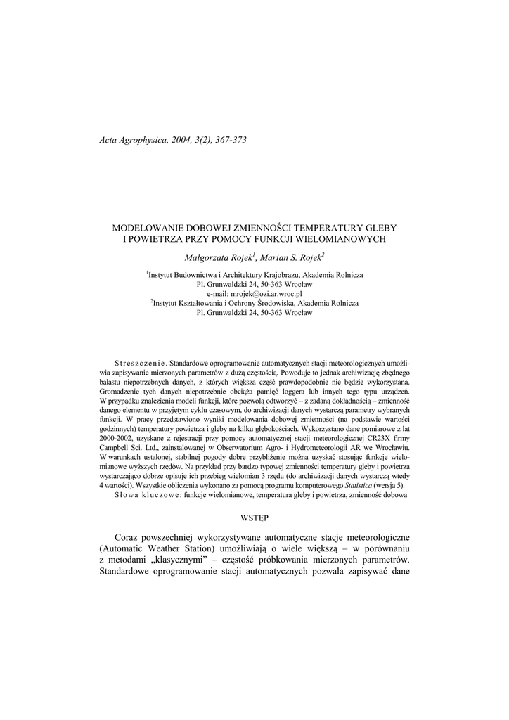 Acta Agrophysica, 2004, 3(2), 367-373 MODELOWANIE DOBOWEJ ZMIENNOŚCI TEMPERATURY GLEBY I POWIETRZA PRZY POMOCY FUNKCJI WIELOMIANOWYCH Małgorzata Rojek1, Marian S. Rojek2 1 Instytut Budownictwa i Architektury Krajobrazu, Akademia Rolnicza Pl. Grunwaldzki 24, 50-363 Wrocław e-mail: [email protected] 2 Instytut Kształtowania i Ochrony Środowiska, Akademia Rolnicza Pl. Grunwaldzki 24, 50-363 Wrocław S t r e s z c z e n i e . Standardowe oprogramowanie automatycznych stacji meteorologicznych umoŜliwia zapisywanie mierzonych parametrów z duŜą częstością. Powoduje to jednak archiwizację zbędnego balastu niepotrzebnych danych, z których większa część prawdopodobnie nie będzie wykorzystana. Gromadzenie tych danych niepotrzebnie obciąŜa pamięć loggera lub innych tego typu urządzeń. W przypadku znalezienia modeli funkcji, które pozwolą odtworzyć – z zadaną dokładnością – zmienność danego elementu w przyjętym cyklu czasowym, do archiwizacji danych wystarczą parametry wybranych funkcji. W pracy przedstawiono wyniki modelowania dobowej zmienności (na podstawie wartości godzinnych) temperatury powietrza i gleby na kilku głębokościach. Wykorzystano dane pomiarowe z lat 2000-2002, uzyskane z rejestracji przy pomocy automatycznej stacji meteorologicznej CR23X firmy Campbell Sci. Ltd., zainstalowanej w Obserwatorium Agro- i Hydrometeorologii AR we Wrocławiu. W warunkach ustalonej, stabilnej pogody dobre przybliŜenie moŜna uzyskać stosując funkcje wielomianowe wyŜszych rzędów. Na przykład przy bardzo typowej zmienności temperatury gleby i powietrza wystarczająco dobrze opisuje ich przebieg wielomian 3 rzędu (do archiwizacji danych wystarczą wtedy 4 wartości). Wszystkie obliczenia wykonano za pomocą programu komputerowego Statistica (wersja 5). S ł o w a k l u c z o w e : funkcje wielomianowe, temperatura gleby i powietrza, zmienność dobowa WSTĘP Coraz powszechniej wykorzystywane automatyczne stacje meteorologiczne (Automatic Weather Station) umoŜliwiają o wiele większą – w porównaniu z metodami „klasycznymi” – częstość próbkowania mierzonych parametrów. Standardowe oprogramowanie stacji automatycznych pozwala zapisywać dane 368 M. ROJEK, M. S. ROJEK z częstością kilku- lub kilkunastosekundową. Zgromadzenie tak duŜej ilości danych pomiarowych umoŜliwia w zakresie znacznie szerszym, w porównaniu z metodami „klasycznymi”, ich wykorzystanie do modelowania z zastosowaniem najnowszych narzędzi matematycznych [2,8] i analizy szeregów czasowych. NaleŜy jednak zwrócić uwagę, Ŝe nie zawsze moŜna ciągi pomiarowe ze stacji automatycznych łączyć z danymi wcześniejszymi ze względu na róŜnice w dokładności i częstotliwości pomiarów [5,6]. Dotychczasowe standardy archiwizacji danych mogą w pewnych sytuacjach zostać uproszczone. Do odtworzenia dokładnego przebiegu wybranego parametru meteorologicznego w przyjętym cyklu czasowym (np. doba) wystarcza niejednokrotnie znajomość wartości z kilku terminów pomiarowych (lub średnich z krótszego odcinka czasu), zamiast wszystkich rejestrowanych danych. Jeśli uda się znaleźć model funkcji, która pozwala odtworzyć zmienność danego elementu w załoŜonym okresie czasu, do archiwizacji danych wystarczą parametry dobranej funkcji. Następnym etapem wykorzystania rejestrowanych danych – po znalezieniu modelu funkcji najlepiej opisującej zmienność znalezionego parametru – moŜe być analiza szeregów czasowych. Jedną z grup takich metod opracowania wyników na podstawie składowych deterministycznej i stochastycznej, przydatnych szczególnie do stosowania w badaniach zmian klimatu, omówiono dokładnie w monografii von Storcha i in. [7]. Metodologia oraz algorytmy innych modeli zaproponowane przez Boxa i in. [1] – wydanie angielskie z roku 1976 – zyskały popularność w wielu dziedzinach. Ogólny model opracowany przez tych autorów zawiera parametry autoregresyjne i średniej ruchomej oraz wprowadza operator róŜnicowania do postaci modelu. Modelowanie techniką ARIMA znajduje zastosowanie w badaniach wielu elementów klimatycznych i hydrologicznych [3,4]. MATERIAŁ I METODY Celem pracy było znalezienie modelu funkcji najlepiej opisujących dobową zmienność temperatury gleby i powietrza. Do obliczeń wykorzystano godzinne wartości z lat 2000-2002 uzyskane za pomocą automatycznej stacji meteorologicznej firmy CAMPBELL Sci. Ltd (model CR23X) zainstalowanej na terenie Obserwatorium Agro- i Hydrometeorologii AR Wrocław-Swojec. Na podstawie wyników próbkowania co 60 sekund logger zestawia raporty godzinne i dobowe. Wartość dla godziny 1 oznacza średnią z pomiarów wykonywanych co minutę od godziny 0,30 do godziny 1,29. Oba analizowane parametry meteorologiczne wykazują wyraźną dobową cykliczność. Szczególnie w warunkach ustalonej pogody dobowa zmienność temperatury gleby (tg) i powietrza (tp) jest przede wszystkim efektem zmian salda promieniowania, strat utajonego ciepła parowania i strumienia ciepła jawnego, MODELOWANIE DOBOWEJ ZMIENNOŚCI TEMPERATURY 369 czyli składowych bilansu cieplnego powierzchni czynnej. Od wschodu do zachodu Słońca powierzchnia gleby ogrzewa się pochłaniając promieniowanie krótkofalowe, w nocy następuje ochłodzenie spowodowane wypromieniowaniem długofalowym. Efektem tego jest występowanie – najczęściej – jednego maksimum (wczesne godziny popołudniowe) i jednego minimum (krótko po wschodzie Słońca) w dobowym cyklu zmian temperatury gleby i powietrza. Taka regularność oraz wyniki wcześniejszych badań autorów podsunęła myśl, aby szczegółowej analizie poddać funkcje wielomianowe; obliczenie przeprowadzono dla kilku modeli tych funkcji, w których zmienną niezaleŜną była godzina pomiaru. ZałoŜono, Ŝe przyjęty model teoretyczny dobrze oddaje zmienność rzeczywistych wartości rozpatrywanego parametru, jeśli współczynnik determinacji (R2) osiąga wartości wi