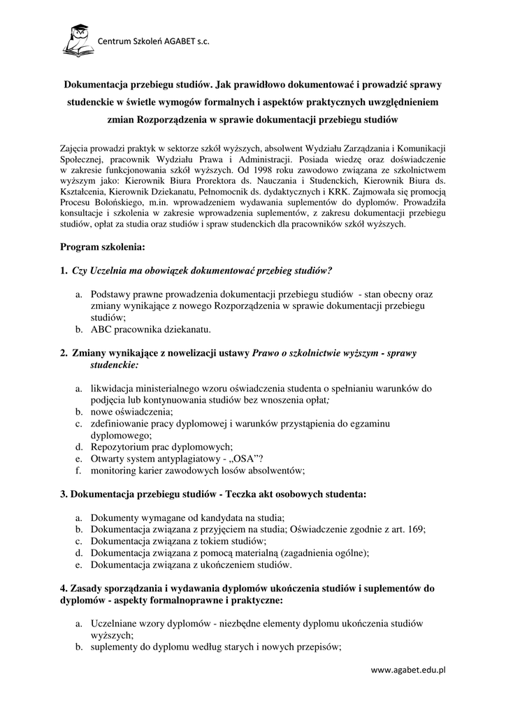 Centrum Szkoleń AGABET s.c. Dokumentacja przebiegu studiów. Jak prawidłowo dokumentować i prowadzić sprawy studenckie w świetle wymogów formalnych i aspektów praktycznych uwzględnieniem zmian Rozporządzenia w sprawie dokumentacji przebiegu studiów Zajęcia prowadzi praktyk w sektorze szkół wyższych, absolwent Wydziału Zarządzania i Komunikacji Społecznej, pracownik Wydziału Prawa i Administracji. Posiada wiedzę oraz doświadczenie w zakresie funkcjonowania szkół wyższych. Od 1998 roku zawodowo związana ze szkolnictwem wyższym jako: Kierownik Biura Prorektora ds. Nauczania i Studenckich, Kierownik Biura ds. Kształcenia, Kierownik Dziekanatu, Pełnomocnik ds. dydaktycznych i KRK. Zajmowała się promocją Procesu Bolońskiego, m.in. wprowadzeniem wydawania suplementów do dyplomów. Prowadziła konsultacje i szkolenia w zakresie wprowadzenia suplementów, z zakresu dokumentacji przebiegu studiów, opłat za studia oraz studiów i spraw studenckich dla pracowników szkół wyższych. Program szkolenia: 1. Czy Uczelnia ma obowiązek dokumentować przebieg studiów? a. Podstawy prawne prowadzenia dokumentacji przebiegu studiów - stan obecny oraz zmiany wynikające z nowego Rozporządzenia w sprawie dokumentacji przebiegu studiów; b. ABC pracownika dziekanatu. 2. Zmiany wynikające z nowelizacji ustawy Prawo o szkolnictwie wyższym - sprawy studenckie: a. likwidacja ministerialnego wzoru oświadczenia studenta o spełnianiu warunków do podjęcia lub kontynuowania studiów bez wnoszenia opłat; b. nowe oświadczenia; c. zdefiniowanie pracy dyplomowej i warunków przystąpienia do egzaminu dyplomowego; d. Repozytorium prac dyplomowych; e. Otwarty system antyplagiatowy - „OSA”? f. monitoring karier zawodowych losów absolwentów; 3. Dokumentacja przebiegu studiów - Teczka akt osobowych studenta: a. b. c. d. e. Dokumenty wymagane od kandydata na studia; Dokumentacja związana z przyjęciem na studia; Oświadczenie zgodnie z art. 169; Dokumentacja związana z tokiem studiów; Dokumentacja związana z pomocą materialną (zagadnienia ogólne); Dokumentacja związana z ukończeniem studiów. 4. Zasady sporządzania i wydawania dyplomów ukończenia studiów i suplementów do dyplomów - aspekty formalnoprawne i praktyczne: a. Uczelniane wzory dyplomów - niezbędne elementy dyplomu ukończenia studiów wyższych; b. suplementy do dyplomu według starych i nowych przepisów; www.agabet.edu.pl Centrum Szkoleń AGABET s.c. 5. Dokumentacja prowadzona przez uczelnię m.in.: Album studenta; Księga dyplomów; Rejestr; Protokoły zaliczenia przedmiotów. 6. Czynności administracyjne związane z dokumentacją przebiegu studiów, w tym: a. b. c. d. e. Przygotowanie i wydanie duplikatów; Dokonywanie sprostowań; Legalizacja dokumentów; Opłaty za wydanie dokumentów; Przeniesienia studenta; 7. Pobieranie opłat za studia i usługi edukacyjne oraz umowy o warunkach odpłatności (zagadnienia ogólne): a. poszerzony katalog usług edukacyjnych, za które uczelnia publiczna może pobierać opłaty; b. katalog opłat zakazanych; c. nowe zasady zawierania umów o warunkach odpłatności za studia i usługi edukacyjne. 8. Studia podyplomowe - zagadnienia ogólne oraz dokumenty potwierdzające ukończenie studiów podyplomowych. 9. Studia doktoranckie - zagadnienia ogólne dotyczące dokumentacji przebiegu studiów oraz dyplomu doktora i doktora habilitowanego. Podsumowanie szkolenia. Najbliższy termin 30. 06. 2015 Warszawa Lokalizacja Godziny Cena za osobę Warszawa, Centrum 10.00 – 16.00 445 zł netto, nie doliczamy podatku VAT Dodatkowe informacje Zapewniamy: wyżywienie (serwis kawowy, obiad), materiały szkoleniowe, certyfikat, możliwość przekazania pytania prowadzącemu przed szkoleniem. Cena nie zawiera noclegu. Warunki uczestnictwa • • Kartę zgłoszeniową wypełnioną na stronie www.agabet.edu.pl Przesłanie karty zgłoszeniowej jest jednoznaczne z akceptacją Regulaminu www.agabet.edu.pl Centrum Szkoleń AGABET s.c. • Po otrzymaniu karty zgłoszeniowej otrzymają Państwo potwierdzenie uczestnictwa na adres e-mail podany w formularzu, co jest jednoznaczne z wpisaniem na listę uczestników szkolenia (w momencie wyczerpania miejsc, Organizator zastrzega sobie prawo wcześniejszego zamknięcia listy uczestników). • Warunkiem uczestnictwa w szkoleniu jest dokonanie wpłaty na konto organizatora najpóźniej na 7 dni przed rozpoczęciem szkolenia, jednak nie wcześniej niż po otrzymaniu od Organizatora potwierdzenia organizacji zajęć. Numer rachunku bankowego: 58 2130 0004 2001 0694 8293 0001 www.agabet.edu.pl
