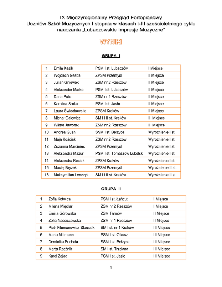 IX Międzyregionalny Przegląd Fortepianowy Uczniów Szkół Muzycznych I stopnia w klasach I-III sześcioletniego cyklu nauczania „Lubaczowskie Impresje Muzyczne” GRUPA I 1 Emila Kazik PSM I st. Lubaczów I Miejsce 2 Wojciech Gazda ZPSM Przemyśl II Miejsce 3 Julian Gniewek ZSM nr 2 Rzeszów II Miejsce 4 Aleksander Marko PSM I st. Lubaczów II Miejsce 5 Daria Puto ZSM nr 1 Rzeszów II Miejsce 6 Karolina Sroka PSM I st. Jasło II Miejsce 7 Laura Świechowska ZPSM Kraków II Miejsce 8 Michał Gałowicz SM I i II st. Kraków III Miejsce 9 Wiktor Jaworski ZSM nr 2 Rzeszów III Miejsce 10 Andrea Guan SSM I st. Bełżyce Wyróżnienie I st. 11 Maja Kościak ZSM nr 2 Rzeszów Wyróżnienie I st. 12 Zuzanna Marciniec ZPSM Przemyśl Wyróżnienie I st. 13 Aleksandra Mazur PSM I st. Tomaszów Lubelski Wyróżnienie I st. 14 Aleksandra Rosiek ZPSM Kraków Wyróżnienie I st. 15 Maciej Bryzek ZPSM Przemyśl Wyróżnienie II st. 16 Maksymilian Lenczyk SM I i II st. Kraków Wyróżnienie II st. GRUPA II 1 Zofia Kotwica PSM I st. Łańcut I Miejsce 2 Milena Międlar ZSM nr 2 Rzeszów I Miejsce 3 Emilia Górowska ZSM Tarnów II Miejsce 4 Zofia Naściszewska ZSM nr 1 Rzeszów II Miejsce 5 Piotr Filemonowicz-Skoczek SM I st. nr 1 Kraków III Miejsce 6 Maria Mittmann PSM I st. Olkusz III Miejsce 7 Dominika Puchała SSM I st. Bełżyce III Miejsce 8 Marta Rzeźnik SM I st. Trzciana III Miejsce 9 Karol Zając PSM I st. Jasło III Miejsce 1 10 Joanna Gajos PSM I st. Miechów Wyróżnienie I st. 11 Julia Kłak PSM I st. Jarosław Wyróżnienie I st. 12 Maria Kolary SM I st. Wieliczka Wyróżnienie I st. 13 Wiktoria Morawska SM I st. Kańczuga Wyróżnienie I st. 14 Piotr Sulikowski NSM I st. Leżajsk Wyróżnienie I st. 15 Bartosz Wiśliński SSM I st. Bełżyce Wyróżnienie I st. 16 Marlena Hajduk SM I st. Kańczuga Wyróżnienie II st. 17 Paulina Hejda PSM I st. Leżajsk Wyróżnienie II st. 18 Julia Iskierka PSM I st. Tomaszów Lubelski Wyróżnienie II st. 19 Maria Kołomańska ZPSM Kielce Wyróżnienie II st. 20 Borys Komisarz SM I st. Tuchów Wyróżnienie II st. 21 Szymon Majchrowicz ZPSM Przemyśl Wyróżnienie II st. 22 Martyna Wiśniowska ZPSM Przemyśl Wyróżnienie II st. 23 Oliwia Wilk PSM I st. Strzyżów Wyróżnienie II st. GRUPA III 1 Jakub Depczyński PSM I st. Jasło I Miejsce 2 Eryk Koszela ZSM nr 2 Rzeszów I Miejsce 3 Oliwia Podraza SM I st. Tuchów I Miejsce 4 Maksymilian Potępa ZSM nr 2 Rzeszów I Miejsce 5 Karolina Starzyk SM I st. Tuchów I Miejsce 6 Emilia Karp PSM I st. Jasło II Miejsce 7 Mateusz Mazurek ZPSM Przemyśl II Miejsce 8 Hanna Szaro ZSM nr 1 Rzeszów II Miejsce 9 Daniela Augustyn ZSM Tarnów III Miejsce 10 Bartosz Gołąb PSM I st. Jarosław III Miejsce 11 Agnieszka Małecka SM I i II st. Kraków III Miejsce 12 Oskar Mazur III Miejsce 13 Przemysław Religa 14 Wiktoria Ryznar PSM I st. Lubaczów PSM I st. Ostrowiec Św. PSM I st. Jasło 15 Gustaw Siepioła ZPSM Przemyśl III Miejsce 16 Zuzanna Kochel ZPSM Kielce Wyróżnienie I st. 17 Rafał Koziara PSM I st. Biłgoraj Wyróżnienie I st. 18 Michalina Kudyba ZSM nr 1 Rzeszów Wyróżnienie I st. 2 III Miejsce III Miejsce 19 Ewa Larwa PSM I st. Biłgoraj Wyróżnienie I st. 20 Adam Rębacz PSM I st. Leżajsk Wyróżnienie I st. 21 Amelia Socha ZSM Tarnów Wyróżnienie I st. 22 Oliwia Woźniak PSM I st. Strzyżów Wyróżnienie I st. 23 Julia Zegarlicka PSM I st. Lubaczów Wyróżnienie I st. 24 Maria Chojecka SM I st. Trzciana Wyróżnienie II st. 25 Michał Jabłoński ZPSM Kielce Wyróżnienie II st. 26 Karolina Leśniak PSM I st. Strzyżów Wyróżnienie II st. 27 Aneta Przeszło PSM I st. Leżajsk Wyróżnienie II st. 28 Natalia Wojdył SM I st. Ruszkowice Wyróżnienie II st. 3