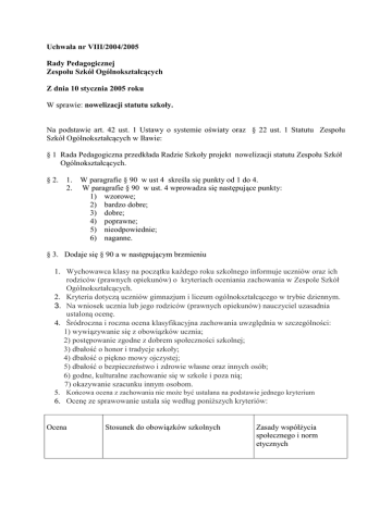 Uchwała nr VIII/2004/2005 Rady Pedagogicznej Zespołu Szkół Ogólnokształcących Z dnia 10 stycznia 2005 roku W sprawie: nowelizacji statutu szkoły. Na podstawie art. 42 ust. 1 Ustawy o systemie oświaty oraz § 22 ust. 1 Statutu Zespołu Szkół Ogólnokształcących w Iławie: § 1 Rada Pedagogiczna przedkłada Radzie Szkoły projekt nowelizacji statutu Zespołu Szkół Ogólnokształcących. § 2. 1. 2. W paragrafie § 90 w ust 4 skreśla się punkty od 1 do 4. W paragrafie § 90 w ust. 4 wprowadza się następujące punkty: 1) wzorowe; 2) bardzo dobre; 3) dobre; 4) poprawne; 5) nieodpowiednie; 6) naganne. § 3. Dodaje się § 90 a w następującym brzmieniu 1. Wychowawca klasy na początku każdego roku szkolnego informuje uczniów oraz ich rodziców (prawnych opiekunów) o kryteriach oceniania zachowania w Zespole Szkół Ogólnokształcących. 2. Kryteria dotyczą uczniów gimnazjum i liceum ogólnokształcącego w trybie dziennym. 3. Na wniosek ucznia lub jego rodziców (prawnych opiekunów) nauczyciel uzasadnia ustaloną ocenę. 4. Śródroczna i roczna ocena klasyfikacyjna zachowania uwzględnia w szczególności: 1) wywiązywanie się z obowiązków ucznia; 2) postępowanie zgodne z dobrem społeczności szkolnej; 3) dbałość o honor i tradycje szkoły; 4) dbałość o piękno mowy ojczystej; 5) dbałość o bezpieczeństwo i zdrowie własne oraz innych osób; 6) godne, kulturalne zachowanie się w szkole i poza nią; 7) okazywanie szacunku innym osobom. 5. Końcowa ocena z zachowania nie może być ustalana na podstawie jednego kryterium 6. Ocenę ze sprawowanie ustala się według poniższych kryteriów: Ocena Stosunek do obowiązków szkolnych Zasady współżycia społecznego i norm etycznych Wzorowe Bardzo dobre Sumiennie wywiązuje się z obowiązków szkolnych; wykonuje zadania domowe; bierze udział w pracach klasowych; jest aktywny podczas zajęć; uczestniczy w konkursach lub zawodach szkolnych i środowiskowych; szanuje mienie szkolne i pomoce dydaktyczne; aktywnie uczestniczy w życiu klasy i szkoły oraz godnie ją reprezentuje; w pełni przestrzega wewnątrzszkolnych regulaminów; nie ma opuszczonych nieusprawiedliwionych godzin lekcyjnych; wykonuje prace nadobowiązkowe na rzecz szkoły; dba o honor i tradycję szkoły; nie spóźnia się na lekcje; Kulturalnie zachowuje się na terenie szkoły i poza nią; dba o kulturę słowa własną i innych; szanuje poglądy innych; okazuje bezinteresowną pomoc koleżeńską; nie ulega nałogom; dba o higienę osobistą; przeciwstawia się agresywnym i niewłaściwym zachowaniom; udziela się społecznie; Wywiązuje się z obowiązków szkolnych; wykonuje prace domowe; bierze udział w pracach klasowych; aktywnie uczestniczy w zajęciach; przestrzega wewnątrzszkolnych regulaminów; bierze udział w konkursach szkolnych; szanuje mienie szkolne i pomoce dydaktyczne; dba o honor i tradycję szkoły; ma maksymalnie 5 opuszczonych, nieusprawiedliwionych godzin lekcyjnych; zdarzają mu się nieliczne spóźnienia na lekcje; Kulturalnie zachowuje się na terenie szkoły i poza nią; dba o kulturę słowa; szanuje przekonania innych; jest koleżeński i uczynny; nie dopuszcza się agresywnych czy brutalnych zachowań; nie ulega nałogom; dba o higienę osobistą; nie ma uwag o niewłaściwym zachowaniu Wywiązuje się z obowiązków szkolnych; bierze udział w pracach klasowych; szanuje mienie szkolne i pomoce dydaktyczne; zdarzają mu się uchybienia wobec wewnątrzszkolnych regulaminów; stara się dbać o honor i tradycję szkoły; ma maksymalnie 10 opuszczonych nieusprawiedliwionych godzin lekcyjnych; rzadko spóźnia się na lekcje; Kulturalnie zachowuje się na terenie szkoły; szanuje poglądy innych ludzi; stara się używać kulturalnego języka; nie wywołuje konfliktów z innymi; stara się nie ulegać nałogom; ma pojedyncze uwagi o niewłaściwym zachowaniu; Stara się wywiązywać z obowiązków szkolnych; bierze bierny udział w zajęciach szkolnych; stara się przestrzegać wewnątrzszkolnych regulaminów; zdarza mu się postępować wbrew tradycji szkoły; nie zawsze postępuje zgodnie z dobrem społeczności szkolnej; ma maksymalnie 15 opuszczonych godzin nieusprawiedliwionych; dość często spóźnia się na lekcje; Zdarza mu się zachowywać w sposób niekulturalny; zdarza mu się używać wulgaryzmów; czasami prowokuje konflikty; czasami okazuje brak szacunku innym ludziom; nie ulega nałogom; ma niewiele uwag o niewłaściwym zachowaniu; zdarza mu się nie dbać o higienę osobistą; Nieodpowiednie Nie w pełni wywiązuje się z obowiązków szkolnych; bierze bierny udział w zajęciach; czasami przeszkadza w prowadzeniu zajęć niekiedy unika prac klasowych; dopuszcza się uchybień wobec wewnątrzszkolnych regulaminów; postępuje wbrew tradycji szkoły; naraża na uszczerbek dobre imię szkoły; ma maksymalnie 25 godzin opuszczonych nieusprawiedliwionych; często spóźnia się na lekcje; Naganne Lekceważy obowiązki szkolne; przeszkadza w prowadzeniu zajęć; unika prac klasowych; niszczy mienie szkolne; nie przestrzega wewnątrzszkolnych regulaminów; dopuszcza się wybryków chuligańskich na terenie szkoły i poza nią; naraża na uszczerbek dobre imię szkoły; ma więcej niż 25 godzin nieusprawiedliwionych; często spóźnia się na lekcje; Zdarza mu się zachowywać w sposób niekulturalny; prowokuje konflikty z innymi; zdarzają mu się zachowania agresywne; jest arogancki; kłamie; ulega nałogom; ma liczne uwagi o niewłaściwym zachowaniu; nie dba o higienę osobistą; Dobre Poprawne §4 Wykonanie uchwały powierza się dyrektorowi szkoły. Zachowuje się w sposób niekulturalny; jest arogancki; prowokuje konflikty z innymi; używa wulgarnego języka; popełnia wykroczenia lub dopuszcza się czynów przestępczych; kłamie; ulega nałogom; ma wiele uwag o niewłaściwym zachowaniu; §5 Uchwała wchodzi w życie z dniem uchwalenia . Podpis Przewodniczącego rady pedagogicznej