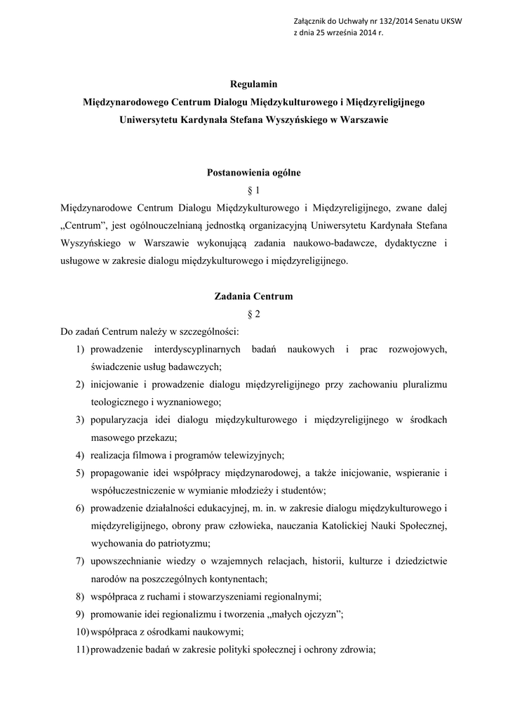 Załącznik do Uchwały nr 132/2014 Senatu UKSW z dnia 25 września 2014 r. Regulamin Międzynarodowego Centrum Dialogu Międzykulturowego i Międzyreligijnego Uniwersytetu Kardynała Stefana Wyszyńskiego w Warszawie Postanowienia ogólne §1 Międzynarodowe Centrum Dialogu Międzykulturowego i Międzyreligijnego, zwane dalej „Centrum”, jest ogólnouczelnianą jednostką organizacyjną Uniwersytetu Kardynała Stefana Wyszyńskiego w Warszawie wykonującą zadania naukowo-badawcze, dydaktyczne i usługowe w zakresie dialogu międzykulturowego i międzyreligijnego. Zadania Centrum §2 Do zadań Centrum należy w szczególności: 1) prowadzenie interdyscyplinarnych badań naukowych i prac rozwojowych, świadczenie usług badawczych; 2) inicjowanie i prowadzenie dialogu międzyreligijnego przy zachowaniu pluralizmu teologicznego i wyznaniowego; 3) popularyzacja idei dialogu międzykulturowego i międzyreligijnego w środkach masowego przekazu; 4) realizacja filmowa i programów telewizyjnych; 5) propagowanie idei współpracy międzynarodowej, a także inicjowanie, wspieranie i współuczestniczenie w wymianie młodzieży i studentów; 6) prowadzenie działalności edukacyjnej, m. in. w zakresie dialogu międzykulturowego i międzyreligijnego, obrony praw człowieka, nauczania Katolickiej Nauki Społecznej, wychowania do patriotyzmu; 7) upowszechnianie wiedzy o wzajemnych relacjach, historii, kulturze i dziedzictwie narodów na poszczególnych kontynentach; 8) współpraca z ruchami i stowarzyszeniami regionalnymi; 9) promowanie idei regionalizmu i tworzenia „małych ojczyzn”; 10) współpraca z ośrodkami naukowymi; 11) prowadzenie badań w zakresie polityki społecznej i ochrony zdrowia; 12) podjęcie wielofunkcyjnej współpracy międzynarodowej. Sposoby działania Centrum §3 1. Centrum realizuje swoje zadania poprzez: 1) prowadzenie prac badawczych; 2) współpracę ze środowiskiem gospodarczym w zakresie badań naukowych; 3) współpracę z krajowymi i zagranicznymi instytucjami naukowymi, kulturalnymi, gospodarczymi; 4) rozwijanie międzynarodowej współpracy naukowej przez prowadzenie projektów badawczych wspólnie z partnerami zagranicznymi. 2. Zadania, o których mowa w ust. 1, realizuje Koordynator wraz z Zespołem współpracowników. Struktura Centrum §4 1. Pracami Centrum kieruje Koordynator. 2. Koordynator jest powoływany i odwoływany przez Rektora na czas kadencji władz rektorskich. 3. Do zadań Koordynatora należy w szczególności: 1) przygotowywanie planów działalności Centrum; 2) opracowywanie projektów badawczych, dydaktycznych i innych; 3) podejmowanie działań na rzecz pozyskiwania zamówień i środków finansowych dla Centrum; 4) promocja działalności Centrum; 5) przedkładanie sprawozdań z działalności Centrum; 6) określenie zakresu obowiązków członków i pracowników Centrum. 4. Koordynator jest bezpośrednim przełożonym pracowników administracyjnych Centrum, którzy wchodzą w skład sekretariatu Centrum i zapewniają jego obsługę administracyjną. §5 1. W Centrum działa Zespół współpracowników, zwany dalej „Zespołem”, złożony z pracowników naukowych i naukowo-dydaktycznych UKSW. 2. Koordynator Centrum może zwrócić się do właściwego dziekana z wnioskiem o oddelegowanie do pracy w Centrum do 4 pracowników naukowych lub naukowodydaktycznych specjalizujących się w problematyce z zakresu dialogu międzykulturowego i międzyreligijnego, za ich zgodą i zgodą bezpośrednich przełożonych. 3. Oddelegowanie może dotyczyć wykonywania obowiązków naukowych, dydaktycznych i organizacyjnych. 4. Skład Zespołu i powoływanie poszczególnych jego członków następuje na okres kadencji Koordynatora Centrum. 5. Koordynator i koordynuje działalność wewnętrzną Zespołu. 6. Zespół współpracowników zobowiązany jest do współpracy z Koordynatorem i do współdziałania z nim w wykonywaniu zadań, w szczególności w zakresie opracowywania projektów badawczych, dydaktycznych i innych. 7. Koordynator może tworzyć podzespoły w celu wykonywania powierzonych im zadań. 8. Dla potrzeb oceny parametrycznej, wyniki badań naukowych, w tym realizowanych projektów badawczych, są przypisywane właściwym wydziałom. §6 1. W Centrum działa Rada Programowa, zwana dalej „Radą”, na której czele stoi przewodniczący Rady, którym jest prorektor powołany przez Rektora, na czas kadencji władz rektorskich. 2. Rada pełni rolę organu sprawującego nadzór nad działalnością Centrum. 3. W skład Rady, oprócz przewodniczącego, wchodzą: 1) Koordynator, 2) po jednym samodzielnym pracowniku naukowo-dydaktycznym lub naukowym z każdego wydziału, wskazanym przez radę wydziału, innym niż współpracownicy wchodzący w skład Zespołu, o którym mowa § 5. 4. Posiedzenia Rady odbywają się co najmniej dwa razy do roku. 5. Do zadań Rady należy: 1) inspirowanie i pomoc w określaniu kierunków działalności Centrum, 2) zatwierdzanie programu działalności Centrum na okres jednego roku, 3) przyjmowanie sprawozdań z działalności Centrum. 6. Nieprzyjęcie przez Radę sprawozdania, o którym mowa w ust. 5 pkt 3, skutkuje wstrzymaniem środków będących w dyspozycji Centrum. Sposoby finansowania Centrum §7 Działalność Centrum może być finansowana w szczególności z: 1) środków wyodrębnionych z funduszu centralnego, zgodnie z zarządzeniem Rektora UKSW dotyczącym gospodarki finansowej UKSW; 2) środków pozyskanych z projektów badawczych, dydaktycznych i innych; 3) darowizn; 4) środków pozyskanych od sponsorów, 5) środków współorganizatorów przedsięwzięć, o których mowa w § 3 ust. 1. Postanowienia przejściowe i końcowe §8 Obecny Koordynator Centrum pełni swoją funkcję do końca kadencji władz rektorskich, wybranych na lata 2012-2016.