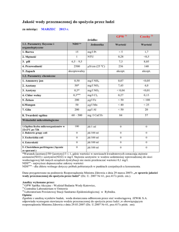 Jakość wody przeznaczonej do spożycia przez ludzi za miesiąc: MARZEC 2013 r. GPW 1) Czechy 2) Wartość Wartość źródło: 1.1. Parametry fizyczne i organoleptyczne NDS** Jednostka 1. Barwa 15 mg/l Pt <5 1,7 2. Mętność 1 NTU 0,28 <0,5 7,3 8,05 236 140 akcept. akcept. 3. pH 4. Przewodność 5. Zapach 6,5 – 9,5 2500 µS/cm (25 ºC) akceptowalny 1.2. Parametry chemiczne 1. Amonowy jon 0,50 mg/l NH4 0,07 <0,05 2. Azotany 50* mg/l NO3 7,45 4,0 3. Azotyny 0,5* mg/l NO2 < 0,04 <0,01 0,3*** mg/l Cl2 0,27 0,13 5. Żelazo 200 µg/l Fe < 50 < 100 6.Mangan 50 µg/l Mn < 40 < 25 7. Glin 200 µg/l Al < 50 20 84 57 jtk/1 ml 0 0 0 jtk/100 ml 0 0 3. Escherichia coli 0 jtk/100 ml 0 0 4. Enterokoki 0 jtk/100 ml 0 0 5. Clostridium perfringens ( łącznie ze sporami ) 0 jtk/100 ml 0 0 4. Chlor wolny 8. Twardość ogólna 60 – 500 mg /l CaCO3 Wskaźniki mikrobiologiczne 1.Ogólna liczba mikroorganizmów w 22±2ºC po 72h 2. Bakterie grupy coli 100 *Warunek:[azotany]/50+[azotyny]/3 ≤ 1, gdzie wartości w nawiasach kwadratowych oznaczają stężenie azotanów(NO3) i azotynów(NO2) w mg/l. Stężenie azotynów w wodzie uzdatnionej wprowadzonej do sieci wodociągowej lub innych urządzeń dystrybucji nie może przekraczać wartości 0,1 mg/l. NDS** - najwyższe dopuszczalne zakresy wartości NDS*** - dla chloru wolnego dotyczy próbek pobieranych w punktach czerpalnych u konsumenta. Dane przygotowano na podstawie Rozporządzenia Ministra Zdrowia z dnia 29 marca 2007r „w sprawie jakości wody przeznaczonej do spożycia przez ludzi” (Dz. U. 2007 Nr 61, poz.417z późń. zm.). Analizy wykonane przez: 1) GPW Spółka Akcyjna - Wydział Badania Wody Katowice, 2) Centralne Laboratorium w Ostrawie 3) Laboratorium Powiatowej Stacji Sanitarno-Epidemiologicznej w Rybniku. Opinia: Zgodnie z analizą wyników badań, woda dostarczana odbiorcom przez sieć wodociągową JZWiK S.A. odpowiada wymogom stawianym wodzie przeznaczonej do spożycia przez ludzi ,w obowiązującym rozporządzeniu Ministra Zdrowia z dnia 29.03.2007 (Dz. U.2007 Nr 61, poz.417z późń. zm).