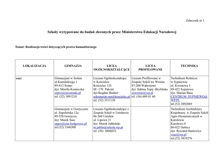 Załacznik nr 1 Szkoły wytypowane do badań zleconych przez Ministerstwo Edukacji Narodowej Temat: Realizacja treści dotyczących prawa humanitarnego LOKALIZACJA wieś LICEA OGÓLNOKSZTAŁCĄCE LICEA PROFILOWANE TECHNIKA Gimnazjum w Sośnie ul.Kamińskiego 1 89-412 Sośno dyr. Mirella Konieczka [email protected] tel. (52) 3891210 Liceum Ogólnokształcące w Kościelcu Kościelec 125 88 -170 Pakość dyr.Bogdan Budner [email protected] tel. (52) 3511130 Liceum Profilowane w Zespole Szkół we Wroniu 87-200 WąbrzeŜno dyr. Sabina Topij -Brylińska [email protected] tel. (56) 689 01 60 Technikum Rolnicze w Sypniewie ul. Kwiatowa 3 89-422 Sypniewo dyr. Marian Basa CENTRUM_SYPNIEWO@ WP.PL tel (52) 3892069 Gimnazjum w Gostycynie ul. Sepoleńska 12a 89-520 Gostycyn dyr. Marek Sass [email protected] tel.(52) 3346308 Liceum Ogólnokształcące z Zespole Szkół w Unisławiu 86-260 Unisław ul. Lipowa 31 dyr. Marek Jabłoński [email protected] tel. (56) 6866032 GIMNAZJA Technikum Architektury Krajobrazu w Zespole Szkół Agro-Ekonomicznych w Karolewie Karolewo 8 86-022 Dobrcz dyr. Ryszard Haniewicz [email protected] tel.(52) 3819276 Gimnazjum w Chwaliszewie 89-240 Kcnia dyr. Marek Szaruga [email protected] tel. (52) 5893755 Technikum śywności i Gospodarstwa Domowego w Zespole Szkół Ponadgimnazjalnych Kościelec 125 88-170 Pakość dyr.Bogdan Budner [email protected] tel. (52) 3511130 Gimnazjum w Rogowie ul. Szkolna 7 88-420 Rogowo dyr. Eliza Reszka [email protected] .pl tel. (52) 3024065 Technikum w Zespole Szkół Centrum Kształcenia Ustawicznego w Gronowie 87-162 Lubicz dyr. Zbigniew Piotrowski [email protected] tel. (56) 678 41 18 Gimnazjum w Bielicach Bielice 1 88-330 Gębice dyr. Hieronim Nanaszkiewicz [email protected] tel. (52) 3155960 Technikum w Zespole Szkół Centrum Kształcenia Praktycznego w Grubnie 86-212 Stolno dyr. Jan Went [email protected] tel. (56) 686 21 78 Gimnazjum w Michalu Michale 101 a 86-134 Dragacz dyr. Honorata Puzio [email protected] tel. (52) 3325179 Technikum w Zespole Szkół nr 4 w NadroŜu 87-500 Rypin dyr. Jerzy Misiak [email protected] Gimnazjum w Świekatowie ul. Dworcowa 20 a 86-182 Świekatowo dyr. Bogusław Bykowski [email protected] t.pl tel. (52) 3322414 Gimnazjum w Sławęcinku Sławęcinek 12 88-100 Inowrocławiu dyr. Robert Orczykowski gminne.gimnazjum@neostra da.pl tel. (52) 3572459 Gimnazjum w śalinowie śalinowo 7 88-100 Inowrocław dyr. Zofia Sawicka [email protected] tel. (52) 3537596 Gimnazjum w Dobrczu ul. Długa 33 86-022 Dobrcz dyr. Zinaida Ignaczak [email protected] tel. (52) 3818926 Gimnazjum w Sicienku ul. Bydgoska 8 86-014 Sicienko dyr. Beata Szczęśniak [email protected] tel.(52) 5870569 Gimnazjum w Białych Błotach ul.Czysta 1 a 86-005 Białe Błota dyr. Zdzisław Napora [email protected] tel. (52) 3814777 Gimnazjum w Grucie 86-327 Gruta dyr.Marzena Samborska [email protected]. tel. (56) 4683113 Gimnazjum w Świeciu n/Osą 86-341 Świecie n/Osą dyr. Barbara Dziarkowska [email protected] tel. (56) 4661633 Gimnazjum w Rudzie 86-302 Grudziądz 4 dyr. Mariusz Tomczyk [email protected] tel. (56) 4682628 Gimnazjum w Kijewie Królewskim 86-253 Kijewo Królewskie 61 dyr. Dorota Szlosek [email protected] tel. (56) 6867001 Gimnazjum w Ryńsku 87-213 Ryńsk ul. Szkolna 4 dyr. Dorota Grabowska [email protected] tel. (56) 6885282 Gimnazjum w Pluskowęsach 87-140 Pluskowęsy dyr. Hanna Antkowiak [email protected] tel. (56) 6753568 Gimnazjum nr 1 w Obrowie 87-126 Obrowo ul. Szkolna 152 b dyr. Artur Affelt [email protected] tel. (56) 6747030 Gimnazjum w Łysomicach 87-148 Łysomice dyr. Hanna Rucińska [email protected] tel. (56) 6783223 Gimnazjum w Cierpicach 87-165 Cierpice ul. Szkolna 9 dyr. Dorota Masłowska [email protected] tel. (56) 6787993 Gimnazjum w Zespole Szkół w Złejwsi Wielkiej 87-134 Zławieś Wielka ul. Szkolna 6 dyr. Robert SwiontekBrzezinski [email protected] tel (56) 678 09 27 Publiczne Gimnazjum w Radzikach DuŜych 87-337 Wąpielska dyr. Leszek Stefański radziki_gimnazjum@poczta. onet.pl tel.(56) 4938295 Publiczne Gimnazjum w Skibinie 88-200 Radziejów dyr. Halina Nowak [email protected] tel (54) 2853273 Publiczne Gimnazjum w Dobrem 88-210 Dobre ul. Szkolna 9a dyr. Wiesław Bogdański [email protected] tel. (54) 2850987 Publiczne Gimnazjum w Zespole Szkół w Zbrachlinie 87-731 Waganiec dyr. Violetta Smulska [email protected] tel. (54) 2830900 Publiczne Gimnazjum w Bądkowie 87-704 Bądkowo ul.Włocławska 82 dyr. Ryszard Stępkowski gimbą[email protected] tel. (54) 2724051 Publiczne Gimnazjum w Grabkowie Grabkowo 51 87-820 Grabkowo dyr. Marek Trzebuchowski [email protected] tel.(54) 2842251 Publiczne Gimnazjum w Fabiankach 87-811 Fabianki dyr. Grzegorz Wojciechowski szkoła@gimnazjumfabianki. wlocl.pl tel. (54) 2516718 miasto do 20 tys. Gimnazjum w Strzelnie ul. Gimnazjalna 17 88-320 Strzelno dyr. Maria Świdowska [email protected] tel. (52) 3189577 Liceum Ogólnokształcące w Więcborku ul. Pocztowa 14a 89-410 Więcbork dyr. Małgorzata Mucha [email protected] tel (52) 3897066 Liceum Profilowane w ZSP w Sępólnie Krajeńskim ul. Przemysłowa 15 89-400 Sępólno Krajńskie dyr. Eugeniusz Szwochert [email protected] tel. (52) 3882107 Technikum Leśnie w Zespole Szkół Leśnych ul. Nowodworskiego 9-13 89-500 Tuchola dyr. Aniela CzyŜyk [email protected] tel. (52) 3348661 Gimnazjum nr 1 w Szubinie ul. Św. Marcina 11 89-200 Szubin dyr. Lidia Stasiak gimnazjum1.szubin@neostra da.pl tel. (52) 3842119 Liceum Ogólnokształcące w Solcu Kujawskim ul. 23 Stycznia 13 86-050 Solec Kujawski dyr. Grzegorz Gaca [email protected] tel. (52) 3871309 Liceum Profilowane w Zespole Szkół nr 2 w Golubiu-Dobrzyniu 87-400 Golub-Dobrzyń ul. Kilińskiego 31 dyr. Grzegorz RóŜański [email protected] tel. (56) 6834707 Technikum Ekonomiczne w Zespole Szkół Ekonomicznych i Handlowych ul. Śniadeckich 18 88-400 śnin dyr. Tomasz Ratajczak [email protected] tel. (52) 3031558 Gimnazjum w Nowem ul.Nowa 2 86-170 Nowe dyr. Maria Gappa [em