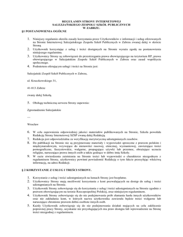 REGULAMIN STRONY INTERNETOWEJ SALEZJAŃSKIEGO ZESPOŁU SZKÓŁ PUBLICZNYCH W ZABRZU. §1 POSTANOWIENIA OGÓLNE 1. Niniejszy regulamin określa zasady korzystania przez Użytkowników z informacji i usług oferowanych 2. 3. 4. na Stronie Internetowej Salezjańskiego Zespołu Szkół Publicznych w Zabrzu zwanej dalej w skrócie Stroną. Użytkownik korzystając z usług i treści dostępnych na Stronie wyraża zgodę na postanowienia niniejszego regulaminu. Użytkownicy Strony są zobowiązani do przestrzegania prawa obowiązującego na terytorium RP, prawa obowiązującego w Salezjańskim Zespole Szkół Publicznych w Zabrzu oraz zasad współżycia społecznego. Podmiotem oferującym usługi i treści na Stronie jest: Salezjański Zespół Szkół Publicznych w Zabrzu, ul. Kruczkowskiego 31, 41-813 Zabrze zwany dalej Szkołą. 5. Obsługę techniczną serwera Strony zapewnia: Zgromadzenie Salezjańskie --Wrocław 6. W celu zapewnienia odpowiedniej jakości materiałów publikowanych na Stronie, Szkoła powołała Redakcję Strony Internetowej SZSP zwaną dalej Redakcją. 7. Redakcja jest odpowiedzialna za weryfikację merytoryczną udostępnianych zasobów. 8. Do publikacji na Stronie nie są przyjmowane materiały i wypowiedzi sprzeczne z prawem polskim i 9. międzynarodowym, wzywające do nienawiści rasowej, etnicznej, wyznaniowej, zawierające treści pornograficzne, faszystowskie, wulgarne, propagujące używki lub przemoc, obrażające uczucia religijne, naruszające prawa innych osób a także godzące w dobre imię Szkoły. W razie stwierdzenia zaistnienia na Stronie treści lub wypowiedzi o charakterze niezgodnym z regulaminem Strony, użytkownicy powinni powiadomić Redakcję o tym fakcie przesyłając właściwą informację, na adres Redakcji. § 2 KORZYSTANIE Z USŁUG I TREŚCI STRONY. 1. Korzystanie z usług i treści udostępnianych na łamach Strony jest bezpłatne. 2. Użytkownicy Strony mają możliwość korzystania z kont pozwalających na dostęp do usług i treści 3. 4. 5. udostępnianych na Stronie. Użytkownik Strony zobowiązuje się do korzystania z usług i treści udostępnianych na Stronie zgodnie z prawem obowiązującym na terenie Rzeczpospolitej Polskiej, oraz niniejszym regulaminem. Użytkownik Strony zobowiązuje się do nie podejmowania prób złamania hasła innych użytkowników oraz nie zakładania kont, w których nazwa użytkownika zawierała będzie treści wulgarne lub naruszające chronione prawem dobra osobiste innych osób. Każdy Użytkownik zobowiązuje się do nie podejmowania działań mających na celu zakłócenie poprawnej pracy Strony, uzyskanie nie przysługujących mu praw dostępu lub wprowadzenie na Stronę treści niezgodnej z regulaminem. 6. W przypadku wykorzystywania konta w sposób sprzeczny z postanowieniami niniejszego regulaminu, konto zostanie niezwłocznie zamknięte. 7. Zakładając konto użytkownik potwierdza, że zapoznał się z treścią regulaminu i wyraża zgodę na wszystkie jego postanowienia. 8. Redakcja zastrzega sobie prawo wstrzymania lub zaprzestania świadczenia wybranych usług 9. 10. dostępnych na Stronie. Użytkownikom nie przysługuje z tego tytułu żadne roszczenie. Szkoła zastrzega sobie prawo do okresowego zawieszenia funkcjonowania konta bez wcześniejszego powiadomienia o tym fakcie. Redakcja wprowadza rozróżnienie pomiędzy Użytkownikami Wewnętrznymi Strony a Użytkownikami Zewnętrznymi Strony. I. Użytkownicy Wewnętrzni. 1. Użytkownikiem Wewnętrznym Strony może być tylko: członek wspólnoty salezjanów p.w. Św. Dominika Savio w Zabrzu, Nauczyciel Szkoły, Uczeń Szkoły, Rodzic lub Opiekun Ucznia Szkoły, Pracownik Szkoły, Absolwent Szkoły. 2. Założenie konta oznacza zarejestrowanie użytkownika na Stronie czyli nadanie mu loginu, hasła. 3. Użytkownik Wewnętrzny ma prawo do zmiany loginu. 4. Redakcja nie bierze odpowiedzialności za problemy wynikłe z udostępnienia przez Użytkownika Wewnętrznego, hasła do swojego konta innym osobom. 5. Redakcja Strony ma możliwość tworzenia różnych grup Użytkowników Wewnętrznych i przydzielania im określonych uprawnień dotyczących przeglądania zasobów Strony lub zamieszczania na Stronie własnych materiałów. 6. Użytkownik Wewnętrzny odpowiada za wszystkie treści jakie zamieszcza na Stronie, na takich samych zasadach, jakie określają jego miejsce i zadania w Szkole. II. Użytkownicy Zewnętrzni. 1. Użytkownikiem Zewnętrznym Strony może być każdy użytkownik internetu 2. Użytkownik Zewnętrzny Strony ma możliwość założenia własnego konta. pozwalającego na dostęp do usług i treści przeznaczonych dla użytkowników zewnętrznych. 3. Użytkownik Zewnętrzny Strony podaje wymagane przez formularz rejestracyjny swoje dane osobowe na zasadzie dobrowolności. Udostępnienie niektórych z tych danych jest wymagane ze względu na specyfikę świadczenia wybranych usług Strony. § 3 FORUM DYSKUSYJNE I KOMENTARZE 1. Szkoła umożliwia Użytkownikom Strony nieodpłatne korzystanie z mechanizmów forum, oraz 2. 3. 4. 5. 6. komentarzy w celu wymiany informacji, poglądów i opinii użytkowników. Użytkownicy forum korzystają z mechanizmów forum i komentarzy na zasadach określonych przez niniejszy regulamin oraz na zasadach, które określają relację w jakiej dany użytkownik pozostaje wobec Szkoły. Niedopuszczalne jest umieszczanie treści propagujących przemoc oraz nienawiść rasową, religijną oraz etniczną Niedopuszczalne jest publikowanie treści zawierających słowa i wyrażenia uznane powszechnie za obraźliwe lub wulgarne. Niedopuszczalne jest publikowanie treści godzących w dobre imię Szkoły, innych Użytkowników Strony oraz osób trzecich. Niedopuszczalne jest umieszczanie treści zawierających przekazy reklamowe. 7. Redakcja zastrzega sobie prawo do tworzenia różnych forów tematycznych i nadawania różnym grupom użytkowników odpowiednich praw dostępu do tych forów. 8. Redakcja u