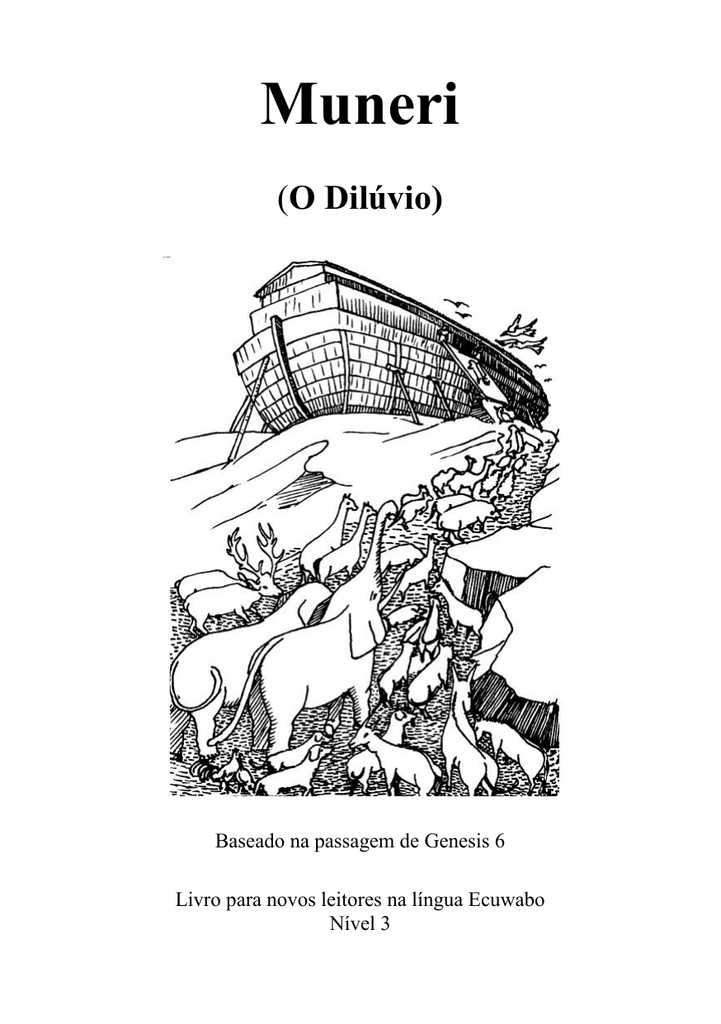 Muneri (O Dilúvio) Baseado na passagem de Genesis 6 Livro para novos leitores na língua Ecuwabo Nível 3 Ilustrações utilizadas com a permissão do artista. O livro foi publicado originalmente, em várias línguas do Perú. Ficha Técnica Título: Muneri (O Dilúvio) (The Flood) Língua: Echuwabo Artista: Jorge Figueroa Rodríguez Ilustrações: SIL- Peru Primeira edição electrónica, 2010 Produzido por: Wycliffe SA [email protected] C.P. 652 Nampula, Nampula Moçambique O utilizador pode copiar e distribuir a obra Versão experimental Elabo yahinjiva attu abure. Mulugu bohona dhetedhene. Attu otene anfuna okosa dhabure. Dhahene Mulugu wanyonyeya baloga: - Ddinfuna dditoloce elabo yotene. Ddinonge dhotedhene dhipanddile miyo. Attu, vinama, mpaka balame dha odhulu. Dhikwe! Dhotedhene sabure. 3 Versão experimental Mulugu onfwanya mulobwana mmodha waderetu. Iyene osasanya ebuwa ya Nabuya. Nowe wanimutamahala Nabuya Mulugu waye. 4 Versão experimental Mulugu omwaddela Nowe: - Ddinowanonga attu na vinama dha vati. Awene babure vaddiddi. Omusasanye paporo munddimuwa. Ddinele ohuvuna weyo vamodha na amudhaho mpaporoni. Onele orubwa muzogwe vaddiddi. Manje anele odhala vati vetevene. Onakale muneri wa manje vati. Ddinononga dhotedhene dhili vati. 5 Versão experimental - Weyo Nowe osakule vinama dhotedhene pogo na mukolo. Odhowena vamodha. Ottukule misapo dhotedhene dhinja attu na vinama. Mulugu oruma okosa. Nowe okosa yakakene. 6 Versão experimental Nowe na mwadhihe avolowa mpaporoni. Anahe araru, na awadhiwa vina aivolowa. Amfedhela malabo matano na meli. Muneri oroma mwilaboni. Orubwa malabo makumi manai amutana makumi manai a mattiyu. 7 Versão experimental Nowe na amudhahe avuneya. Ena afiyedha okwa. Vinama dhotedhene dhali otakulo wa paporo dhikwa. 8 Versão experimental Nowe, amudhahe na vinama mpaporoni aikalawo. Manje agonela vati malabo zana na makumi matanu. 9 Versão experimental Mmalele mudhidhi obu manje aivuguwa. Nlabo nimodha Nowe wafugula janela na Paporo. Iyene omburuca nyakungu. Afuna one akala manje awuma. Nyakungu beyela. Balame kihonile mattaka Mudhidhi mwina Nowe oruma kangahiwa. Kangahiwa kifwanyile mattaka ohuma. 10 Versão experimental Nowe ojedha midhidhi minji. Oruma kangahiwa dila ya nawili. Iyele ciguwo na ntaba omulomoni. Nowe otapula nlada. Ottidda kangahiwa bavolociya. Iyene ojedha sumana. Baruma kangahiwa mudhidhi mwina. Mmalele kangahiwa kiyele. 11 Versão experimental Ahikalamo mpaporoni mudhidhi mwijene. Mulugu ologana Nowe: - Kabudduwa mpaporoni. Kamuttukule mwadhiho, anaho, na awenyaho. Nowe obudduwa na amudhe. Mbudduwele awene vinama dhotedhene dhibudduwa. 12 Versão experimental Nowe wali woziveliwene. Omutamala Mulugu. Iyene okosa ebuwa ya Mulugu. Onvaya Mulugu mukutto munddimuwa. Opa dhinama amulremezagana Mulugu, baddumeya dhinama dhokoddela na balame dhokoddela va ebuwani. 13 Versão experimental Nabuya ohona mukutto. Mulugu waziveliwa. Baloga na mmirimani mwahe: - Cipo kaddingujula elabo vina na manje. Ddinokosa ezinddiyelo enabudduwege mmiraboni (muceka wa Mulugu). Ezinddiyelo mwa miyo na nyuwo oliwo. Cipo kaddingujula vina elabo na manje. Ddiganubuwela epikilrele miyo. 14 Versão experimental Mulugu ologa dhahi: - Elabo enokalawo enokana misapo. Enele oridha, enoviya, enokana elimwe, maiza, omutana na omattiyu. Mavuzo: 1. Bani mulobwana woneyilena oderetu vamentoni va Mulugu? 2. Vaani wavuneyile mudhidhi wa muneri? 3. Awene athawele uvi? 4. Balame gani yaromile oruma Nowe? 5. Nlagano gani na logile Mulugu? 15 Versão experimental