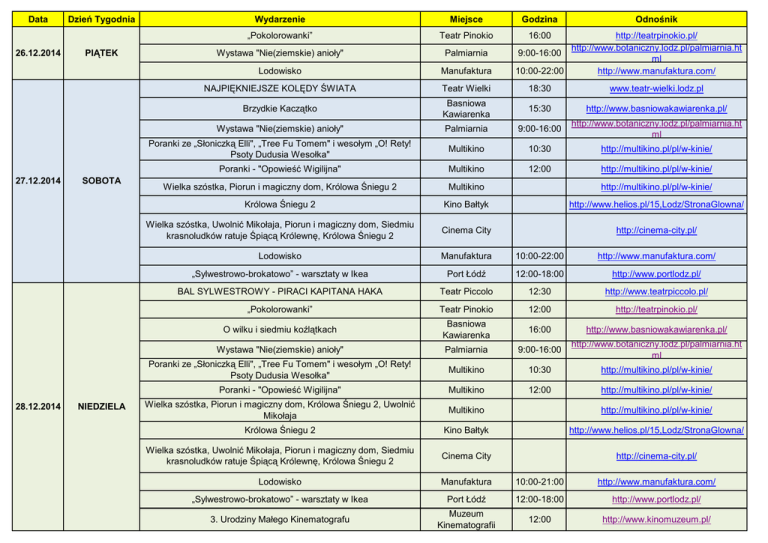 Data 26.12.2014 27.12.2014 28.12.2014 Dzień Tygodnia PIĄTEK SOBOTA NIEDZIELA Wydarzenie Miejsce Godzina Odnośnik „Pokolorowanki” Teatr Pinokio 16:00 Wystawa "Nie(ziemskie) anioły" Palmiarnia Lodowisko Manufaktura NAJPIĘKNIEJSZE KOLĘDY ŚWIATA Teatr Wielki 18:30 www.teatr-wielki.lodz.pl Brzydkie Kaczątko Basniowa Kawiarenka 15:30 http://www.basniowakawiarenka.pl/ Wystawa "Nie(ziemskie) anioły" Palmiarnia 9:00-16:00 Poranki ze „Słoniczką Elli", „Tree Fu Tomem" i wesołym „O! Rety! Psoty Dudusia Wesołka" http://www.botaniczny.lodz.pl/palmiarnia.ht ml Multikino 10:30 http://multikino.pl/pl/w-kinie/ Poranki - "Opowieść Wigilijna" Multikino 12:00 http://multikino.pl/pl/w-kinie/ Wielka szóstka, Piorun i magiczny dom, Królowa Śniegu 2 Multikino http://multikino.pl/pl/w-kinie/ Królowa Śniegu 2 Kino Bałtyk http://www.helios.pl/15,Lodz/StronaGlowna/ Wielka szóstka, Uwolnić Mikołaja, Piorun i magiczny dom, Siedmiu krasnoludków ratuje Śpiącą Królewnę, Królowa Śniegu 2 Cinema City http://cinema-city.pl/ Lodowisko Manufaktura 10:00-22:00 http://www.manufaktura.com/ „Sylwestrowo-brokatowo” - warsztaty w Ikea Port Łódź 12:00-18:00 http://www.portlodz.pl/ BAL SYLWESTROWY - PIRACI KAPITANA HAKA Teatr Piccolo 12:30 http://www.teatrpiccolo.pl/ „Pokolorowanki” Teatr Pinokio 12:00 http://teatrpinokio.pl/ O wilku i siedmiu koźlątkach Basniowa Kawiarenka 16:00 http://www.basniowakawiarenka.pl/ Wystawa "Nie(ziemskie) anioły" Palmiarnia 9:00-16:00 Poranki ze „Słoniczką Elli", „Tree Fu Tomem" i wesołym „O! Rety! Psoty Dudusia Wesołka" http://www.botaniczny.lodz.pl/palmiarnia.ht ml Multikino 10:30 http://multikino.pl/pl/w-kinie/ Poranki - "Opowieść Wigilijna" Multikino 12:00 http://multikino.pl/pl/w-kinie/ Wielka szóstka, Piorun i magiczny dom, Królowa Śniegu 2, Uwolnić Mikołaja Multikino http://multikino.pl/pl/w-kinie/ Królowa Śniegu 2 Kino Bałtyk http://www.helios.pl/15,Lodz/StronaGlowna/ Wielka szóstka, Uwolnić Mikołaja, Piorun i magiczny dom, Siedmiu krasnoludków ratuje Śpiącą Królewnę, Królowa Śniegu 2 Cinema City http://cinema-city.pl/ Lodowisko Manufaktura 10:00-21:00 http://www.manufaktura.com/ „Sylwestrowo-brokatowo” - warsztaty w Ikea Port Łódź 12:00-18:00 http://www.portlodz.pl/ 3. Urodziny Małego Kinematografu Muzeum Kinematografii 12:00 http://www.kinomuzeum.pl/ http://teatrpinokio.pl/ http://www.botaniczny.lodz.pl/palmiarnia.ht 9:00-16:00 ml 10:00-22:00 http://www.manufaktura.com/ 29.12.2014 PONIEDZIAŁEK 30.12.2014 31.12.2014 01.01.2015 WTOREK ŚRODA CZWARTEK Wielka szóstka, Piorun i magiczny dom, Królowa Śniegu 2, Uwolnić Mikołaja Multikino http://multikino.pl/pl/w-kinie/ Królowa Śniegu 2 Kino Bałtyk http://www.helios.pl/15,Lodz/StronaGlowna/ Wielka szóstka, Uwolnić Mikołaja, Piorun i magiczny dom, Siedmiu krasnoludków ratuje Śpiącą Królewnę, Królowa Śniegu 2 Cinema City http://cinema-city.pl/ Lodowisko Manufaktura 10:00-22:00 http://www.manufaktura.com/ Wystawa "Nie(ziemskie) anioły" Palmiarnia 9:00-16:00 http://www.botaniczny.lodz.pl/palmiarnia.ht ml Wielka szóstka, Piorun i magiczny dom, Królowa Śniegu 2, Uwolnić Mikołaja Multikino http://multikino.pl/pl/w-kinie/ Królowa Śniegu 2 Kino Bałtyk http://www.helios.pl/15,Lodz/StronaGlowna/ Wielka szóstka, Uwolnić Mikołaja, Piorun i magiczny dom, Siedmiu krasnoludków ratuje Śpiącą Królewnę, Królowa Śniegu 2 Cinema City http://cinema-city.pl/ Lodowisko Manufaktura 10:00-22:00 http://www.manufaktura.com/ Wystawa "Nie(ziemskie) anioły" Palmiarnia 9:00-16:00 http://www.botaniczny.lodz.pl/palmiarnia.ht ml Wielka szóstka, Piorun i magiczny dom, Królowa Śniegu 2, Uwolnić Mikołaja Multikino http://multikino.pl/pl/w-kinie/ Królowa Śniegu 2 Kino Bałtyk http://www.helios.pl/15,Lodz/StronaGlowna/ Wielka szóstka, Uwolnić Mikołaja, Piorun i magiczny dom, Siedmiu krasnoludków ratuje Śpiącą Królewnę, Królowa Śniegu 2 Cinema City http://cinema-city.pl/ Lodowisko Manufaktura 10:00-17:00 http://www.manufaktura.com/ Wystawa "Nie(ziemskie) anioły" Palmiarnia 9:00-16:00 http://www.botaniczny.lodz.pl/palmiarnia.ht ml Wielka szóstka, Piorun i magiczny dom, Królowa Śniegu 2, Uwolnić Mikołaja Multikino http://multikino.pl/pl/w-kinie/ Królowa Śniegu 2 Kino Bałtyk http://www.helios.pl/15,Lodz/StronaGlowna/ Wielka szóstka, Uwolnić Mikołaja, Piorun i magiczny dom, Siedmiu krasnoludków ratuje Śpiącą Królewnę, Królowa Śniegu 2 Cinema City http://cinema-city.pl/