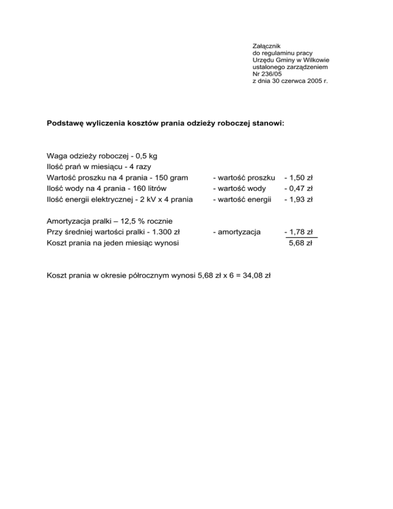 Załącznik do regulaminu pracy Urzędu Gminy w Wilkowie ustalonego zarządzeniem Nr 236/05 z dnia 30 czerwca 2005 r. Podstawę wyliczenia kosztów prania odzieŜy roboczej stanowi: Waga odzieŜy roboczej - 0,5 kg Ilość prań w miesiącu - 4 razy Wartość proszku na 4 prania - 150 gram Ilość wody na 4 prania - 160 litrów - wartość proszku - wartość wody - 1,50 zł - 0,47 zł Ilość energii elektrycznej - 2 kV x 4 prania - wartość energii - 1,93 zł Amortyzacja pralki – 12,5 % rocznie Przy średniej wartości pralki - 1.300 zł - amortyzacja - 1,78 zł Koszt prania na jeden miesiąc wynosi Koszt prania w okresie półrocznym wynosi 5,68 zł x 6 = 34,08 zł 5,68 zł