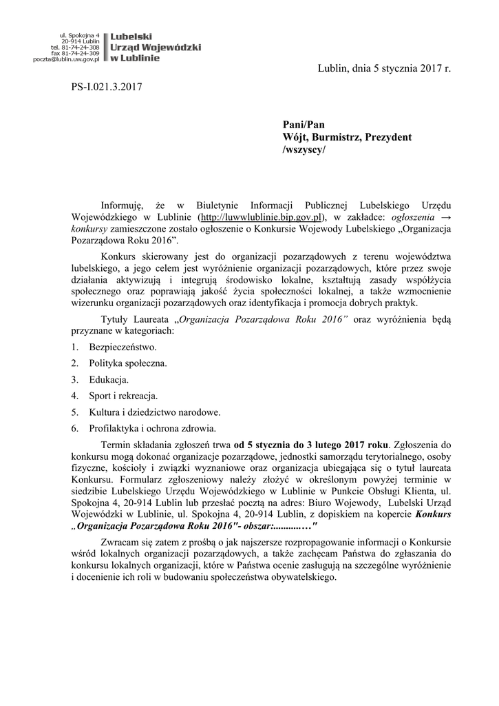 Lublin, dnia 5 stycznia 2017 r. PS-I.021.3.2017 Pani/Pan Wójt, Burmistrz, Prezydent /wszyscy/ Informuję, że w Biuletynie Informacji Publicznej Lubelskiego Urzędu Wojewódzkiego w Lublinie (http://luwwlublinie.bip.gov.pl), w zakładce: ogłoszenia → konkursy zamieszczone zostało ogłoszenie o Konkursie Wojewody Lubelskiego „Organizacja Pozarządowa Roku 2016”. Konkurs skierowany jest do organizacji pozarządowych z terenu województwa lubelskiego, a jego celem jest wyróżnienie organizacji pozarządowych, które przez swoje działania aktywizują i integrują środowisko lokalne, kształtują zasady współżycia społecznego oraz poprawiają jakość życia społeczności lokalnej, a także wzmocnienie wizerunku organizacji pozarządowych oraz identyfikacja i promocja dobrych praktyk. Tytuły Laureata „Organizacja Pozarządowa Roku 2016” oraz wyróżnienia będą przyznane w kategoriach: 1. Bezpieczeństwo. 2. Polityka społeczna. 3. Edukacja. 4. Sport i rekreacja. 5. Kultura i dziedzictwo narodowe. 6. Profilaktyka i ochrona zdrowia. Termin składania zgłoszeń trwa od 5 stycznia do 3 lutego 2017 roku. Zgłoszenia do konkursu mogą dokonać organizacje pozarządowe, jednostki samorządu terytorialnego, osoby fizyczne, kościoły i związki wyznaniowe oraz organizacja ubiegająca się o tytuł laureata Konkursu. Formularz zgłoszeniowy należy złożyć w określonym powyżej terminie w siedzibie Lubelskiego Urzędu Wojewódzkiego w Lublinie w Punkcie Obsługi Klienta, ul. Spokojna 4, 20-914 Lublin lub przesłać pocztą na adres: Biuro Wojewody, Lubelski Urząd Wojewódzki w Lublinie, ul. Spokojna 4, 20-914 Lublin, z dopiskiem na kopercie Konkurs „Organizacja Pozarządowa Roku 2016"- obszar:...........…" Zwracam się zatem z prośbą o jak najszersze rozpropagowanie informacji o Konkursie wśród lokalnych organizacji pozarządowych, a także zachęcam Państwa do zgłaszania do konkursu lokalnych organizacji, które w Państwa ocenie zasługują na szczególne wyróżnienie i docenienie ich roli w budowaniu społeczeństwa obywatelskiego.