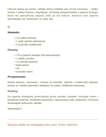 Chociaż mamy już jesień, sałatka którą zrobiłam jest raczej wiosenna… Lekka, świeża z sałatą lodową i koperkiem. Dressing przygotowałam z jogurtu koziego, który ma specyficzny zapach. Jeśli go nie lubicie, możecie użyć jogurtu naturalnego lub wymieszać ze sobą oba. Składniki: 1/2 sałaty lodowej 1 mały ogórek szklarniowy 1/2 pęczka rzodkiewek Dressing: 125 g jogurtu koziego (lub naturalnego) 1 ząbek czosnku 1/2 pęczka koperku biały pieprz sól szczypta cukru Przygotowanie: Sałatę myjemy, osuszamy i rwiemy na kawałki. Ogórka i rzodkiewki myjemy, kroimy na cienkie plasterki i dodajemy do sałaty. Delikatnie mieszamy. Dressing: Do jogurtu dodajemy przeciśnięty przez praskę czosnek, szczyptę cukru i posiekany koperek. Dokładnie mieszamy i doprawiamy solą i pieprzem. Gotowym dressingiem polewamy sałatkę. Smacznego Smaczna sałatka nie wymagająca dużo czasu. Prosta i kolorowa. Składniki: 100 g wędzonego łososia 100 g białego koziego sera 8 pomidorków koktajlowych około 60 g roszponki Dressing: 5 łyżek oliwy z oliwek 1 łyżeczka musztardy francuskiej 1 łyżeczka miodu 1 łyżka soku z cytryny sól, pieprz Przygotowanie: Roszponkę myjemy, osuszamy i przekładamy do miseczki. Dodajemy pokrojone na ćwiartki (mniejsze na pół) pomidorki koktajlowe i pokrojony w kostkę kozi ser. Łososia pokrojonego w cieniutkie plasterki zwijamy w małe ruloniki i układamy w sałatce. Wszystkie składniki na dressing dokładnie mieszamy, aż się połączą. Doprawiamy solą i pieprzem i polewamy sałatkę. Smacznego Pora na coś zdrowego Lekka i szybka sałatka z rukolą, prosciutto, pomidorkami, parmezanem i posypana prażonymi ziarnami słonecznika… Prosta i bardzo smaczna. Składniki: około 70 g rukoli 10 pomidorków koktajlowych 5 plasterków „Prosciutto Crudo” 1 łyżka startego parmezanu 2 łyżki uprażonych ziaren słonecznika Sos: 4 łyżki oliwy z oliwek „extra virgin” 1 łyżka octu balsamicznego 1/2 łyżeczki miodu 1/2 łyżeczki musztardy „Dijon” 1/2 łyżeczki oregano sól, pieprz Przygotowanie: Wszystkie składniki na sos razem mieszamy, do uzyskania gładkiej konsystencji. Doprawiamy pieprzem i solą. Rukolę płuczemy, osuszamy, przekładamy na talerz, dodajemy przekrojone na pół pomidorki (większe kroimy na ćwiartki) i starty parmezan. Wszystko polewamy przygotowanym sosem i delikatnie mieszamy. Plasterki prosciutto przekrawamy na pół, zwijamy w ruloniki i układamy w sałatce. Na suchej patelni prażymy ziarna słonecznika i posypujemy nimi gotową sałatkę. Smacznego Sałatkę Cezara chyba każdy zna. Jest jedną z najbardziej popularnych i lubianych sałatek. Głównymi jej składnikami są grzanki, sałata rzymska i parmezan. W wersji z kurczakiem może stanowić smaczne i sycące danie. Składniki: 2 główki sałaty rzymskiej 2 duże piersi z kurczaka 1 łyżeczka tymianku 1 łyżeczka oregano 250 g pomidorków koktajlowych 3 kromki chleba 2 łyżki startego parmezanu 2 łyżki oliwy z oliwek łyżka masła sól i pieprz Sos: 6 filecików anchois 2 ząbki czosnku 1 łyżeczka musztardy Dijon 1 łyżka soku z cytryny 3 łyżki majonezu 4 łyżki białego wytrawnego wina 1 łyżka startego parmezanu 2 łyżki oliwy z oliwek pieprz Przygotowanie: Piersi z kurczaka myjemy, osuszamy i przekładamy do miseczki. Dodajemy oliwę z oliwek, tymianek, oregano, sól i pieprz. Mieszamy i odstawiamy. Na wysmarowaną oliwą blaszkę układamy piersi i wstawiamy do piekarnika nagrzanego do 180’C na około 25 minut. Kromki chleba kroimy w kosteczkę. Na patelni rozgrzewamy masło, wrzucamy pokrojony chleb i smażymy do uzyskania złotego koloru, często mieszając. Sos: Anchois i czosnek drobno siekamy, przekładamy do miseczki. Dodajemy resztę składników i bardzo dokładnie mieszamy. Sałatę rzymską myjemy, odsączamy z wody i przekładamy na talerz. Dodajemy przekrojone na pół pomidorki koktajlowe i układamy pokrojone w plastry mięso. Wszystko polewamy sosem, posypujemy grzankami i parmezanem. Smacznego