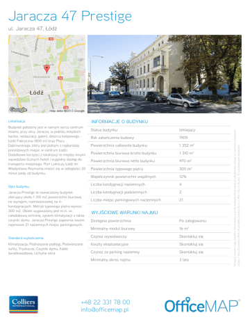 Jaracza 47 Prestige ul. Jaracza 47, Łódź Lokalizacja Opis budynku Jaracza Prestige to nowoczesny budynek oferujący około 1 310 m2 powierzchni biurowej na wynajem, rozmieszczonej na 4kondygnacjach. Metraż typowego piętra wynosi 300 m2. Obiekt wyposażony jest m.in. w: całodobową ochronę, system klimatyzacji a także czujniki dymu. Jaracza Prestige zapewnia swoim najemcom 21 naziemnych miejsc parkingowych. Standard wykończenia Klimatyzacja, Podnoszone podłogi, Podwieszane sufity, Tryskacze, Czujniki dymu, Kable światłowodowe, Uchylne okna Status budynku Istniejący Rok zakończenia budowy 1909 Powierzchnia całkowita budynku 1 352 m2 Powierzchnia biurowa brutto budynku 1 310 m2 Powierzchnia biurowa netto budynku 970 m2 Powierzchnia typowego piętra 300 m2 Współczynnik powierzchni wspólnych 12% Liczba kondygnacji naziemnych 4 Liczba kondygnacji podziemnych 2 Liczba miejsc parkingowych naziemnych 21 WYJŚCIOWE WARUNKI NAJMU Dostępna powierzchnia Po zalogowaniu Minimalny moduł biurowy 16 m2 Czynsz wywoławczy Skontaktuj się Koszty eksploatacyjne Skontaktuj się Czynsz za parking naziemny Skontaktuj się Minimalny okres najmu 3 lata +48 22 331 78 00 [email protected] Niniejsze warunki mają charakter informacyjny oraz nie stanowią oferty zawarcia jakiejkolwiek umowy w rozumieniu przepisów ustawy z dnia 23 kwietnia 1964 roku Kodeks Cywilny (Dz.U. z 1964 roku, nr 16, poz. 93 z późniejszymi zmianami). INFORMACJE O BUDYNKU Budynek położony jest w samym sercu centrum miasta, przy ulicy Jaracza, w pobliżu miejskich barów, restauracji, galerii, dworca kolejowego Łódź Fabryczna (800 m) oraz Placu Dąbrowskiego, który jest jednym z najbardziej prestiżowych miejsc w centrum Łodzi. Dodatkowe korzyści z lokalizacji to między innymi sąsiedztwo licznych hoteli i wygodny dostęp do transportu miejskiego. Port Lotniczy Łódź im. Władysława Reymonta mieści się w odległości 20 minut jazdy od budynku.