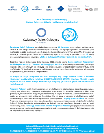 XXV Światowy Dzień Cukrzycy Zobacz Cukrzycę: Gdynia rozbłysnęła na niebiesko! Światowy Dzień Cukrzycy jest obchodzony corocznie 14 listopada przez miliony ludzi na całym świecie w celu zwiększenia świadomości ryzyka cukrzycy i rosnącego zagrożenia dla zdrowia, jakie ta choroba za sobą niesie w obecnych czasach. Zapoczątkowany w 1991 r. przez Międzynarodową Federację Diabetologiczną, Światowy Dzień Cukrzycy jest obchodzony w tym roku po raz 25. Myślą przewodnią tegorocznej edycji jest „Zobacz Cukrzycę: Działajmy już dziś, by zmienić jutro”. Zgodnie z hasłem Światowego Dnia Cukrzycy 2016, miasta objęte Ogólnopolskim Programem Profilaktyki Cukrzycy i Chorób Cywilizacyjnych PoZdro! rozbłysnęły na niebiesko, pokazując wsparcie dla osób chorych na cukrzycę oraz znaczenie, jakie w zapobieganiu cukrzycy typu 2 ma profilaktyka. W środkach transportu publicznego ruszyła także kampania społeczna informująca o zagrożeniach, jakie niesie za sobą cukrzyca. W Gdyni, w akcję Programu PoZdro! włączyły się: Urząd Miasta Gdyni – kolorem niebieskim podświetlono InfoBox OBSERWATORIUM ZMIAN, Stadion Miejski, swoje wsparcie okazał także Zarząd Komunikacji Miejskiej (plakaty w gdyńskich trolejbusach i autobusach). Program PoZdro! jest 5-letnim programem profilaktycznym obejmującym badania przesiewowe, opiekę specjalistyczną i program edukacyjny skierowany do uczniów pierwszych klas szkół gimnazjalnych i ich rodzin. Program jest realizowany w Gdyni, Warszawie, Lublinie oraz Wrocławiu. Udział w programie jest całkowicie bezpłatny. Do tej pory w ramach profilaktycznych badań przesiewowych, specjaliści PoZdro! przebadali łącznie prawie 15 tysięcy nastolatków. W ramach Programu organizowane są także zajęcia sportowe z gwiazdami sportu oraz Lekcje Multimedialne PoZdro!, które bezpłatnie udostępniane są każdej chętnej placówce. Program jest w pełni realizowany przez Fundację Medicover. Celem Programu PoZdro! jest poprawa stanu zdrowia uczniów poprzez zmniejszenie ryzyka wystąpienia cukrzycy, zwłaszcza typu 2, do której przyczynia się między innymi niezdrowy styl życia.