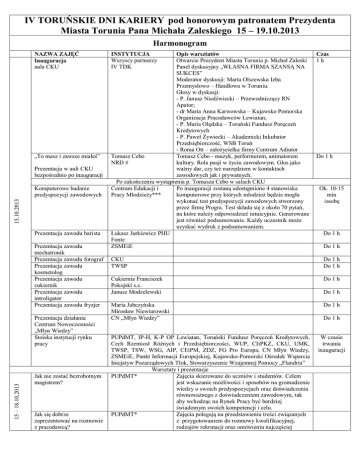 IV TORUŃSKIE DNI KARIERY pod honorowym patronatem Prezydenta Miasta Torunia Pana Michała Zaleskiego 15 – 19.10.2013 Harmonogram NAZWA ZAJĘĆ Inauguracja aula CKU „To masz i zawsze miałeś” Prezentacja w auli CKU bezpośrednio po inauguracji 15.10.2013 Komputerowe badanie predyspozycji zawodowych Prezentacja zawodu barista Prezentacja zawodu mechatronik Prezentacja zawodu fotograf Prezentacja zawodu kosmetolog Prezentacja zawodu cukiernik Prezentacja zawodu introligator Prezentacja zawodu fryzjer 15 – 18.10.2013 Prezentacja działania Centrum Nowoczesności „Młyn Wiedzy” Stoiska instytucji rynku pracy Jak nie zostać bezrobotnym magistrem? Jak się dobrze zaprezentować na rozmowie z pracodawcą? INSTYTUCJA Wszyscy partnerzy IV TDK Opis warsztatów Otwarcie Prezydent Miasta Torunia p. Michał Zaleski Panel dyskusyjny „WŁASNA FIRMA SZANSĄ NA SUKCES” Moderator dyskusji: Marta Olszewska Izba Przemysłowo – Handlowa w Toruniu. Głosy w dyskusji: - P. Janusz Niedźwiecki – Przewodniczący RN Apator; - dr Maria Anna Karwowska – Kujawsko Pomorska Organizacja Pracodawców Lewiatan; - P. Maria Olędzka – Toruński Fundusz Poręczeń Kredytowych - P. Paweł Żywiecki – Akademicki Inkubator Przedsiębiorczość, WSB Toruń - Roma Ott – założycielka firmy Centrum Adiutor Tomasz Cebo Tomasz Cebo - muzyk, performerem, animatorem NRD # kultury. Rola pasji w życiu zawodowym. Głos jako ważny dar, czy też narzędziem w kontaktach zawodowych jak i prywatnych. Po zakończeniu wystąpienia p. Tomasza Cebo w salach CKU Centrum Edukacji i Po inauguracji zostaną udostępnione 4 stanowiska Pracy Młodzieży*** komputerowe przy których młodzież będzie mogła wykonać test predyspozycji zawodowych stworzony przez firmę Progra. Test składa się z około 70 pytań, na które należy odpowiedzieć intuicyjnie. Generowane jest również podsumowanie. Każdy uczestnik może uzyskać wydruk z podsumowaniem. Łukasz Jurkiewicz PHU Fonte ZSMEiE Czas 1h Do 1 h Ok. 10-15 min /osobę Do 1 h Do 1 h CKU TWSP Do 1 h Do 1 h Cukiernia Franciszek Pokojski s.c. Janusz Modzelewski Do 1 h Maria Jabczyńska Mirosław Niewiarowski CN „Młyn Wiedzy” Do 1 h PUPdMT, IP-H, K-P OP Lewiatan, Toruński Fundusz Poręczeń Kredytowych, Cech Rzemiosł Różnych i Przedsiębiorczości, WUP, CIiPKZ, CKU, UMK, TWSP, TSW, WSG, AIP, CEiPM, ZDZ, FG Pro Europa, CN Młyn Wiedzy, ZSMEiE, Punkt Informacji Europejskiej, Kujawsko-Pomorski Ośrodek Wsparcia Inicjatyw Pozarządowych Tłok, Stowarzyszenie Wzajemnej Pomocy „Flandria” Warsztaty i prezentacje PUPdMT* Zajęcia skierowane do uczniów i studentów. Celem jest wskazanie możliwości i sposobów na gromadzenie wiedzy o swoich predyspozycjach oraz doświadczenia równoważnego z doświadczeniem zawodowym, tak aby wchodząc na Rynek Pracy być bardziej świadomym swoich kompetencji i celu. PUPdMT* Zajęcia polegają na przedstawieniu treści związanych z przygotowaniem do rozmowy kwalifikacyjnej, rodzajów rekrutacji oraz omówieniu najczęściej Do 1 h Do 1 h W czasie trwania inauguracji Skutecznie szukam pracy – metody i techniki Dokumenty aplikacyjne – wizytówka zawodowa PUPdMT* Predyspozycje i umiejętności jako kapitał na przyszłość PUPdMT* Własna firma czy etat IP-H** Szkolenie dla rozpoczynających działalność gospodarczą II US *** Rozwiąż test - poznaj siebie - porozmawiaj o przyszłości. Biuro Karier UMK *** Wolontariat Flandria** Dopiąć swego jak osiągnąć i wzmocnić cele Centrum Edukacji i Pracy Młodzieży Jak radzić sobie ze stresem Centrum Edukacji i Pracy Młodzieży 15 – 18.10.2013 15 – 18.10.2013 17.10.2013 17.10.2013 16 -17.10.2013 PUPdMT* popełnianych podczas spotkania z pracodawcami błędów. Zajęcia przedstawiają większość możliwych do zastosowania metod poszukiwania pracy. Zajęcia mają na celu praktyczne przygotowanie osób do sporządzenia własnych aplikacji – CV i Listu Motywacyjnego. Celem zajęć jest zwrócenie uwagi słuchaczy na potrzebę analizy własnych umiejętności i predyspozycji jako punktu wyjścia do dokonywania przemyślanych wyborów dalszej scieżki edukacyjnej i zawodowej. Warsztaty odbywają się w oparciu o zestaw kwestionariuszy do samobadania, dyskusję i pracę w grupie. Zajęcia poruszają następujące zagadnienia: Plusy i minusy prowadzenia własnej działalności i pracy na etacie, co to jest działalność gospodarcza i jakie może przyjąć formy, jak zarejestrować firmę?, Biznes plan – podstawowe narzędzie w planowaniu działalności gospodarczej, Case study – opracowanie skróconego biznes planu, analiza SWOT na podstawie przedstawionych przypadków. Liczebność grupy do 25 osób, konieczna jest sala wyposażona w sprzęt multimedialny i tablicę flipchart. 17.10.2013, Drugi Urząd Skarbowy w Toruniu, ul. Mazowiecka 63/65 87-100 Toruń, tel. 56 611 60 01 11:00 - 12:00 Prelekcja „Jak rozpocząć działalność gospodarczą” - rozpoczęcie działalności gospodarczej (e-Podatki) - rodzaje formy opodatkowania - indywidualne konsultacje z pracownikami Drugiego Urzędu Skarbowego w Toruniu Miejsce: Biuro Karier UMK, Gagarina 33, Toruń Indywidualne rozmowy z doradcami Biura Karier UMK Uczniowie szkół średnich zastanawiający się nad wyborem studiów będą mieli możliwość wypełnienia testów i omówienia ich wyników z doradcami. Doradcy pracują od 08:00 – 16:00. Konieczne są zapisy za pośrednictwem PUP, pod numerem telefonu 56 65 – 80 – 205. Są to spotkania indywidualne, nie grupowe. Jak zostać wolontariuszem?, czym różni się wolontariat w Polsce i za granicą, rodzaje i formy wolontariatu, prawa i obowiązki wolontariuszy, podstawy prawne wolontariatu w Polsce, Wolontariat „od podszewki” na przykładzie działań realizowanych przez wolontariuszy Fundacji Flandria. Zajęcia poruszają tematykę planowania. Rodzaje celów. Zasada prawidłowo sformułowanego celu metoda SMART. Role celów długoterminowych, średniotermi