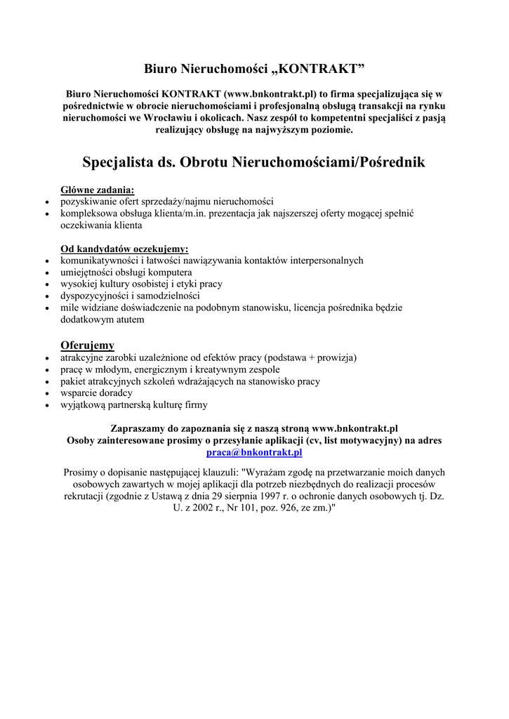 Biuro Nieruchomości „KONTRAKT” Biuro Nieruchomości KONTRAKT (www.bnkontrakt.pl) to firma specjalizująca się w pośrednictwie w obrocie nieruchomościami i profesjonalną obsługą transakcji na rynku nieruchomości we Wrocławiu i okolicach. Nasz zespół to kompetentni specjaliści z pasją realizujący obsługę na najwyższym poziomie. Specjalista ds. Obrotu Nieruchomościami/Pośrednik Główne zadania: pozyskiwanie ofert sprzedaży/najmu nieruchomości kompleksowa obsługa klienta/m.in. prezentacja jak najszerszej oferty mogącej spełnić oczekiwania klienta Od kandydatów oczekujemy: komunikatywności i łatwości nawiązywania kontaktów interpersonalnych umiejętności obsługi komputera wysokiej kultury osobistej i etyki pracy dyspozycyjności i samodzielności mile widziane doświadczenie na podobnym stanowisku, licencja pośrednika będzie dodatkowym atutem Oferujemy atrakcyjne zarobki uzależnione od efektów pracy (podstawa + prowizja) pracę w młodym, energicznym i kreatywnym zespole pakiet atrakcyjnych szkoleń wdrażających na stanowisko pracy wsparcie doradcy wyjątkową partnerską kulturę firmy Zapraszamy do zapoznania się z naszą stroną www.bnkontrakt.pl Osoby zainteresowane prosimy o przesyłanie aplikacji (cv, list motywacyjny) na adres [email protected] Prosimy o dopisanie następującej klauzuli: "Wyrażam zgodę na przetwarzanie moich danych osobowych zawartych w mojej aplikacji dla potrzeb niezbędnych do realizacji procesów rekrutacji (zgodnie z Ustawą z dnia 29 sierpnia 1997 r. o ochronie danych osobowych tj. Dz. U. z 2002 r., Nr 101, poz. 926, ze zm.)"