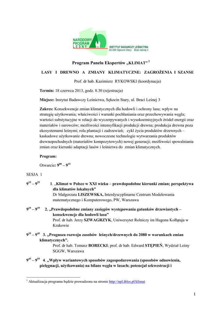 Program Panelu Ekspertów „KLIMAT” 1 LASY I DREWNO A ZMIANY KLIMATYCZNE: ZAGROŻENIA I SZANSE Prof. dr hab. Kazimierz RYKOWSKI (koordynacja) Termin: 18 czerwca 2013, godz. 8.30 (rejestracja) Miejsce: Instytut Badawczy Leśnictwa, Sękocin Stary, ul. Braci Leśnej 3 Zakres: Konsekwencje zmian klimatycznych dla hodowli i ochrony lasu; wpływ na strategię użytkowania; właściwości i warunki pochłaniania oraz przechowywania węgla; wartości substytucyjne w relacji do wyczerpywanych i wysokoemisyjnych źródeł energii oraz materiałów i surowców; możliwości intensyfikacji produkcji drewna; produkcja drewna poza ekosystemami leśnymi; rola plantacji i zadrzewień; cykl życia produktów drzewnych – kaskadowe użytkowanie drewna; nowoczesne technologie wytwarzania produktów drewnopochodnych (materiałów kompozytowych) nowej generacji; możliwości spowalniania zmian oraz kierunki adaptacji lasów i leśnictwa do zmian klimatycznych. Program: Otwarcie: 900 – 915 SESJA 1 915 – 925 925 – 935 1. „Klimat w Polsce w XXI wieku – prawdopodobne kierunki zmian; perspektywa dla klimatów lokalnych” Dr Małgorzata LISZEWSKA, Interdyscyplinarne Centrum Modelowania matematycznego i Komputerowego, PW, Warszawa 2. „Prawdopodobne zmiany zasięgów występowania gatunków drzewiastych – konsekwencje dla hodowli lasu” Prof. dr hab. Jerzy SZWAGRZYK, Uniwersytet Rolniczy im Hugona Kołłątaja w Krakowie 935 – 945 3. „Prognoza rozwoju zasobów leśnych/drzewnych do 2080 w warunkach zmian klimatycznych”. Prof. dr hab. Tomasz BORECKI; prof. dr hab. Edward STĘPIEŃ, Wydział Leśny SGGW, Warszawa 945 – 955 4. „Wpływ wariantowych sposobów zagospodarowania (sposobów odnowienia, pielęgnacji, użytkowania) na bilans węgla w lasach; potencjał sekwestracji i 1 Aktualizacja programu będzie prowadzona na stronie http://npl.ibles.pl/klimat 1 gromadzenia węgla w zależności od sposobu zagospodarowania” Prof. dr hab. Bogdan BRZEZIECKI, Wydział Leśny, SGGW, Warszawa 955 – 1035 Dyskusja 1035 – 1050 Kawa SESJA 2 1050 – 1100 5. „Możliwości zwiększania sekwestracji węgla w ekosystemach leśnych w kontekście zmian klimatycznych a) efektywność fotosyntezy, zmienność geno- i ekotypowa, Dr hab. Prof. Justyna NOWAKOWSKA, Zakład Hodowli Lasu i Genetyki Drzew Leśnych, IBL, Sękocin Stary b) gromadzenie węgla w glebie, ochrona materii organicznej. Dr inż. Józef WÓJCIK, Samodzielna Pracownia Chemii Środowiska Leśnego, IBL, Sękocin Stary 1110 – 1120 6. Obserwowane i prawdopodobne zmiany dynamiki populacji owadów oraz ocena ich funkcji ekologicznych w ekosystemach leśnych w związku ze zmianami klimatycznymi; potencjalne rozprzestrzenianie się gatunków inwazyjnych. Prof. dr hab. Jacek HILSZCZAŃSKI, Zakład Ochrony Lasu, IBL, Sękocin Stary 1120 – 1130 7. Obserwowane i prawdopodobne zmiany występowania mikroorganizmów chorobotwórczych w związku ze zmianami klimatycznymi, oraz ocena ich funkcji ekologicznych w ekosystemów leśnych; potencjalne rozprzestrzenianie się gatunków inwazyjnych. Prof. dr. Zbigniew SIEROTA, Zakład Ochrony Lasu, IBL, Sękocin Las 1130 – 1140 8. Ekstremalne stany pogody a zmiany klimatyczne – stan i perspektywy; Ocena zagrożeń abiotycznych i możliwości ich ograniczania w związku ze zmianami klimatycznymi; stan i perspektywy (szkody klimatyczne): huragany, śniegołomy, powodzie, susze, niskie i wysokie temperatury). Prof. dr hab. Zbigniew KUNDZEWICZ, Instytut Środowiska Rolniczego i Leśnego PAN (Poznań). 1140 – 1150 9. Wpływ zmian klimatycznych według wybranych scenariuszy IPCC (A2, B1, A1B) na zasoby wodne w obszarach leśnych w Polsce - możliwy wpływ na ekosystemy leśne w perspektywie do 2030 roku i w dalszej perspektywie. Dr Tomasz WALCZYKIEWICZ, Instytut Meteorologii i Gospodarki Wodnej, Kraków. 1150 – 1230 Dyskusja 1230 – 1315 Lunch SESJA 3 1315 – 1325 10. Wartości substytucyjne drewna: (a) w stosunku do kopalnych źródeł energii (węgla, ropy, gazu): wartość energetyczna, efektywność technologii spalania; (b) w 2 relacji do wysokoemisyjnych materiałów i surowców (stal, beton, plastik, cegła; – efekt klimatyczny); (c) ecological footprint a użytkowanie drewna i wartości zewnętrzne. Dr hab. Profesor Władysław STRYKOWSKI, Instytut Technologii Drewna, Poznań. 1325 – 1335 11. „Zalety i wady drewna w budownictwie mieszkalnym i przemysłowym; uszlachetnianie, drewno konstrukcyjne – stan i perspektywy” Mgr inż. Andrzej NOSKOWIAK, Instytut Technologii Drewna, Poznań. 1335 – 1345 12. Wykorzystanie biomasy leśnej w energetyce – stan i perspektywie roku 2030 i dalej do 2080 (uwarunkowania ekonomiczne, organizacyjne, techniczne, rola instrumentów wsparcia) Dr Hanna BARTOSZEWICZ-BURCZY, Dr Jan SOLIŃSKI, Instytut Energetyki, Pracownia Ekonomiki Energetyki, Warszawa 1345 – 1355 13. Współspalanie paliw konwencjonalnych i biomasy drzewnej. Dylematy pomiędzy zasadami zrównoważonego rozwoju a ekonomią. Dr Wojciech CICHY, Instytut Technologii Drewna, Poznań 1355 – 1435 Dyskusja 1435 – 1500 Kawa SESJA 4 1500 – 1510 14. Plantacje drzew i krzewów szybkorosnących jako alternatywa biomasy z lasu czy nie wykorzystane i nowe źródła odnawialne oraz szansa dla „zielonej energii” – stan obecny, możliwości, bariery i perspektywa. Prof. dr hab. Janusz GOŁASZEWSKI, prof. dr hab. Stefan SZCZUKOWSKI, dr hab. prof. UWM Mariusz STOLARSKI Uniwersytet Warmińsko-Mazurski w Olsztynie 1510 – 1520 15. Możliwości poszerzenia bazy surowcowej dla przemysłów drzewnych – inwestycje własne na przykładzie IP Kwidzyn; stan i perspektywy Dr Andrzej SAMBORSKI, IP Kwidzyn 1520 – 1530 16. Znaczenie biomasy leśnej w realizacji wymogów pakietu energetycznoklimatycznego w Polsce Ryszard GAJEWSKI, Prezes Zarządu, Polska Izba Biomasy 1530 – 1540 17. Sprzedaż drewna energetycznego z Lasów Państwowych Andrzej BALLAUN Dyrekcja Generalna Lasów Państwowych 1540 – 155