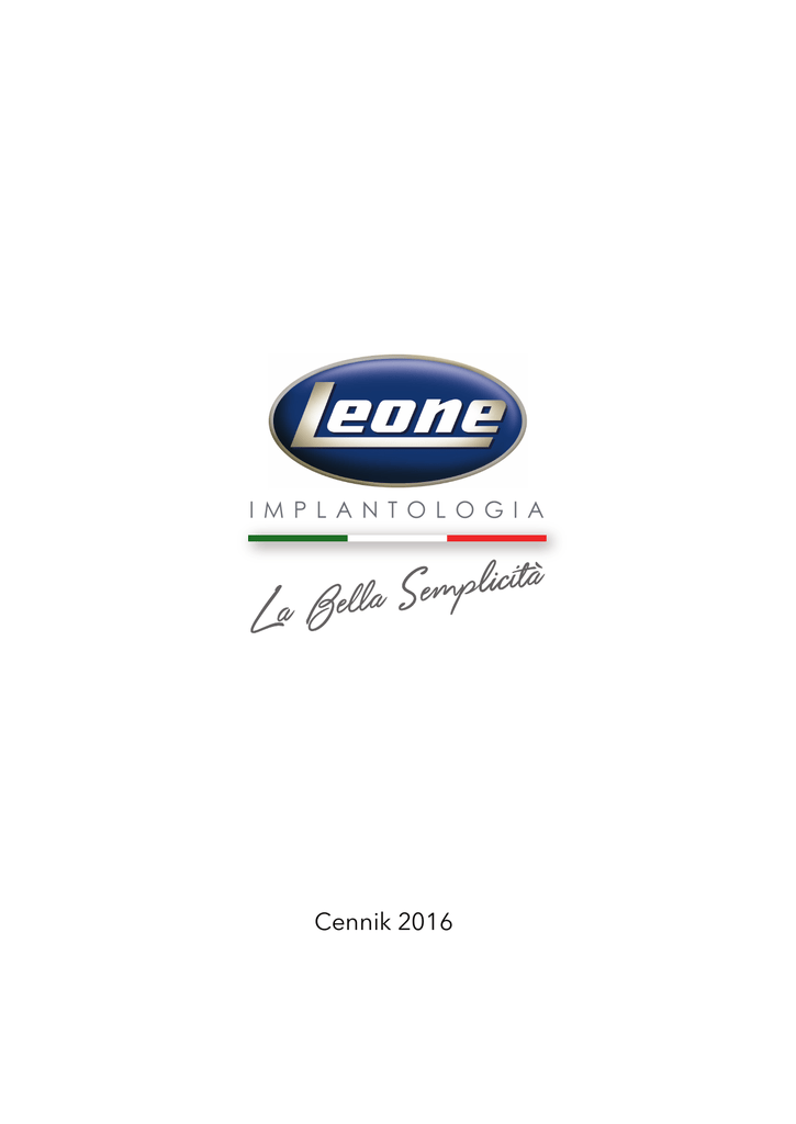 I MPL ANTOLOGIA Made of stainless steel. Seating tip is screwed in Tips are made of medical grade 5 titanium. Screw Supplied non-sterile, the tips must to be sterilised Cennik 2016 2 2 cena brutto cena brutto Implanty * Leone Leone Max Stability Leone Short 6.5 ruby zamykaj ce * STANDARD ABUT Made of medical Pack 160 plnof 1 www.leone.it 580 pln * u ywane w przypadkach subkrestalnego osadzania implantów czniki goj ce * CYLINDER ABUT new LEONE 6.5 SHORT DENTAL IMPLANT WITH COVER CAP * dostarczane z czapeczk zamykaj c Made of medical grade 5 titanium. HRS surface, self-locking Morse taper connection and internal hexagon. Mounted on a carrier, with an included biopolymer sealing cover cap, and packed in gamma-ray sterile glass vial. Cap removal from the inner holder and placement into the implant requires instrument Cat. 156-1003-00. The cover cap supplied with the implant is it has the same internal conPack content: 1 implant and 1 cover cap green since 3,75 mm nection as the standard 3.3 mm-diameter LEONE implant. Healing caps, transfers, and abutments for the 3.3 mm connection with green colour code are to be used. 3,75 mm 10 mm 110-3810-02 12 mm 110-3812-02 www.leone.it Kaseta chirurgiczna * Ø 5 mm length 6,5 mm 110-5065-02 4,5 mm 4,5 mm 10 mm 110-4510-02 for implant 12 mm 110-4512-02 The cover cap supplied with the implant is yellow it hassince the same internal connection as the standard 4,1 mm-diameter LEONE . Thisimplant ensures absolute stability and mechanical resistance: extremely important issues in this particular case as the crown-implant ratio results to be increased. There is no need for special accessories: healing caps, transfers and abutments for the 4.1 mm connection with yellow colour code are to be used. WIDER FIELD OFVISION The cover cap supplied with the implant is yellow since it has the same internal connection as the standard 4,1 mm-diameter LEONE implant. Healing caps, transfers, and abutments for the 4.1 mm connection with yellow colour code are to be used. for additional decrease of the implant’s length g the insertion process In comparison case of implant with poor quality LEONE standard implants thebone height of the implant in to placement The thread design and the apex le contact allow good anchorage, even into thread is increased by 125%, theprofi bone surface is comparable the presence density. the surface ofofanreduced implantbone 4,1 mm in diameter and 8 mm long. HREADS useful for implants and instruments to reduce contamination risks 6 8 500 pln with diameter up to 5 mm * 3 wysoko In case of implant placement into fresh extraction sockets ease in thread height compared to cylindrical geometry of the implant is ideal for the insertion in post-extraction derable increase in primary stability The as well The LEONE 6.5 short implant and the whole range of specific surgical sockets. ontact surface area compared to cylindrical instruments are featuredFUCHSIA by a COLOUR-CODE . gth and connection size In case of some advanced surgical interventions The implant apex, featuring a conical profi le and incremental threads, facilitates the insertion process by reducing the risk of fractures and fenestrations. STRUMENTS SURGICAL * cena zestawu height new TITANIUM BASIN the instruments are organized in a horizontal sense into special niches reduced to 6.5 mm Ø platform 160 pln PLATFORMA PLATFORMA STANDARDOWA DUŻA INSTRUMENTS MULTITECH ABUTMENT ci przezdzi s owe, 2 rednice Transfery wyciskowe 9 www.leone.it 120 Made of medical grade 5 25° PRE-INCLINE connection (angled abutm Pack content: 1 abutment 8 Narz dzie do osadzania CALIBRATED HOLES czników for the control of drill 7 eel and medical grade 5 titanium. er spring, it provides the right beating force to engage the healing cap andabutment definitelyto connect the implant. the Every mounted on the abutment beater. diameter www.leone.it new ANALOGS 7 to beat the abutment for the thedefinitive implant. connection to nts are ready available in the kit for implant platform 90 Øpln PLATFORMA PLATFORMA STANDARDOWA DUŻA 530 pln www.leone.it DEPTH INDICATORS ANDPOSITIONER Made of stainless steel. Designed to be used in the labo height for easy identification. Available in two versions: standa Pack content: 1 analog, 1 pin, 1 bar for the extraction124 o za sztukę medical grade 5 titanium. Supplied with an inner spring, it provides the right age the beating healing force captoand eng ent to the implant. Every seating tip may be mounted on the abutment beater. Dodatkowe ko cówki nless steel. ng and unscrewing the tips into the threaded handle. www.leone.it 156-1008-07 TIP 156-1008-01 new SMOOTH SURFACES ANALOGS OR COVER CAP de 5 titanium. ent and removal of the cover cap from the implant. www.leone.it fset only cap be used theplatform percussion abutments the selfn oftip themay healing with for slim and of forthe removal of theinlow for the insertion of aforce safety the beating byleash. 30%. Pipolereduces of implants. 156-1003-00 Sterilise in the autoclave before use. ANALOGS ENTS 156-1008-02 STRAIGHT TIP 156-1008-01 WITHOUT UNDERCUTS 8 for implant for rapid cleaning Made of stainless steel. Designed to be used in prosthetic the laboratory on accessories dental casts to faithfully duplicate implant. the position colour-c 120 pln AWith try-in abuo ne without damage w in two versions: for easy identification. Available standard and long (more retentive). za sztukę bonding Analogi laboratoryjne of the gloves Pack content: 1 analog, 1 pin, 1 bar for the extraction of the abutment portion 156-1008-06 eel. g cap with either standard or large platforms and the low self-locking cap. ANALOGS nsertion of a safety leash. Suitable forFLAT all TIP types of156-1008-06 implants. Supplied non e autoclave before use. Made of stainless steel. Designed to be used in the laboratory on dental casts to faithfully duplicate implant. the With position colour-code of the marking STRAIGHT 121-3306-00 12 for easy identification. Available