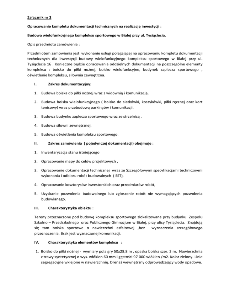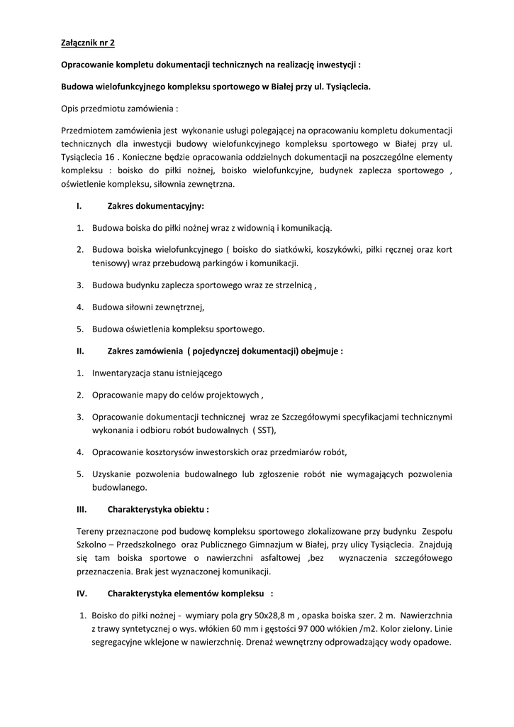 Załącznik nr 2 Opracowanie kompletu dokumentacji technicznych na realizację inwestycji : Budowa wielofunkcyjnego kompleksu sportowego w Białej przy ul. Tysiąclecia. Opis przedmiotu zamówienia : Przedmiotem zamówienia jest wykonanie usługi polegającej na opracowaniu kompletu dokumentacji technicznych dla inwestycji budowy wielofunkcyjnego kompleksu sportowego w Białej przy ul. Tysiąclecia 16 . Konieczne będzie opracowania oddzielnych dokumentacji na poszczególne elementy kompleksu : boisko do piłki nożnej, boisko wielofunkcyjne, budynek zaplecza sportowego , oświetlenie kompleksu, siłownia zewnętrzna. I. Zakres dokumentacyjny: 1. Budowa boiska do piłki nożnej wraz z widownią i komunikacją. 2. Budowa boiska wielofunkcyjnego ( boisko do siatkówki, koszykówki, piłki ręcznej oraz kort tenisowy) wraz przebudową parkingów i komunikacji. 3. Budowa budynku zaplecza sportowego wraz ze strzelnicą , 4. Budowa siłowni zewnętrznej, 5. Budowa oświetlenia kompleksu sportowego. II. Zakres zamówienia ( pojedynczej dokumentacji) obejmuje : 1. Inwentaryzacja stanu istniejącego 2. Opracowanie mapy do celów projektowych , 3. Opracowanie dokumentacji technicznej wraz ze Szczegółowymi specyfikacjami technicznymi wykonania i odbioru robót budowalnych ( SST), 4. Opracowanie kosztorysów inwestorskich oraz przedmiarów robót, 5. Uzyskanie pozwolenia budowalnego lub zgłoszenie robót nie wymagających pozwolenia budowlanego. III. Charakterystyka obiektu : Tereny przeznaczone pod budowę kompleksu sportowego zlokalizowane przy budynku Zespołu Szkolno – Przedszkolnego oraz Publicznego Gimnazjum w Białej, przy ulicy Tysiąclecia. Znajdują się tam boiska sportowe o nawierzchni asfaltowej ,bez wyznaczenia szczegółowego przeznaczenia. Brak jest wyznaczonej komunikacji. IV. Charakterystyka elementów kompleksu : 1. Boisko do piłki nożnej - wymiary pola gry 50x28,8 m , opaska boiska szer. 2 m. Nawierzchnia z trawy syntetycznej o wys. włókien 60 mm i gęstości 97 000 włókien /m2. Kolor zielony. Linie segregacyjne wklejone w nawierzchnię. Drenaż wewnętrzny odprowadzający wody opadowe. 2. Boisko wielofunkcyjne – wymiary pola gry 44 x 32.1 m. Nawierzchnia poliuretanowa gr. 13 mm. Boiska do koszykówki ( 2szt.), siatkówki ( 2 szt.), Piłki ręcznej ( 1 szt). 3. Kort tenisowy - wymiary pola gry 23,8 mx11 m i opasko szer. 2 m. Nawierzchnia poliuretanowa gr. 13 mm. 4. Strzelnica – tor strzelnicy długości maksymalnej 50 m, ilość torów 4-5. Szatnia i sanitariaty, pomieszczenia magazynowe. 5. Zaplecze sportowe – budynek parterowy, dach czterospadowy. Wyposażony w instalacje elektryczną, wodno-kanalizacyjną . Zlokalizowane wewnątrz powinny zostać szatnie z sanitariatami, magazyn sprzętu, pomieszczenia sędziów z szatniami i sanitariatami. Strzelnicę i zaplecze sportowe zlokalizować w jednym budynku. 6. Oświetlenie kompleksu za pomocą ok. 12 lamp o wys. min. 9 m. Uwagi: - Zaleca się oferentom szczegółowe sprawdzenie w terenie warunków wykonania umowy, - kolorystyka poszczególnych nawierzchni, podział funkcjonalny budynku, wyposażenie poszczególnych boisk musi zostać uzgodniona z Zamawiających , co potwierdzone powinno zostać podpisaną dwustronnie notatką, IV. Termin wykonania umowy : 30 listopad 2015 r.