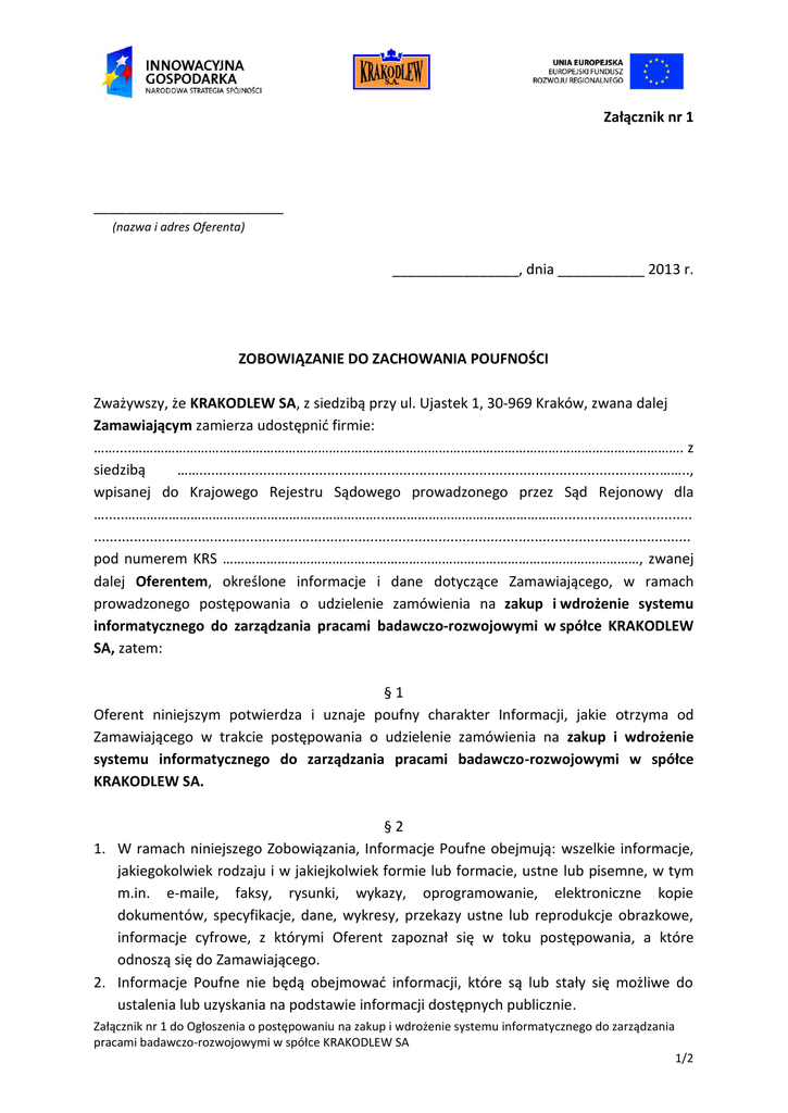Załącznik nr 1 ________________________ (nazwa i adres Oferenta) ________________, dnia ___________ 2013 r. ZOBOWIĄZANIE DO ZACHOWANIA POUFNOŚCI Zważywszy, że KRAKODLEW SA, z siedzibą przy ul. Ujastek 1, 30-969 Kraków, zwana dalej Zamawiającym zamierza udostępnić firmie: ……....……………………………………………………………………………………………………………………………………. z siedzibą ……...................................................................................................................…….., wpisanej do Krajowego Rejestru Sądowego prowadzonego przez Sąd Rejonowy dla ….....……………………………………………………………..…………………………………………................................. ..................................................................................................................................................... pod numerem KRS ……………………………………………………………………………………………………, zwanej dalej Oferentem, określone informacje i dane dotyczące Zamawiającego, w ramach prowadzonego postępowania o udzielenie zamówienia na zakup i wdrożenie systemu informatycznego do zarządzania pracami badawczo-rozwojowymi w spółce KRAKODLEW SA, zatem: §1 Oferent niniejszym potwierdza i uznaje poufny charakter Informacji, jakie otrzyma od Zamawiającego w trakcie postępowania o udzielenie zamówienia na zakup i wdrożenie systemu informatycznego do zarządzania pracami badawczo-rozwojowymi w spółce KRAKODLEW SA. §2 1. W ramach niniejszego Zobowiązania, Informacje Poufne obejmują: wszelkie informacje, jakiegokolwiek rodzaju i w jakiejkolwiek formie lub formacie, ustne lub pisemne, w tym m.in. e-maile, faksy, rysunki, wykazy, oprogramowanie, elektroniczne kopie dokumentów, specyfikacje, dane, wykresy, przekazy ustne lub reprodukcje obrazkowe, informacje cyfrowe, z którymi Oferent zapoznał się w toku postępowania, a które odnoszą się do Zamawiającego. 2. Informacje Poufne nie będą obejmować informacji, które są lub stały się możliwe do ustalenia lub uzyskania na podstawie informacji dostępnych publicznie. Załącznik nr 1 do Ogłoszenia o postępowaniu na zakup i wdrożenie systemu informatycznego do zarządzania pracami badawczo-rozwojowymi w spółce KRAKODLEW SA 1/2 §3 Oferent niniejszym zobowiązuje się: zachować Informacje Poufne w ścisłej tajemnicy, nie wykorzystywać w jakikolwiek sposób Informacji Poufnych w celach innych niż wymaga tego prowadzone postępowanie, chronić Informacje Poufne z zachowaniem najwyższej staranności oraz zabezpieczyć je przed utratą, kradzieżą, uszkodzeniem, pogorszeniem i dostępem osób trzecich i pracowników/pełnomocników Oferenta nieuprawnionych do ich otrzymania, poinformować Zamawiającego niezwłocznie w przypadku powzięcia wiadomości o naruszeniu któregokolwiek zobowiązania lub o podejrzeniu naruszenia zobowiązania, na każde wezwanie Zamawiającego niezwłocznie zwrócić wszystkie nośniki, na których znajdują się Informacje Poufne, znajdujące się w posiadaniu Oferenta oraz zniszczyć wszelkie kopie, reprodukcje i inne dokumenty wytworzone w wyniku ujawnienia Informacji Poufnych oraz wykasować wszelkie informacje elektroniczne. 1. 2. 3. 4. §4 Niniejsze Zobowiązanie wchodzi w życie w dniu podpisania. Zobowiązania Oferenta wynikające z niniejszego Zobowiązania pozostają w mocy przez okres trzech lat od dnia podpisania. W przypadku naruszenia powyższego zobowiązania Oferent zobowiązany będzie do uiszczenia kary umownej na rzecz Zamawiającego w wysokości 100 000 zł (słownie: stu tysięcy złotych) za każdy przypadek naruszenia Zobowiązania. Oferent uiści kwotę kary umownej w terminie 7 dni od daty doręczenia pisemnego wezwania Zamawiającego, na wskazany przez Zamawiającego rachunek bankowy. W przypadku powstania po stronie Zamawiającego szkody w wysokości przewyższającej kwotę kary umownej wymienionej w § 4 ust. 3, Zamawiający uprawniony jest do dochodzenia odszkodowania na zasadach ogólnych. §5 Wszelkie spory lub roszczenia wynikające z niniejszego Zobowiązania będą rozstrzygane przez sąd powszechny właściwy miejscowo dla Zamawiającego. Podpis przedstawiciela Oferenta uprawnionego do reprezentowania firmy: Załącznik nr 1 do Ogłoszenia o postępowaniu na zakup i wdrożenie systemu informatycznego do zarządzania pracami badawczo-rozwojowymi w spółce KRAKODLEW SA 2/2