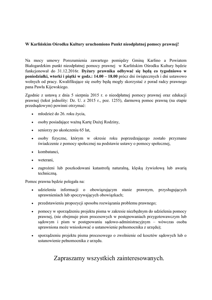 W Karlińskim Ośrodku Kultury uruchomiono Punkt nieodpłatnej pomocy prawnej! Na mocy umowy Porozumienia zawartego pomiędzy Gminą Karlino a Powiatem Białogardzkim punkt nieodpłatnej pomocy prawnej w Karlińskim Ośrodku Kultury będzie funkcjonował do 31.12.2016r. Dyżury prawnika odbywać się będą co tygodniowo w poniedziałki, wtorki i piątki w godz.: 14.00 – 18.00 prócz dni świątecznych i dni ustawowo wolnych od pracy. Kwalifikujące się osoby będą mogły skorzystać z porad radcy prawnego pana Pawła Kijewskiego. Zgodnie z ustawą z dnia 5 sierpnia 2015 r. o nieodpłatnej pomocy prawnej oraz edukacji prawnej (tekst jednolity: Dz. U. z 2015 r., poz. 1255), darmową pomoc prawną (na etapie przedsądowym) powinni otrzymać: młodzież do 26. roku życia, osoby posiadające ważną Kartę Dużej Rodziny, seniorzy po ukończeniu 65 lat, osoby fizyczne, którym w okresie roku poprzedzającego zostało przyznane świadczenie z pomocy społecznej na podstawie ustawy o pomocy społecznej, kombatanci, weterani, zagrożeni lub poszkodowani katastrofą naturalną, klęską żywiołową lub awarią techniczną. Pomoc prawna będzie polegała na: udzieleniu informacji o obowiązującym stanie uprawnieniach lub spoczywających obowiązkach; prawnym, przysługujących przedstawieniu propozycji sposobu rozwiązania problemu prawnego; pomocy w sporządzeniu projektu pisma w zakresie niezbędnym do udzielenia pomocy prawnej, (nie obejmuje pism procesowych w postępowaniach przygotowawczym lub sądowym i pism w postępowaniu sądowo-administracyjnym – wówczas osoba uprawniona może wnioskować o ustanowienie pełnomocnika z urzędu); sporządzeniu projektu pisma procesowego o zwolnienie od kosztów sądowych lub o ustanowienie pełnomocnika z urzędu. Zapraszamy wszystkich zainteresowanych.