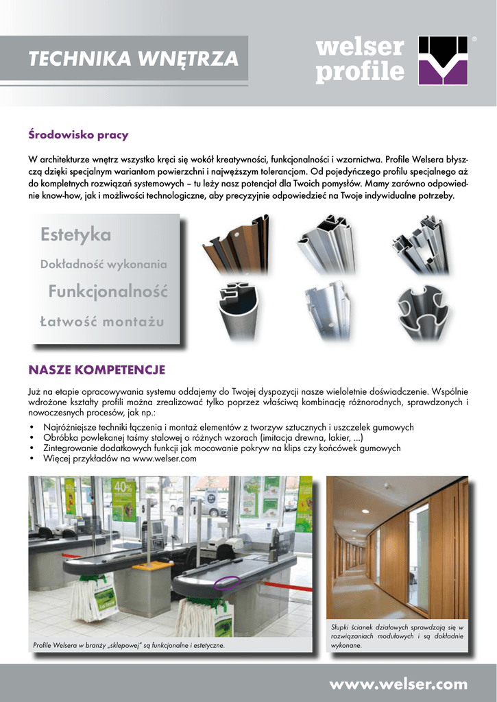 TECHNIKA WNĘTRZA Środowisko pracy W architekturze wnętrz wszystko kręci się wokół kreatywności, funkcjonalności i wzornictwa. Profile Welsera błyszczą dzięki specjalnym wariantom powierzchni i najwęższym tolerancjom. Od pojedyńczego profilu specjalnego aż do kompletnych rozwiązań systemowych – tu leży nasz potencjał dla Twoich pomysłów. Mamy zarówno odpowiednie know-how, jak i możliwości technologiczne, aby precyzyjnie odpowiedzieć na Twoje indywidualne potrzeby. Estetyka Dokładność wykonania Funkcjonalność Łatwość montażu NASZE KOMPETENCJE Już na etapie opracowywania systemu oddajemy do Twojej dyspozycji nasze wieloletnie doświadczenie. Wspólnie wdrożone kształty profili można zrealizować tylko poprzez właściwą kombinację różnorodnych, sprawdzonych i nowoczesnych procesów, jak np.: • Najróżniejsze techniki łączenia i montaż elementów z tworzyw sztucznych i uszczelek gumowych • Obróbka powlekanej taśmy stalowej o różnych wzorach (imitacja drewna, lakier, ...) • Zintegrowanie dodatkowych funkcji jak mocowanie pokryw na klips czy końcówek gumowych • Więcej przykładów na www.welser.com Profile Welsera w branży „sklepowej“ są funkcjonalne i estetyczne. Słupki ścianek działowych sprawdzają się w rozwiązaniach modułowych i są dokładnie wykonane. www.welser.com TECHNIKA WNĘTRZA TWOJA KORZYŚĆ • Wysoka dokładność wykonania przetłoczeń i otworów • Spełnienie najwyższych wymagań co do optyki elementów • Specjalne procesy formowania umożliwiają produkcję z materiału o powierzchni dedykowanej do chromowania • Eliminacja dodatkowej obróbki powierzchni dzięki profilowaniu taśmy zabezpieczonej folią • Spełnienie oczekiwań z zakresu statyki i redukcja masy dzięki takim technologiom jak klinczowanie czy zintegrowane spawanie laserowe • Łatwość montażu dzięki zachowaniu wymaganych tolerancji • Optymalne parametry odbijania światła poprzez użycie taśmy lakierowanej lub specjalnych materiałów o wysokim połysku • Odpowiednie parametry nośności i spełnienie wymogów multifunkcjonalnych, jak np. mocowanie niewidocznych elementów chłodzących lub spryskiwaczy • Spełnienie różnorodnych oczekiwań designerskich Welser Profile wyróżnia się dzięki zastosowaniu materiałów o różnych powierzchniach w konstrukcji mebli. Zachowanie wymaganych tolerancji jest niezbędne, aby możliwe było połączenie kształtowników z innymi profilami i materiałami stosowanymi w systemach sufitów podwieszanych. O Welser Profile • Producent profili specjalnych ze stali, stali szlachetnej i metali nieżelaznych • 11 pokoleń firmy rodzinnej • Ponad 19.000 wyprodukowanych kształtów • • • • Łączna powierzchnia zakładów 420.000 m² 1.750 pracowników 3 zakłady produkcyjne / 60 linii do profilowania Przedstawicielstwa w 12 krajach www.welser.com