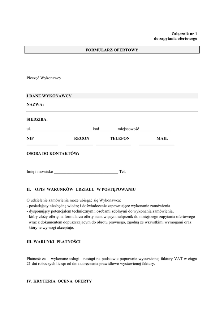 Załącznik nr 1 do zapytania ofertowego FORMULARZ OFERTOWY ________________ Pieczęć Wykonawcy I DANE WYKONAWCY NAZWA: SIEDZIBA: ul. _____________________________ kod ________ miejscowość _______________ NIP _______________ REGON TELEFON _____________ _________________ MAIL _________________ OSOBA DO KONTAKTÓW: Imię i nazwisko _______________________________ Tel. II. OPIS WARUNKÓW UDZIAŁU W POSTĘPOWANIU O udzielenie zamówienia może ubiegać się Wykonawca: - posiadający niezbędną wiedzę i doświadczenie zapewniające wykonanie zamówienia - dysponujący potencjałem technicznym i osobami zdolnymi do wykonania zamówienia, - który złoży ofertę na formularzu oferty stanowiącym załącznik do niniejszego zapytania ofertowego wraz z dokumentem dopuszczającym do obrotu prawnego, zgodną ze wszystkimi wymogami oraz który te wymogi akceptuje. III. WARUNKI PŁATNOŚCI Płatność za wykonane usługi nastąpi na podstawie poprawnie wystawionej faktury VAT w ciągu 21 dni roboczych licząc od dnia doręczenia prawidłowo wystawionej faktury. IV. KRYTERIA OCENA OFERTY 1. Zamawiający zastosuje następujące kryteria wyboru oferty: Cena – 100% Zamawiający udzieli zamówienia Wykonawcy, które spełni wszystkie wymogi Zamawiającego opisane w niniejszym zapytaniu ofertowym i przedstawi najniższą cenę. V. SPOSÓB ZŁOŻENIA OFERTY: 1. Pisemną ofertę należy złożyć na : załączonym formularzu oferty (załącznik nr 1 do zapytania ofertowego) i załączonym szczegółowym formularzu ceny. 2. Cenę podaną w ofercie (brutto z VAT), należy określić z dokładnością do dwóch miejsc po przecinku w PLN. 3. Ceny podane w ofercie muszą obejmować wszystkie koszty związane z realizacją zamówienia. 4. Termin związania ofertą wynosi 21 dni. 5. Ofertę należy złożyć w formie pisemnej na adres : Akademia Sztuk Pięknych im. Eugeniusza Gepperta we Wrocławiu, Pl. Polski 3/4, 50-156 Wrocław, (sekcja zaopatrzenia pok. 215A, II piętro) ofertę należy złożyć, zamkniętej kopercie zawierającej nazwę i adres Wykonawcy i zaadresowanej w następujący sposób: „ Dostawa odzieży roboczej i ochronnej dla Akademii Sztuk Pięknych im. E. Gepperta we Wrocławiu, pl. Polski 3/4, 50-156 Wrocław” do dnia 29.01.2015 r. do godz. 12.00. 6. Osoby do kontaktu z Wykonawcami: - Andrzej Jura tel. 71 343 80 33 wew. 228 7. Zamawiający zastrzega sobie prawo do unieważnienia postępowania bez podania przyczyny. 8. Konsekwencje złożenia oferty niezgodnie z ww. wymogami ponosi Wykonawca ( np. potraktowanie oferty jako zwykłej korespondencji i nie dostarczenie jej na miejsce składania ofert w terminie określonym w punkcie 5. Oferty, które wpłyną po terminie określonym w pkt. 5 nie będą rozpatrywane. Akademia Sztuk Pięknych im. Eugeniusza Gepperta we Wrocławiu inż. Wojciech Orzechowski Załączniki : 1. Zał. nr 1 – Oferta Wykonawcy 2. Zał. nr 2 - Formularzem cenowym . 2. Zał. nr 3 - Projekt umowy.