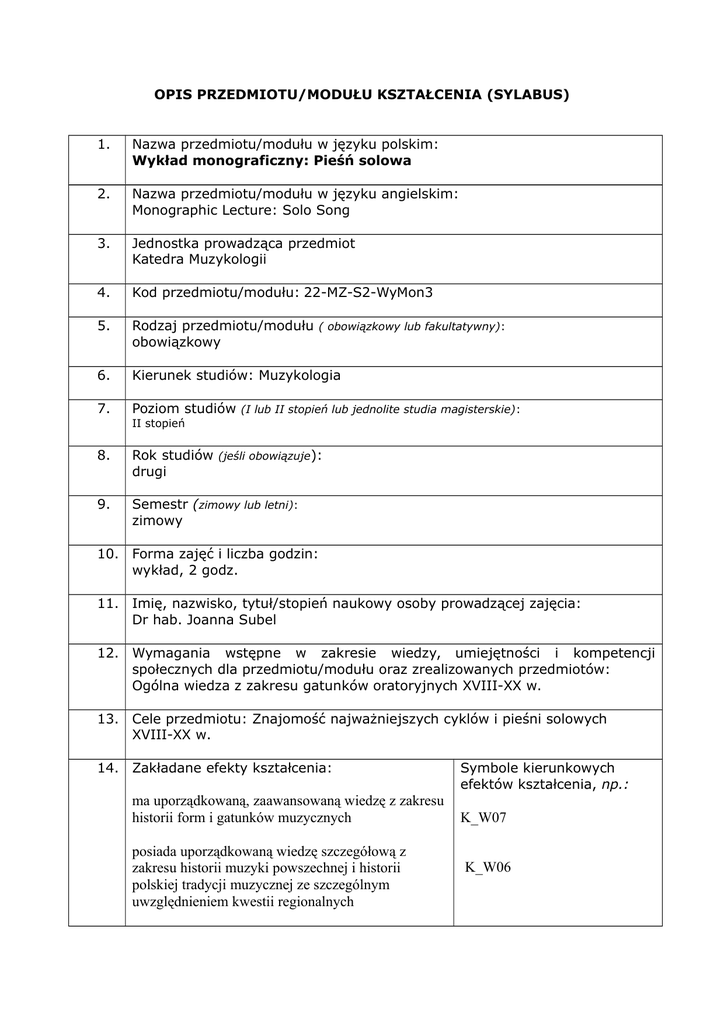OPIS PRZEDMIOTU/MODUŁU KSZTAŁCENIA (SYLABUS) 1. Nazwa przedmiotu/modułu w języku polskim: Wykład monograficzny: Pieśń solowa 2. Nazwa przedmiotu/modułu w języku angielskim: Monographic Lecture: Solo Song 3. Jednostka prowadząca przedmiot Katedra Muzykologii 4. Kod przedmiotu/modułu: 22-MZ-S2-WyMon3 5. Rodzaj przedmiotu/modułu ( obowiązkowy lub fakultatywny): obowiązkowy 6. Kierunek studiów: Muzykologia 7. Poziom studiów (I lub II stopień lub jednolite studia magisterskie): II stopień 8. Rok studiów (jeśli obowiązuje): drugi 9. Semestr (zimowy lub letni): zimowy 10. Forma zajęć i liczba godzin: wykład, 2 godz. 11. Imię, nazwisko, tytuł/stopień naukowy osoby prowadzącej zajęcia: Dr hab. Joanna Subel 12. Wymagania wstępne w zakresie wiedzy, umiejętności i kompetencji społecznych dla przedmiotu/modułu oraz zrealizowanych przedmiotów: Ogólna wiedza z zakresu gatunków oratoryjnych XVIII-XX w. 13. Cele przedmiotu: Znajomość najważniejszych cyklów i pieśni solowych XVIII-XX w. 14. Zakładane efekty kształcenia: ma uporządkowaną, zaawansowaną wiedzę z zakresu historii form i gatunków muzycznych posiada uporządkowaną wiedzę szczegółową z zakresu historii muzyki powszechnej i historii polskiej tradycji muzycznej ze szczególnym uwzględnieniem kwestii regionalnych Symbole kierunkowych efektów kształcenia, np.: K_W07 K_W06 posiada pogłębione umiejętności badawcze, obejmujące analizę prac innych autorów, syntezę różnych idei i poglądów, formułowanie problemów badawczych, dobór metod i konstruowanie narzędzi badawczych, opracowanie i prezentację wyników, pozwalające na oryginalne rozwiązywanie złożonych problemów w zakresie muzykologii i wskazanie kierunku dalszych badań w obrębie wybranej subdyscypliny muzykologii umie samodzielnie zdobywać wiedzę i poszerzać umiejętności badawcze oraz podejmować autonomiczne działania zmierzające do rozwijania zdolności i kierowania własną karierą zawodową posiada umiejętność integrowania wiedzy z różnych dyscyplin w zakresie nauk humanistycznych oraz jej zastosowania w opracowywaniu i prezentowaniu wyników badań w poszczególnych dyscyplinach muzykologicznych ma pogłębioną świadomość poziomu swojej wiedzy i umiejętności, rozumie potrzebę ciągłego rozwoju osobistego i zawodowego jest przygotowany do aktywnego uczestnictwa w organizacjach zbiorowych (instytucje muzyczne, zespoły badawcze i inne grupy), przyjmując w nich różne role K_U02 K_U03 K_U04 K_K01 K_K02 15. Treści programowe: Pieśń solowa XVIII w., pieśni romantyczne różnych obszarów językowych (niemiecka, francuska, polska, rosyjska, innych narodów), najważniejsze cykle pieśniowe, pieśń solowa i z orkiestrą 16. Zalecana literatura: J. Chomiński, K. Wilkowska-Chomińska, Formy muzyczne T. 3 Pieśń. Kraków 1974; A. Einstein, Muzyka w epoce romantyzmu. Kraków 1983; Zeszyty Naukowe „Muzyka i liryka” nr 1-10, wyd. Akademia Muzyczna w Krakowie; M. Tomaszewski Od wyznania do wołania. Studia nad pieśnią romantyczną Kraków1997; A. NowakRomanowicz Klasycyzm Warszawa 1995; I. Poniatowska Romantyzm część druga 1850-1900, Warszawa 2010; Z. Lissa Goethe a muzyka. W: Muzyka polska. Rok 1956. Warszawa 1956; hasła encyklopedyczne kompozytorów 17. Forma zaliczenia poszczególnych komponentów przedmiotu/modułu, sposób sprawdzenia osiągnięcia zamierzonych efektów kształcenia: wykład: kolokwium słuchowe, egzamin ustny seminarium: laboratorium: konwersatorium: inne: 18. Język wykładowy: polski 19. Obciążenie pracą studenta: Czytanie publikacji monograficznych i analitycznych twórców gatunku; słuchanie kompozycji Forma aktywności studenta Średnia liczba godzin na zrealizowanie aktywności Godziny zajęć (wg planu studiów) 30 z nauczycielem: - wykład: wykład 2 godz. tygodniowo - ćwiczenia: - laboratorium: - inne: Praca własna studenta, np.: 30 czytanie literatury - przygotowanie do zajęć: oraz słuchanie - opracowanie wyników: kompozycji 30 - czytanie wskazanej literatury: przygotowanie do - napisanie raportu z zajęć: egzaminu 30 - przygotowanie do egzaminu: Suma godzin 90 Liczba punktów ECTS *objaśnienie symboli: K (przed podkreślnikiem)- kierunkowe efekty kształcenia W - kategoria wiedzy U - kategoria umiejętności K (po podkreślniku) - kategoria kompetencji społecznych 01, 02, 03 i kolejne - numer efektu kształcenia 3
