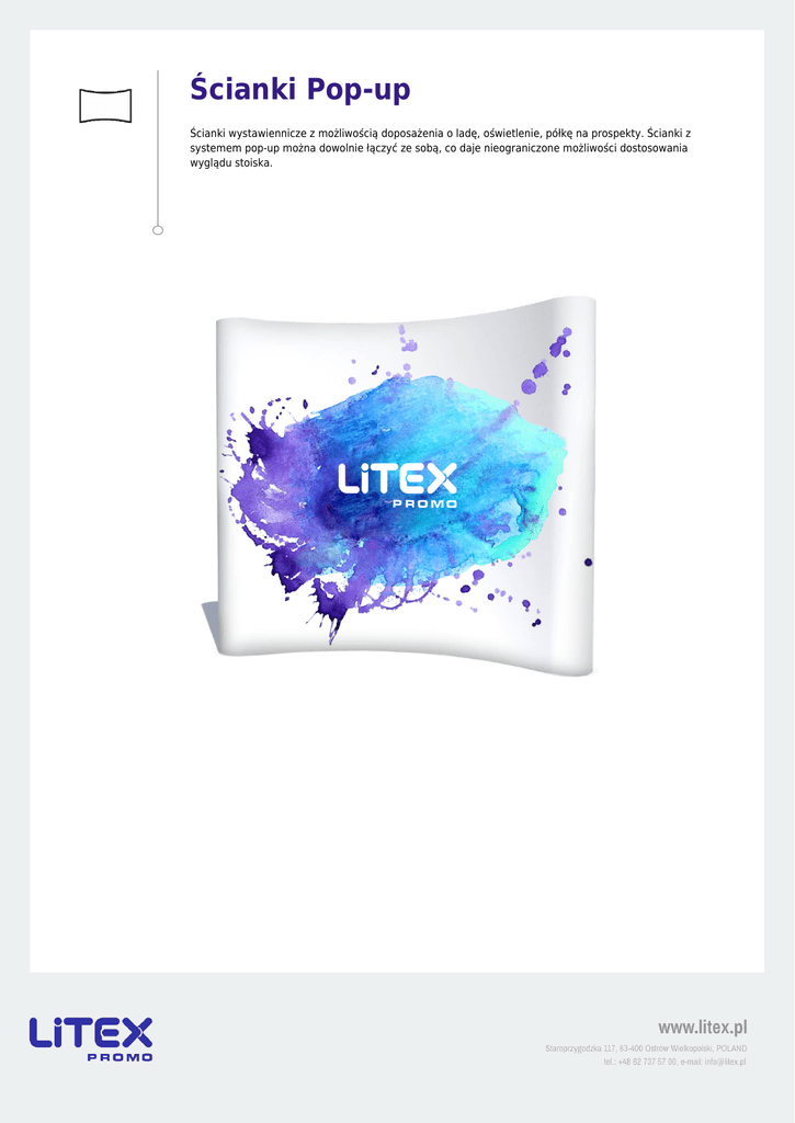 Ścianki Pop-up Ścianki wystawiennicze z możliwością doposażenia o ladę, oświetlenie, półkę na prospekty. Ścianki z systemem pop-up można dowolnie łączyć ze sobą, co daje nieograniczone możliwości dostosowania wyglądu stoiska. Ścianki Pop-up Dane techniczne ........................................................................................................................................................... Kształt - Łukowy Rodzaj nośnika - Ścianka typu Pop-Up łukowa Rodzaj druku Rozmiar - 3x3 - 3x4 - cyfrowy, sitodruk, płaski Stelaż (kolor i materiał) - srebrne aluminium Warianty produktu ........................................................................................................................................................... Pop-up Łukowy 3x3 Kształt Pop-up Łukowy 3x4 Łukowy Kształt Łukowy Wysokość 2225mm Wysokość 2225mm Szerokość 2540mm Szerokość 3070mm Głębokość 685mm Głębokość 960mm