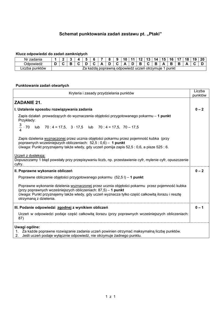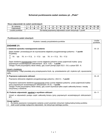 Schemat punktowania zadań zestawu pt. „Ptaki” Klucz odpowiedzi do zadań zamkniętych Nr zadania 1 2 3 4 5 6 7 8 9 10 11 12 13 14 15 16 17 18 19 20 Odpowiedź D C B C D C A D C A D B C B A B B A C D Liczba punktów Za każdą poprawną odpowiedź uczeń otrzymuje 1 punkt Punktowanie zadań otwartych Kryteria i zasady przydzielania punktów Liczba punktów ZADANIE 21. I. Ustalenie sposobu rozwiązywania zadania 0–2 Zapis działań prowadzących do wyznaczenia objętości przygotowanego pokarmu – 1 punkt Przykłady: 3 · 70 lub 70 : 4 = 17,5, 3 · 17,5 lub 70 : 4 = 17,5, 70 – 17,5 4 Zapis dzielenia wyznaczonej przez ucznia objętości pokarmu przez pojemność kubka (przy poprawnych wcześniejszych obliczeniach: 52,5 : 0,6) – 1 punkt Uwaga: Punkt przyznajemy także wtedy, gdy uczeń pomija zapis 52,5 : 0,6, a pisze 525 : 6. Uczeń z dysleksją: Dopuszczamy 1 błąd powstały przy przepisywaniu liczb, np. przestawienie cyfr, mylenie cyfr, opuszczenie cyfry. II. Poprawne wykonanie obliczeń 0–2 Poprawne obliczenie objętości przygotowanego pokarmu (52,5 l) – 1 punkt Poprawne wykonanie dzielenia wyznaczonej przez ucznia objętości pokarmu przez pojemność kubka (przy poprawnych wcześniejszych obliczeniach: 87,5) – 1 punkt Uwaga: Punkt przyznajemy także wtedy, gdy uczeń wyznacza tylko część całkowitą ilorazu i resztę otrzymaną z dzielenia. III. Podanie odpowiedzi zgodnej z wynikiem obliczeń Uczeń w odpowiedzi podaje część całkowitą ilorazu (przy poprawnych wcześniejszych obliczeniach: 87) Uwagi ogólne: 1. Za każde poprawne rozwiązanie zadania uczeń powinien otrzymać maksymalną liczbę punktów. 2. Jeśli uczeń podaje wyłącznie odpowiedź, nie otrzymuje żadnego punktu. 1 z 1 0–1 Liczba punktów Kryteria i zasady przydzielania punktów ZADANIE 22. I. Ustalenie sposobu rozwiązywania zadania 0–2 Zapis wyrażeń prowadzących do obliczenia 40 % z 85 (masy owoców nieuszkodzonych) – 2 punkty Przykłady: 40 · 85 100 lub 4 ·8,5 lub 10% –– 8,5, 40% –– 34 lub 60 · 85 = 51, 100 85 – 51 Jeżeli uczeń poprzestaje na zapisaniu wyrażeń prowadzących do obliczenia 60% z 85, otrzymuje tylko 1 punkt. Uczeń z dysleksją: Dopuszczamy 1 błąd powstały przy przepisywaniu liczb, np. przestawienie cyfr, mylenie cyfr, opuszczenie cyfry. II. Poprawne wykonanie obliczeń 0–1 Poprawne obliczenie masy owoców nieuszkodzonych (34 kg) Uwagi ogólne: 1. Za każde poprawne rozwiązanie zadania uczeń powinien otrzymać maksymalną liczbę punktów. 2. Jeśli uczeń podaje wyłącznie odpowiedź, nie otrzymuje żadnego punktu. ZADANIE 23. I. Udzielenie odpowiedzi na pytanie 0–1 Przyznajemy punkt za każdą odpowiedź, zawierającą argument przekonujący o tym, że ptaki są pożyteczne. Uwaga: Uczeń może posłużyć się przykładem konkretnego ptaka. Przykłady: Ptaki są pożyteczne, ponieważ zjadają owady szkodniki. Ptaki zjadają owady i rozsiewają nasiona. Kury znoszą jaja, którymi odżywiają się ludzie. Przykład odpowiedzi nietypowej, za którą również przyznajemy punkt: Ptaki są pożyteczne, bo ich śpiew umila nam życie. II. Sformułowanie odpowiedzi zdaniem złożonym 0–1 Przyznajemy punkt za wyrażenie odpowiedzi zdaniem złożonym współrzędnie lub podrzędnie, poprawnie zbudowanym i zapisanym zgodnie z regułami ortografii i interpunkcji. Nie dopuszcza się błędów językowych, dopuszcza się 1 błąd ortograficzny lub interpunkcyjny. Uczeń z dysleksją: Przyznajemy punkt za wyrażenie odpowiedzi zdaniem złożonym współrzędnie lub podrzędnie, poprawnie zbudowanym. 2 z 2 Kryteria i zasady przydzielania punktów Liczba punktów ZADANIE 24. I. Pisanie na temat 0–2 Związek treści z tematem – 1 punkt Treść bogata, rozwinięta – 1 punkt Uwaga: Uczeń może opowiadać historię realną (prawdopodobną) lub fantastyczną. Opowiadanie ucznia może dotyczyć ciągu wydarzeń lub skupiać się wokół jednego wydarzenia. II. Stosowanie formy opowiadania 0–1 Narracja w pierwszej osobie liczby pojedynczej lub mnogiej (narrator jest uczestnikiem wydarzeń). III. Zachowanie poprawności kompozycyjnej 0–1 Przyznajemy punkt, jeżeli wypowiedź jest spójna i stanowi zamkniętą całość. IV. Zachowanie poprawności językowej 0–2 0 - 1 błąd – 2 punkty 2 - 3 błędy – 1 punkt więcej błędów – 0 punktów V. Zachowanie poprawności ortograficznej 0–2 0 – 1 błąd – 2 punkty 2 – 3 błędy – 1 punkt więcej błędów – 0 punktów Uczeń z dysleksją: Wypowiedź komunikatywna mimo błędów językowych – 1 punkt Myśli zamknięte w zdaniach (nie ma „potoku składniowego”) – 1 punkt VI. Zachowanie poprawności interpunkcyjnej 0–1 Dopuszcza się 3 błędy interpunkcyjne. Uczeń z dysleksją: Wypowiedź logicznie uporządkowana. VII. Wyodrębnianie akapitów 0–1 W zapisie opowiadania są wyodrębnione przynajmniej dwa akapity – zgodnie z wewnętrzną strukturą tekstu. Uwaga ogólna: Punktów za kryteria IV, V, VI nie przyznajemy, gdy wypracowanie zajmuje mniej niż połowę wskazanej objętości. 3 z 3