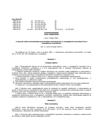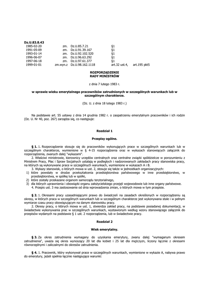 Dz.U.83.8.43 1985-02-20 1991-05-09 1993-01-14 1996-06-07 1997-06-18 1999-01-01 zm. zm. zm. zm. zm. zm.wyn.z Dz.U.85.7.21 Dz.U.91.39.167 Dz.U.92.102.520 Dz.U.96.63.292 Dz.U.97.61.377 Dz.U.98.162.1118 §1 §1 §1 §1 §1 art.32 ust.4, art.195 pkt5 ROZPORZĄDZENIE RADY MINISTRÓW z dnia 7 lutego 1983 r. w sprawie wieku emerytalnego pracowników zatrudnionych w szczególnych warunkach lub w szczególnym charakterze. (Dz. U. z dnia 18 lutego 1983 r.) Na podstawie art. 55 ustawy z dnia 14 grudnia 1982 r. o zaopatrzeniu emerytalnym pracowników i ich rodzin (Dz. U. Nr 40, poz. 267) zarządza się, co następuje: Rozdział 1 Przepisy ogólne. § 1. 1. Rozporządzenie stosuje się do pracowników wykonujących prace w szczególnych warunkach lub w szczególnym charakterze, wymienione w § 4-15 rozporządzenia oraz w wykazach stanowiących załącznik do rozporządzenia, zwanych dalej "wykazami". 2. Właściwi ministrowie, kierownicy urzędów centralnych oraz centralne związki spółdzielcze w porozumieniu z Ministrem Pracy, Płac i Spraw Socjalnych ustalają w podległych i nadzorowanych zakładach pracy stanowiska pracy, na których są wykonywane prace w szczególnych warunkach, wymienione w wykazach A i B. 3. Wykazy stanowisk, o których mowa w ust. 2, stosuje się także w jednostkach organizacyjnych: 1) które powstały w drodze przekształcenia przedsiębiorstwa państwowego w inne przedsiębiorstwo, w przedsiębiorstwa, w spółkę lub w spółki, 2) które zostały przekazane organom samorządu terytorialnego, 3) dla których uprawnienia i obowiązki organu założycielskiego przejęli wojewodowie lub inne organy państwowe. 4. Przepis ust. 3 ma zastosowanie od dnia wprowadzenia zmian, o których mowa w tym przepisie. § 2. 1. Okresami pracy uzasadniającymi prawo do świadczeń na zasadach określonych w rozporządzeniu są okresy, w których praca w szczególnych warunkach lub w szczególnym charakterze jest wykonywana stale i w pełnym wymiarze czasu pracy obowiązującym na danym stanowisku pracy. 2. Okresy pracy, o których mowa w ust. 1, stwierdza zakład pracy, na podstawie posiadanej dokumentacji, w świadectwie wykonywania prac w szczególnych warunkach, wystawionym według wzoru stanowiącego załącznik do przepisów wydanych na podstawie § 1 ust. 2 rozporządzenia, lub w świadectwie pracy. Rozdział 2 Wiek emerytalny. § 3. Za okres zatrudnienia wymagany do uzyskania emerytury, zwany dalej "wymaganym okresem zatrudnienia", uważa się okres wynoszący 20 lat dla kobiet i 25 lat dla mężczyzn, liczony łącznie z okresami równorzędnymi i zaliczalnymi do okresów zatrudnienia. § 4. 1. Pracownik, który wykonywał prace w szczególnych warunkach, wymienione w wykazie A, nabywa prawo do emerytury, jeżeli spełnia łącznie następujące warunki: 1) osiągnął wiek emerytalny wynoszący: 55 lat dla kobiet i 60 lat dla mężczyzn, 2) (skreślony), 3) ma wymagany okres zatrudnienia, w tym co najmniej 15 lat pracy w szczególnych warunkach. 2. (skreślony). 3. Do okresów zatrudnienia w szczególnych warunkach, o których mowa w ust. 1, zalicza się także okresy pracy górniczej w rozumieniu przepisów o zaopatrzeniu emerytalnym górników i ich rodzin oraz okresy zatrudnienia na kolei w rozumieniu przepisów o zaopatrzeniu emerytalnym pracowników kolejowych i ich rodzin, a także okresy pracy lub służby, o których mowa w § 5-10. § 5. 1. Pracownik, który na statkach żeglugi powietrznej wykonywał prace w szczególnych warunkach, wymienione w dziale I wykazu B, nabywa prawo do emerytury, jeżeli spełnia łącznie następujące warunki: 1) osiągnął wiek emerytalny wynoszący: a) 55 lat dla kobiet i 60 lat dla mężczyzn albo b) 50 lat dla kobiet i 55 lat dla mężczyzn, jeżeli komisja lotniczo-lekarska wydała orzeczenie o niezdolności do wykonywania czynności członka personelu latającego, 2) wiek emerytalny osiągnął w czasie wykonywania prac wymienionych w dziale I wykazu B lub w czasie zatrudnienia, do którego został skierowany po zwolnieniu z pracy na statkach żeglugi powietrznej, 3) ma wymagany okres zatrudnienia, w tym co najmniej 15 lat pracy na statkach żeglugi powietrznej, wymienionej w dziale I wykazu B. 2. Warunek określony w ust. 1 pkt 2 nie jest wymagany, jeżeli pracownik z powodu inwalidztwa został zwolniony z pracy na statkach żeglugi powietrznej lub z pracy, do której został skierowany po zwolnieniu z pracy na statkach żeglugi powietrznej, wymienionej w ust. 1. § 6. Pracownik, który w morskich portach handlowych oraz przedsiębiorstwach pomocniczych działających na rzecz tych portów, zwanych dalej "portami morskimi", wykonywał prace w szczególnych warunkach, wymienione w dziale II wykazu B, nabywa prawo do emerytury, jeżeli spełnia łącznie następujące warunki: 1) osiągnął wiek emerytalny wynoszący: 55 lat w czasie wykonywania tych prac lub zatrudnienia, do którego został skierowany stosownie do zalecenia lekarza, 2) ma wymagany okres zatrudnienia, w tym co najmniej 15 lat pracy wymienionej w dziale II wykazu B. § 7. Pracownik, który wykonywał w hutnictwie prace w szczególnych warunkach, wymienione w dziale III wykazu B, nabywa prawo do emerytury, jeżeli spełnia łącznie następujące warunki: 1) osiągnął wiek emerytalny wynoszący: a) 59 lat w okresie od dnia 1 stycznia 1983 r., 58 lat w okresie od dnia 1 stycznia 1984 r., 57 lat w okresie od dnia 1 stycznia 1985 r., 56 lat w okresie od dnia 1 stycznia 1986 r., 55 lat w okresie od dnia 1 stycznia 1987 r. albo b) 55 lat w okresie od dnia 1 stycznia 1983 r., jeżeli komisja lekarska do spraw inwalidztwa i zatrudnienia orzekła trwałą jego niezdolność do wykonywania prac wymienionych w dziale III wykazu B, 2) wiek emerytalny osiągnął w czasie wykonywania prac wymienionych w dziale III wykazu B lub w okresie zatrudnienia, do którego skierowany został stosownie do zalecenia lekarza, 3) ma wymagany okres zatrudnienia, w tym co najmniej 15 lat pracy 