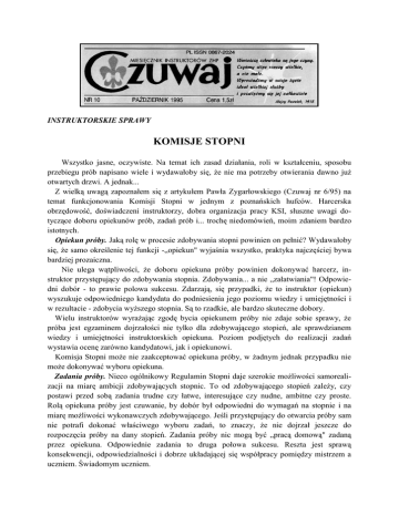 INSTRUKTORSKIE SPRAWY KOMISJE STOPNI Wszystko jasne, oczywiste. Na temat ich zasad działania, roli w kształceniu, sposobu przebiegu prób napisano wiele i wydawałoby się, że nie ma potrzeby otwierania dawno już otwartych drzwi. A jednak... Z wielką uwagą zapoznałem się z artykułem Pawła Zygarłowskiego (Czuwaj nr 6/95) na temat funkcjonowania Komisji Stopni w jednym z poznańskich hufców. Harcerska obrzędowość, doświadczeni instruktorzy, dobra organizacja pracy KSI, słuszne uwagi dotyczące doboru opiekunów prób, zadań prób i... trochę niedomówień, moim zdaniem bardzo istotnych. Opiekun próby. Jaką rolę w procesie zdobywania stopni powinien on pełnić? Wydawałoby się, że samo określenie tej funkcji -„opiekun" wyjaśnia wszystko, praktyka najczęściej bywa bardziej prozaiczna. Nie ulega wątpliwości, że doboru opiekuna próby powinien dokonywać harcerz, instruktor przystępujący do zdobywania stopnia. Zdobywania... a nie „załatwiania"! Odpowiedni dobór - to prawie polowa sukcesu. Zdarzają, się przypadki, że to instruktor (opiekun) wyszukuje odpowiedniego kandydata do podniesienia jego poziomu wiedzy i umiejętności i w rezultacie - zdobycia wyższego stopnia. Są to rzadkie, ale bardzo skuteczne dobory. Wielu instruktorów wyrażając zgodę bycia opiekunem próby nie zdaje sobie sprawy, że próba jest egzaminem dojrzałości nie tylko dla zdobywającego stopień, ale sprawdzianem wiedzy i umiejętności instruktorskich opiekuna. Poziom podjętych do realizacji zadań wystawia ocenę zarówno kandydatowi, jak i opiekunowi. Komisja Stopni może nie zaakceptować opiekuna próby, w żadnym jednak przypadku nie może dokonywać wyboru opiekuna. Zadania próby. Nieco ogólnikowy Regulamin Stopni daje szerokie możliwości samorealizacji na miarę ambicji zdobywających stopnic. To od zdobywającego stopień zależy, czy postawi przed sobą zadania trudne czy łatwe, interesujące czy nudne, ambitne czy proste. Rolą opiekuna próby jest czuwanie, by dobór był odpowiedni do wymagań na stopnie i na miarę możliwości wykonawczych zdobywającego. Jeśli przystępujący do otwarcia próby sam nie potrafi dokonać właściwego wyboru zadań, to znaczy, że nie dojrzał jeszcze do rozpoczęcia próby na dany stopień. Zadania próby nic mogą być „pracą domową" zadaną przez opiekuna. Odpowiednie zadania to druga połowa sukcesu. Reszta jest sprawą konsekwencji, odpowiedzialności i dobrze układającej się współpracy pomiędzy mistrzem a uczniem. Świadomym uczniem. To nie Komisja ma czuwać nad prawidłowym przebiegiem realizacji próby, to zadanie opiekuna. Komisja ma stwierdzić zgodność podjętych zadań z wymaganiami na dany stopień i realizację tychże zadań. Przy dobrym opiekunie moment zamknięcia próby jest już tylko obrzędową harcerską formalnością. W komisji, w której miałem zaszczyt pracować i przez kilka lat jej przewodniczyć, zdarzały się przypadki, że bez przesłuchań, egzaminów, biurokracji, zbędnych pytań i odpowiedzi Komisja jednogłośnie przyznawała stopnie instruktorskie. Z pełną świadomością z poczuciem odpowiedzialności i z przekonaniem, że podjęto słuszną decyzję. Była ona wyrazem uznania nie tylko dla zdobywającego stopień, ale i dla opiekuna próby. Ale na taki autorytet trzeba sobie zasłużyć, druhowie opiekunowie. hm. Stanisław J. Dąbrowski „Czarna Owca", Lublin CZUWAJ nr 10/1995