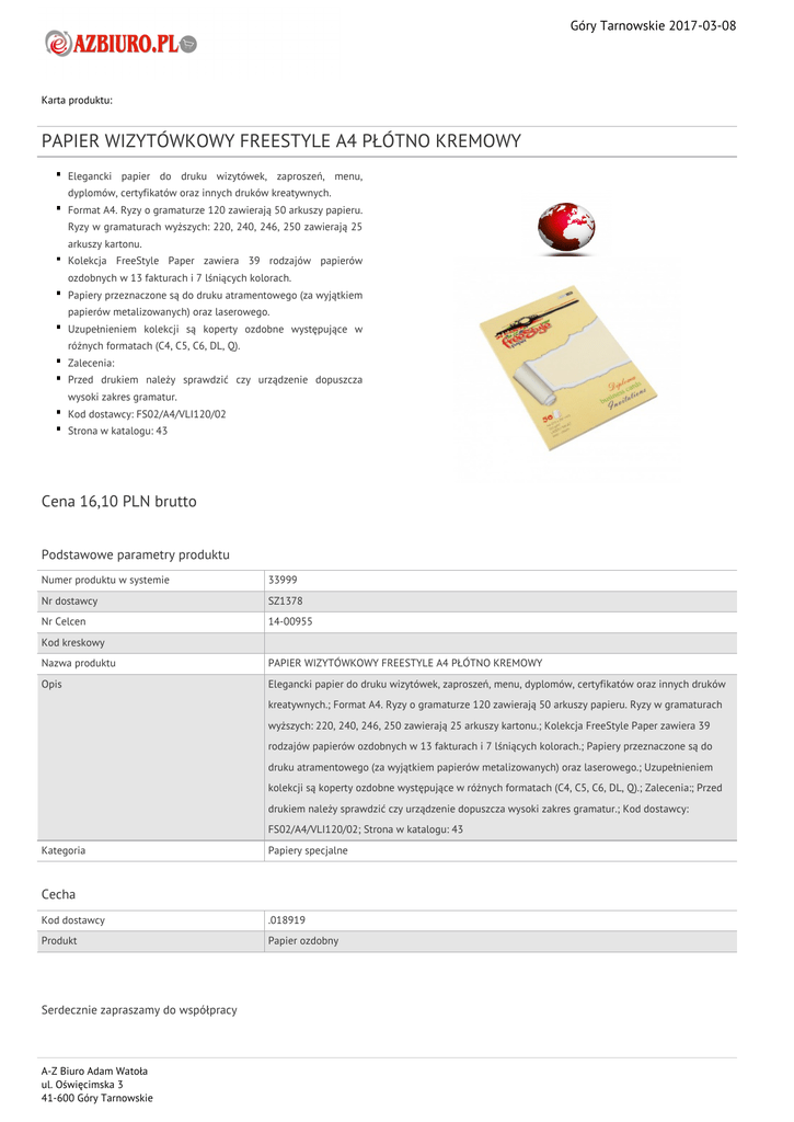 Góry Tarnowskie 2017-03-08 Karta produktu: PAPIER WIZYTÓWKOWY FREESTYLE A4 PŁÓTNO KREMOWY Elegancki papier do druku wizytówek, zaproszeń, menu, dyplomów, certyfikatów oraz innych druków kreatywnych. Format A4. Ryzy o gramaturze 120 zawierają 50 arkuszy papieru. Ryzy w gramaturach wyższych: 220, 240, 246, 250 zawierają 25 arkuszy kartonu. Kolekcja FreeStyle Paper zawiera 39 rodzajów papierów ozdobnych w 13 fakturach i 7 lśniących kolorach. Papiery przeznaczone są do druku atramentowego (za wyjątkiem papierów metalizowanych) oraz laserowego. Uzupełnieniem kolekcji są koperty ozdobne występujące w różnych formatach (C4, C5, C6, DL, Q). Zalecenia: Przed drukiem należy sprawdzić czy urządzenie dopuszcza wysoki zakres gramatur. Kod dostawcy: FS02/A4/VLI120/02 Strona w katalogu: 43 Cena 16,10 PLN brutto Podstawowe parametry produktu Numer produktu w systemie 33999 Nr dostawcy SZ1378 Nr Celcen 14-00955 Kod kreskowy Nazwa produktu PAPIER WIZYTÓWKOWY FREESTYLE A4 PŁÓTNO KREMOWY Opis Elegancki papier do druku wizytówek, zaproszeń, menu, dyplomów, certyfikatów oraz innych druków kreatywnych.; Format A4. Ryzy o gramaturze 120 zawierają 50 arkuszy papieru. Ryzy w gramaturach wyższych: 220, 240, 246, 250 zawierają 25 arkuszy kartonu.; Kolekcja FreeStyle Paper zawiera 39 rodzajów papierów ozdobnych w 13 fakturach i 7 lśniących kolorach.; Papiery przeznaczone są do druku atramentowego (za wyjątkiem papierów metalizowanych) oraz laserowego.; Uzupełnieniem kolekcji są koperty ozdobne występujące w różnych formatach (C4, C5, C6, DL, Q).; Zalecenia:; Przed drukiem należy sprawdzić czy urządzenie dopuszcza wysoki zakres gramatur.; Kod dostawcy: FS02/A4/VLI120/02; Strona w katalogu: 43 Kategoria Papiery specjalne Cecha Kod dostawcy .018919 Produkt Papier ozdobny Serdecznie zapraszamy do współpracy A-Z Biuro Adam Watoła ul. Oświęcimska 3 41-600 Góry Tarnowskie Góry Tarnowskie 2017-03-08 A-Z Biuro Adam Watoła zespół. A-Z Biuro Adam Watoła ul. Oświęcimska 3 41-600 Góry Tarnowskie
