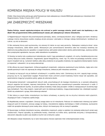 KOMENDA MIEJSKA POLICJI W KALISZU Źródło: http://www.kalisz.policja.gov.pl/wl7/prewencja-1/jak-zabezpieczyc-mieszk/39644,Jak-zabezpieczyc-mieszkane.html Wygenerowano: Środa, 8 marca 2017, 15:47 JAK ZABEZPIECZYĆ MIESZKANE Żadna Policja, nawet najskuteczniejsza nie ochroni w pełni naszego mienia, jeżeli sami nie będziemy o nie dbali! Dla przypomnienia kilka podstawowych zasad, jak zabezpieczyć własne mieszkanie. 1) Najpewniejszym miejscem dla przechowywania pieniędzy, dewiz, cenniejszej biżuterii, akcji i obligacji jest bank. Amatorzy cudzego mienia stosunkowo szybko znajdują ukryte precjoza i pieniądze w różnego rodzaju bieliźniarkach, torebkach po cukrze, czy też za obrazami. 2) Nie zostawiaj kluczy pod wycieraczką, nie wieszaj ich także na szyi swej pociechy. Zabezpiecz należycie drzwi i okna swojego mieszkania, załóż dobre zamki. Wskazanym jest zamontowanie domofonu albo też instalacji świetlnej lub elektronicznej podłączonej do sąsiadów (z wzajemnością). Jeśli jesteś właścicielem domku jednorodzinnego, wykonaj solidne (lecz przejrzyste) ogrodzenie, kup psa, załóż oświetlenie na podwórku. 3) Zanotuj na kartce lub w podręcznym kalendarzyku marki i typy posiadanych urządzeń, ich cechy charakterystyczne oraz numery fabryczne (radio, telewizor, magnetowid, aparat fotograficzny, rower, itp.) Te, które nie posiadają numerów, oznacz swymi inicjałami lub np. numerem telefonu albo datą urodzenia (w przypadku kradzieży lub zagubienia łatwiej będzie można je rozpoznać i udowodnić, że są naszą własnością). 4) Nie afiszuj się swym bogactwem. Unikaj przygodnych znajomości, zwłaszcza zawieranych przy kieliszku, nigdy zaś w ten sposób poznanych ludzi nie zapraszaj do swego mieszkania, zwłaszcza jeśli mieszkasz samotnie. 5) Uważaj na kręcących się po klatkach schodowych i w pobliżu domu ludzi. Zainteresuj się nimi, zapytaj kogo szukają, przyjrzyj się im, by zapamiętać wygląd. Przezorność może uchronić przed kradzieżą mienie twoje lub sąsiadów, zaś spostrzeżenia mogą być przydatne policji, gdyby do włamania doszło. 6) Sprawdzaj tożsamość i wiarygodność obcych osób, przychodzących do twojego mieszkania np. w sprawie odkupienia starych zegarów lub książek, naprawy kaloryferów. Nie wpuszczaj bez uzasadnionych powodów nieznanych ci osób. Z policyjnych doświadczeń wynika, że prawie połowa kradzieży miała swój początek i źródło w nawiązywanych wcześniej tego typu kontaktach. Tacy niby-znajomi, nawet jeśli sami nie dokonują kradzieży, mogą przeprowadzać tzw. złodziejski wywiad i dzielić się ustaleniami z grupą, która dokonuje włamań. 7) Nie toleruj w swym bloku mieszkalnym (na klatce schodowej, w piwnicy lub na strychu) istnienia melin pijackich, skupiających ludzi z marginesu społecznego. 8) Współdziałaj zawsze z sąsiadami. Zwracaj uwagę także na ich mieszkanie. Podczas ich nieobecności interesuj się ludźmi stojącymi pod ich drzwiami, zwracaj uwagę na hałasy, niecodzienne odgłosy dochodzące z klatki schodowej, wynoszenie mebli lub sprzętów domowych przez osoby obce, którym nie towarzyszy nikt ze znanych sąsiadów. 9) Opuszczając na dłużej mieszkanie (wczasy, odwiedziny znajomych, pobyt w szpitalu) nie zostawiaj widocznych oznak swej nieobecności. Poproś sąsiadkę, by podlewała kwiaty, otwierała na krótko okna, opróżniała skrzynkę z korespondencji, wieczorem włączała na jakiś czas światło w kuchni lub w którymś z pokoi. 10) Ubezpiecz swoje mieszkanie, by w razie nieszczęścia chociaż częściowo mieć zrekompensowane straty. Ocena: 0/5 (0) Tweetnij