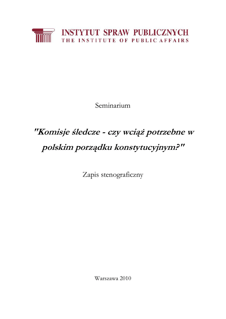 Seminarium "Komisje śledcze - czy wciąż potrzebne w polskim porządku konstytucyjnym?" Zapis stenograficzny Warszawa 2010 "KOMISJE ŚLEDCZE - CZY WCIĄŻ POTRZEBNE W POLSKIM PORZĄDKU KONSTYTUCYJNYM?"”, SEMINARIUM, WARSZAWA 29 WRZEŚNIA 2010 Instytut Spraw Publicznych Program Prawa i Instytucji Demokratycznych Seminarium odbyło się w Sali Konferencyjnej Instytutu Spraw Publicznych w Warszawie dnia 29 września 2010 roku w ramach projektu „Ankieta konstytucyjna” finansowanego przez Trust for Civil Society in Central and Eastern Europe Poniższe wypowiedzi są nieautoryzowane. Redakcja i opracowanie: Instytut Spraw Publicznych 2 "KOMISJE ŚLEDCZE - CZY WCIĄŻ POTRZEBNE W POLSKIM PORZĄDKU KONSTYTUCYJNYM?"”, SEMINARIUM, WARSZAWA 29 WRZEŚNIA 2010 dr Jacek Kucharczyk (Instytut Spraw Publicznych): Szanowni Państwo, chciałbym Państwa serdecznie powitać w imieniu Instytutu Spraw Publicznych na seminarium poświęconym miejscu i potrzebie komisji śledczych w polskim porządku konstytucyjnym. Jest to pierwsze z cyklu seminariów i innych prac Instytutu poświęconych właśnie zagadnieniu konstytucji, debacie konstytucyjnej, która teraz znowu od pewnego czasu toczy się w Polsce z pewną siłą. Ja powiem tylko, że cieszę się, że tematyka konstytucyjna wróciła do Instytutu. Część z Państwa może jeszcze pamięta, że – szczególnie jeszcze w latach dziewięćdziesiątych Instytut był takim miejscem, gdzie dużo na tematy konstytucji dyskutowaliśmy, były seminaria, działało Centrum Konstytucjonalizmu i Kultury Prawnej. Cieszę się więc, że w tej chwili, może w mniejszym wymiarze, ale możemy wrócić do tej debaty. Działamy w ramach projektu sfinansowanego w ramach Trust For Civil Society in Central and Eastern Europe. Więcej na temat tego projektu i prac Instytutu powie doktor Jarosław Zbieranek, który jest szefem programu Prawa i Instytucji Demokratycznych. Chciałbym jeszcze tylko podziękować Panu Profesorowi Bogusławowi Banaszakowi za to, że zgodził się pokierować naszym projektem konstytucyjnym. I oddaję głos Jarkowi Zbierankowi. dr Jarosław Zbieranek (Instytut Spraw Publicznych): Dziękuję bardzo. Szanowni Państwo, tak jak Pan Doktor wspomniał realizujemy projekt poświęcony problematyce ustrojowej, problematyce konstytucyjnej. Oprócz takich spotkań jak dziś, spotkań seminaryjnych, planujemy w lutym opublikować książkę, która byłaby zbiorem opinii - ankiet konstytucyjnych. Książkę, która będzie zbiorem różnych spojrzeń na kwestię konstytucyjną, na potencjalna potrzebę zmian i ich zakres. Bardzo serdecznie zapraszam do odwiedzania naszej strony internetowej. Wszelkie nowości związane z projektem będą tam umieszczane. Kolejne seminarium planujemy zorganizować w listopadzie i oczywiście będziemy na ten temat Państwa informować. Ja tylko dodam, że bardzo się cieszę, nawiązując do tych tradycji, że Instytut zajął się kwestiami konstytucyjnymi, które mi osobiście są bardzo bliskie. Dziękuje Panu Profesorowi, który jest kierownikiem projektu. Co do dzisiejszego spotkania, szanowni Państwo, przyjęliśmy konwencję dyskusji. Jest to spotkanie bez sformalizowanej konwencji. Po wprowadzeniu Pana Profesora zapraszam bardzo serdecznie do zabierania głosu. Bardzo liczymy na aktywną dyskusję. Z dzisiejszego seminarium przygotujemy sprawozdanie, którego zapis znajdzie się również na naszej stronie internetowej Instytutu, a materiały zostaną włączone do materiałów końcowych projektu, który tak jak wspomniałem zakończy się wiosną przyszłego roku. Po seminarium zapraszamy na poczęstunek, tak, aby nie wypuścić Państwa głodnymi od nas. Także dziękuje bardzo, jeszcze raz dziękuje Panu Profesorowi za to, że kieruje projektem i przyjął zaproszenie na dzisiejsze seminarium. Niniejszym przekazuję głos. 3 "KOMISJE ŚLEDCZE - CZY WCIĄŻ POTRZEBNE W POLSKIM PORZĄDKU KONSTYTUCYJNYM?"”, SEMINARIUM, WARSZAWA 29 WRZEŚNIA 2010 prof. Bogusław Banaszak (Uniwersytet Wrocławski): Panie Prezesie, Szanowni Państwo przypadł mi w udziale zaszczyt zainaugurowania tych trzech seminariów i kierowania całym projektem, także muszę powiedzieć, że ta inicjatywa Instytutu Spraw Publicznych wpisała się chyba w tok dyskusji, która jest obecnie nad zmianą konstytucji. Dyskusji, która jest prowadzona z bardzo różnym natężeniem, właściwie od chwili, na dobra sprawę, uchwalenia dzisiejszej konstytucji, a gdybyśmy chcieli wziąć tak wszystko pod uwagę to w zasadzie od 1989 roku ciągle dyskutujemy, jaka powinna być polska konstytucja. Bo najpierw uchwaliliśmy jedną, a potem zastanawialiśmy się nad zmianami do tej, która została uchwalona, która jest dobrze uchwalona. Tematem naszego dzisiejszego spotkania jest komisja śledcza. Może nie bez kozery, dlatego że ona przyciąga uwagę publiczną, a jest instytucją nową. W polskim prawie istniała ona w okresie międzywojennym, nawet w okresie drugiej wojny światowej, na emigracji powołano taką komisję – nazwijmy ją śledczą – do zbadania kwestii odpowiedzialności za klęskę wrześniową. Ale na dobrą sprawę ta komisja, kiedy zaczęła naprawdę działać, to wszyscy mamy w pamięci tak zwaną komisję rywinowską i można powiedzieć, że to do niej odnosimy się jak do jakiegoś wzorca, do niej się odwołujemy i badamy, czy następna komisja to będzie taka jak ta rywinowska. Z drugiej strony, jeśli Państwo pamiętacie, to ta komisja rywinowska miała określone następstwa dla całego funkcjonowania życia politycznego. Akurat nie mówię tutaj o następstwach prawnych, bo sprawozdanie, czy raport z tej komisji zostało przyjęte i to jedno z wielu, całkowicie przypadkowo. Jeśli Państwo pamiętacie, to w zasadzie to, co przyjął Sejm, to na pewno nie było zdanie większości, a zostało przyjęte, jako zdanie większości całkowicie przez przypadek. Długo się zastanawiałem, w jaki sposób zagaić 