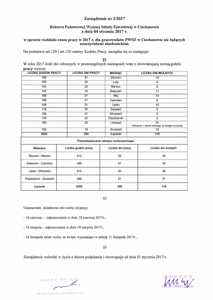 Zarządzenie nr 2/2017 Rektora Państwowej Wyższej Szkoły Zawodowej w Ciechanowie z dnia 04 stycznia 2017 r. w sprawie rozkładu czasu pracy w 2017 r. dla pracowników PWSZ w Ciechanowie nie będących nauczycielami akademickimi. Na podstawie art.129 i art.130 ustawy Kodeks Pracy zarządza się co następuje: §1 W roku 2017 ilość dni roboczych w poszczególnych miesiącach wraz z obowiązującą normą godzin pracy wynosi: LICZBA GODZIN PRACY LICZBA DNI PRACY MIESIĄC LICZBA DNI WOLNYCH 168 160 184 152 168 168 168 176 168 176 160 21 20 23 19 21 21 21 22 21 22 20 Styczeń 10 8 8 11 10 9 10 9 9 9 10 152 19 2000 Luty Marzec Kwiecień Maj Czerwiec Lipiec Sierpień Wrzesień Październik Listopad *wliczono 1 dzień wolnego za święto w sobotę Grudzień Łącznie 250 12 115 Trzvmiesieczne okresv rozliczeniowe Miesiące Liczba godzin pracy Liczba dni pracy Liczba dni wolnych Styczeń - Marzec 512 64 26 Kwiecień - Czerwiec 488 61 30 Lipiec - Wrzesień 512 64 28 Październik - Grudzień 488 61 31 Łącznie 2000 250 115 §2 Ustanawiam dodatkowe dni wolne od pracy: - 16 czerwca - odpracowanie w dniu I O czerwca 2017r., - 14 sierpnia - odpracowanie w dniu 19 sierpnia 20 I 7r., - I O listopada dzień wolny za święto wypadające w sobotę 11 listopada 2017r. , §3 Zarządzenie wchodzi w życie z dniem podpisania i obowiązuje od dnia 01 stycznia 2017 r. �TOR doc. dr l,i:;sze,�-