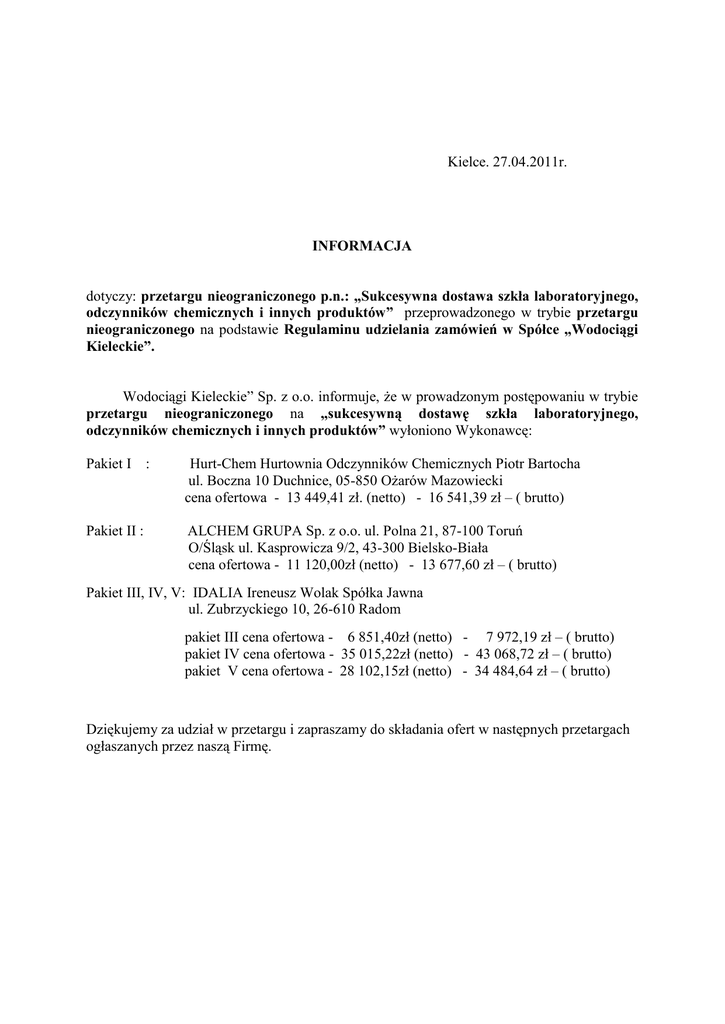 Kielce. 27.04.2011r. INFORMACJA dotyczy: przetargu nieograniczonego p.n.: „Sukcesywna dostawa szkła laboratoryjnego, odczynników chemicznych i innych produktów” przeprowadzonego w trybie przetargu nieograniczonego na podstawie Regulaminu udzielania zamówień w Spółce „Wodociągi Kieleckie”. Wodociągi Kieleckie” Sp. z o.o. informuje, że w prowadzonym postępowaniu w trybie przetargu nieograniczonego na „sukcesywną dostawę szkła laboratoryjnego, odczynników chemicznych i innych produktów” wyłoniono Wykonawcę: Pakiet I : Hurt-Chem Hurtownia Odczynników Chemicznych Piotr Bartocha ul. Boczna 10 Duchnice, 05-850 Ożarów Mazowiecki cena ofertowa - 13 449,41 zł. (netto) - 16 541,39 zł – ( brutto) Pakiet II : ALCHEM GRUPA Sp. z o.o. ul. Polna 21, 87-100 Toruń O/Śląsk ul. Kasprowicza 9/2, 43-300 Bielsko-Biała cena ofertowa - 11 120,00zł (netto) - 13 677,60 zł – ( brutto) Pakiet III, IV, V: IDALIA Ireneusz Wolak Spółka Jawna ul. Zubrzyckiego 10, 26-610 Radom pakiet III cena ofertowa - 6 851,40zł (netto) - 7 972,19 zł – ( brutto) pakiet IV cena ofertowa - 35 015,22zł (netto) - 43 068,72 zł – ( brutto) pakiet V cena ofertowa - 28 102,15zł (netto) - 34 484,64 zł – ( brutto) Dziękujemy za udział w przetargu i zapraszamy do składania ofert w następnych przetargach ogłaszanych przez naszą Firmę.